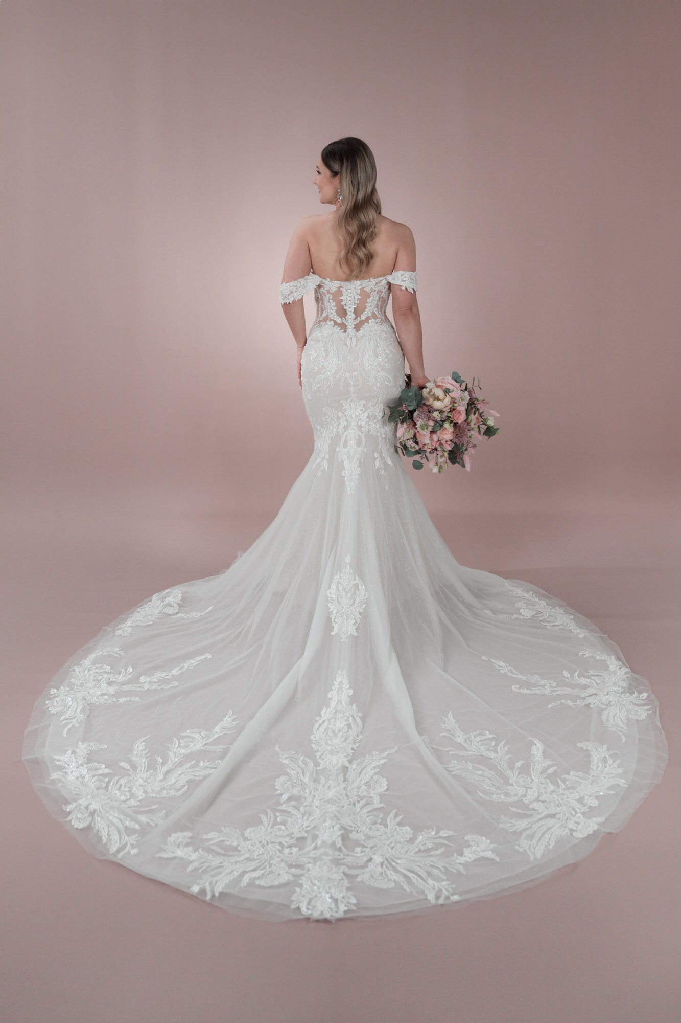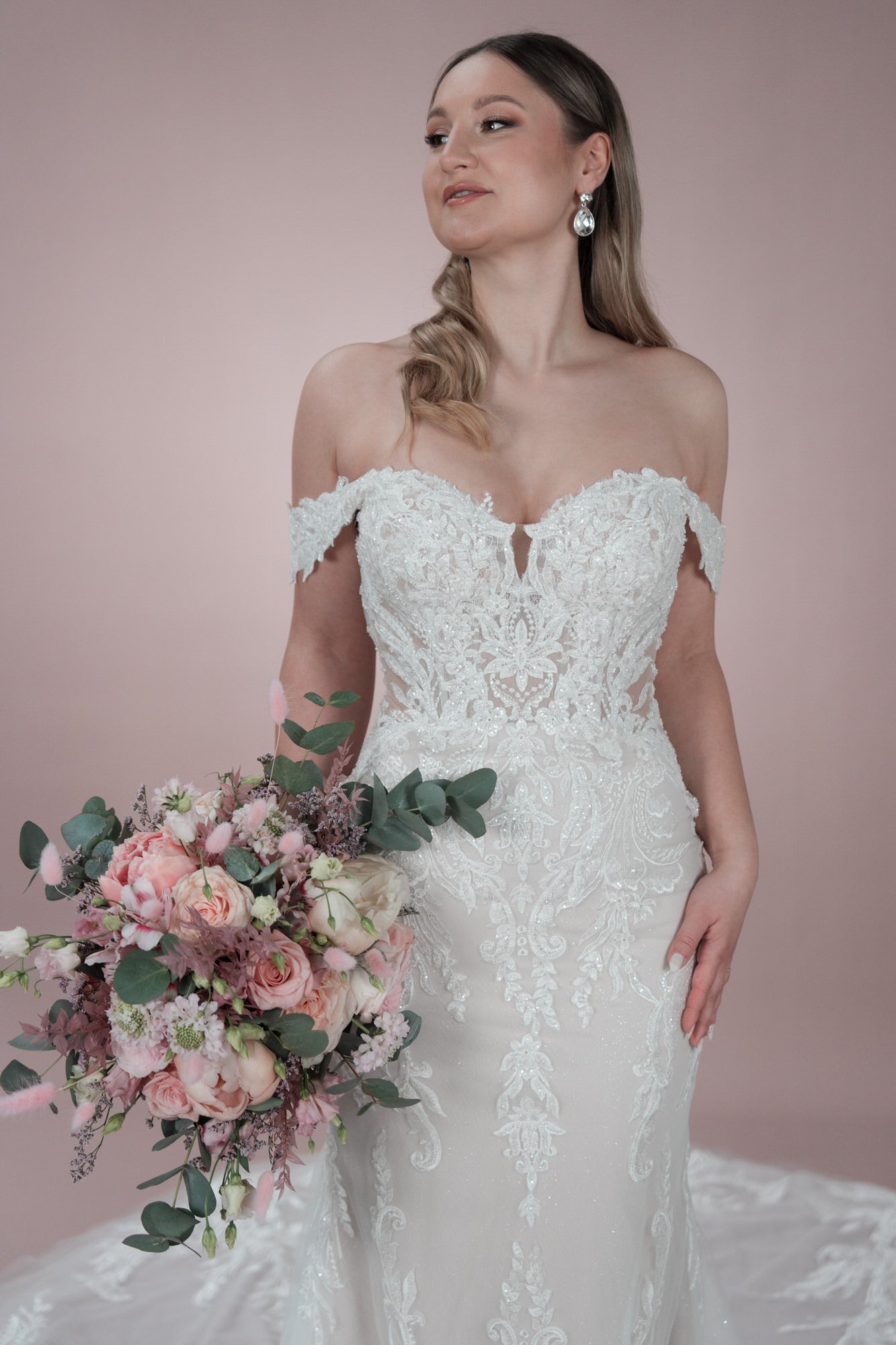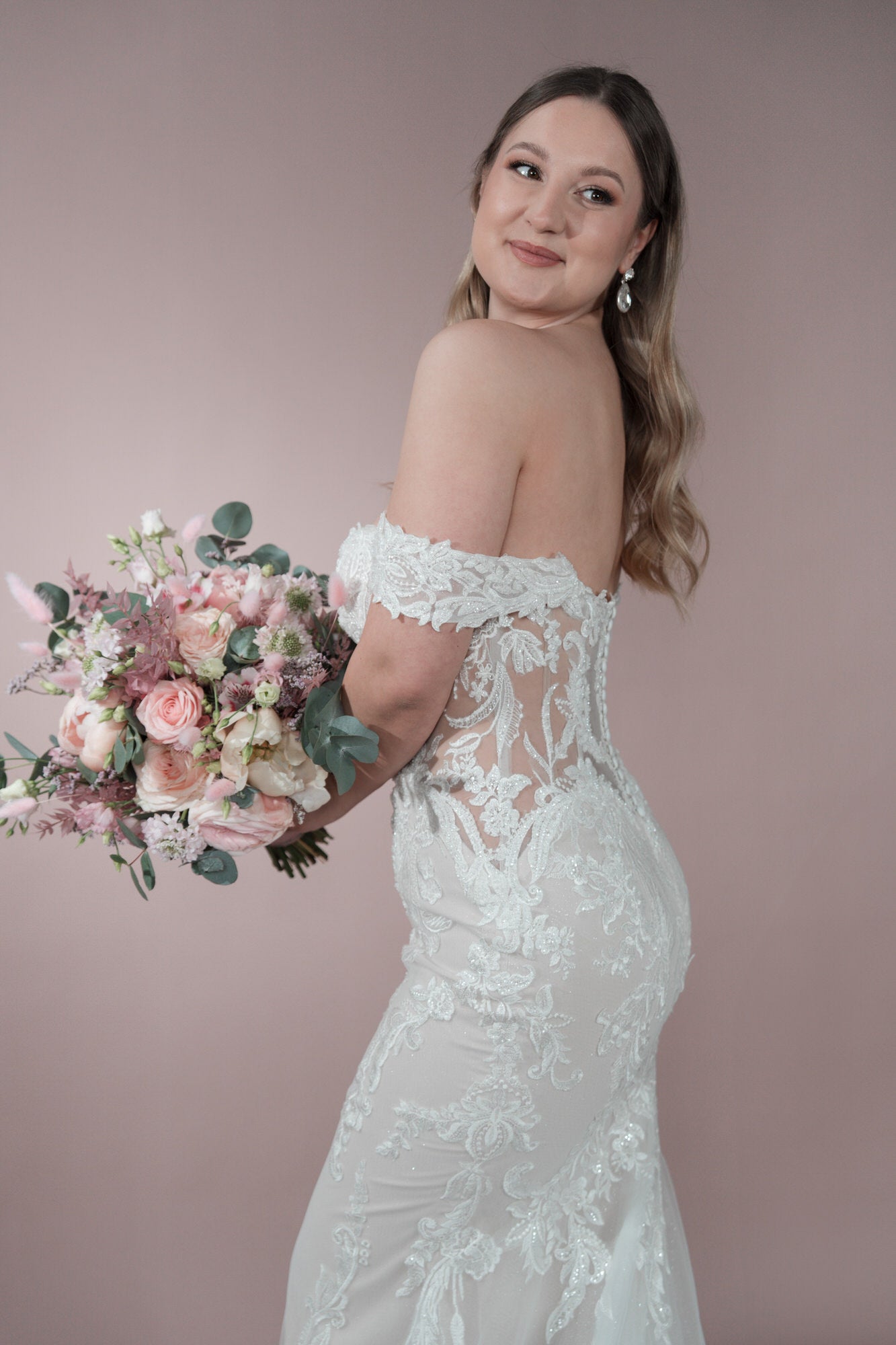 Hey Fashionista, wir haben dein Traum-Hochzeitskleid: C23-12. Dieser figurbetonte Fit-and-Flare-Schnitt wurde für die modebewusste Braut mit einer Vorliebe für Romantik und einem feinen Sinn für Stil entworfen. Der klassische Herzchen-Ausschnitt wird von Trägern eingerahmt, die über die Schultern hängen und eine romantisch-feminine Silhouette lenken. Die Träger sind abnehmbar, so dass du deinen Braut-Look mit wenigen Handgriffen verändern kannst. In jedem Blickwinkel funkelt ein Mix aus feinen Perlen, schimmernden Pailletten und Kristallen, die sich um die sexy Fit-and-Flare-Silhouette wickeln und für einen glamourösen Blickfang sorgen. Markenzeichen dieser Kollektion sind die modernen Einflüsse des Lingerie-Looks, so ist die Corsage halbtransparent geschnitten und betont die Schönheit und Weiblichkeit der Frau. Für den perfekten Sitz verfügt dieses Bridonista-Design außerdem über eine starke Corsage und Push-up-Cups, damit du dich an deinem großen Tag selbstbewusst und wunderschön fühlen kannst. Die tiefen seitlichen Ausschnitte, der durchsichtige Rücken und die Illusionsspitze sind ebenfalls Lingerie-Merkmale, die diesem Hochzeitskleid einen sexyness Touch von Blumen auf nackter Haut verleihen. Bridonista ist eine detailverliebte Designerin, die ihre Bräute gerne überrascht; so bildet die Illusionsspitze im Rücken ein Herz, das erst auf den zweiten Blick sichtbar ist. Die formvollendete Komposition aus Spitzenapplikationen und Glitzertüll verläuft über den Rock bis in die Schleppe.