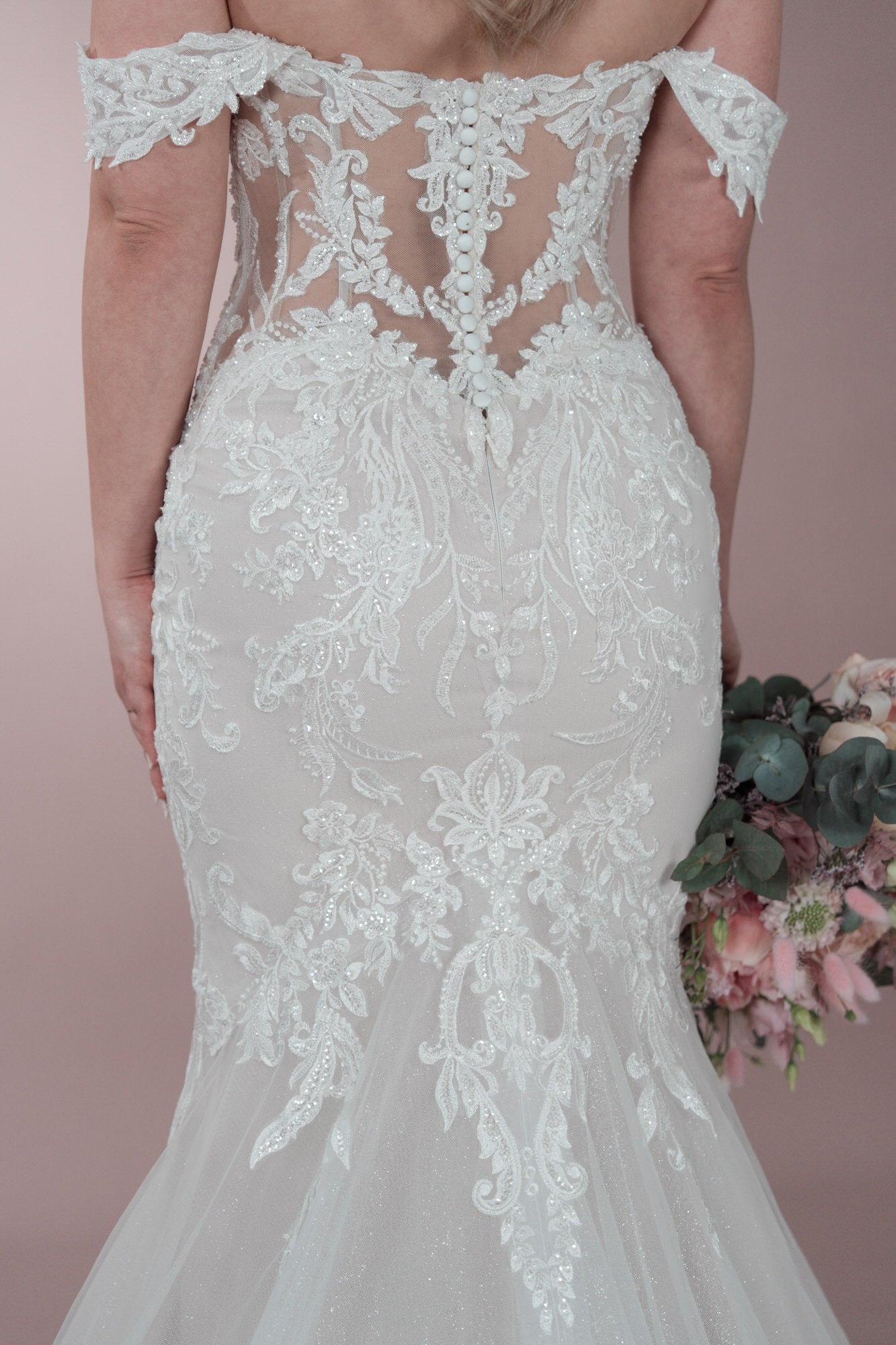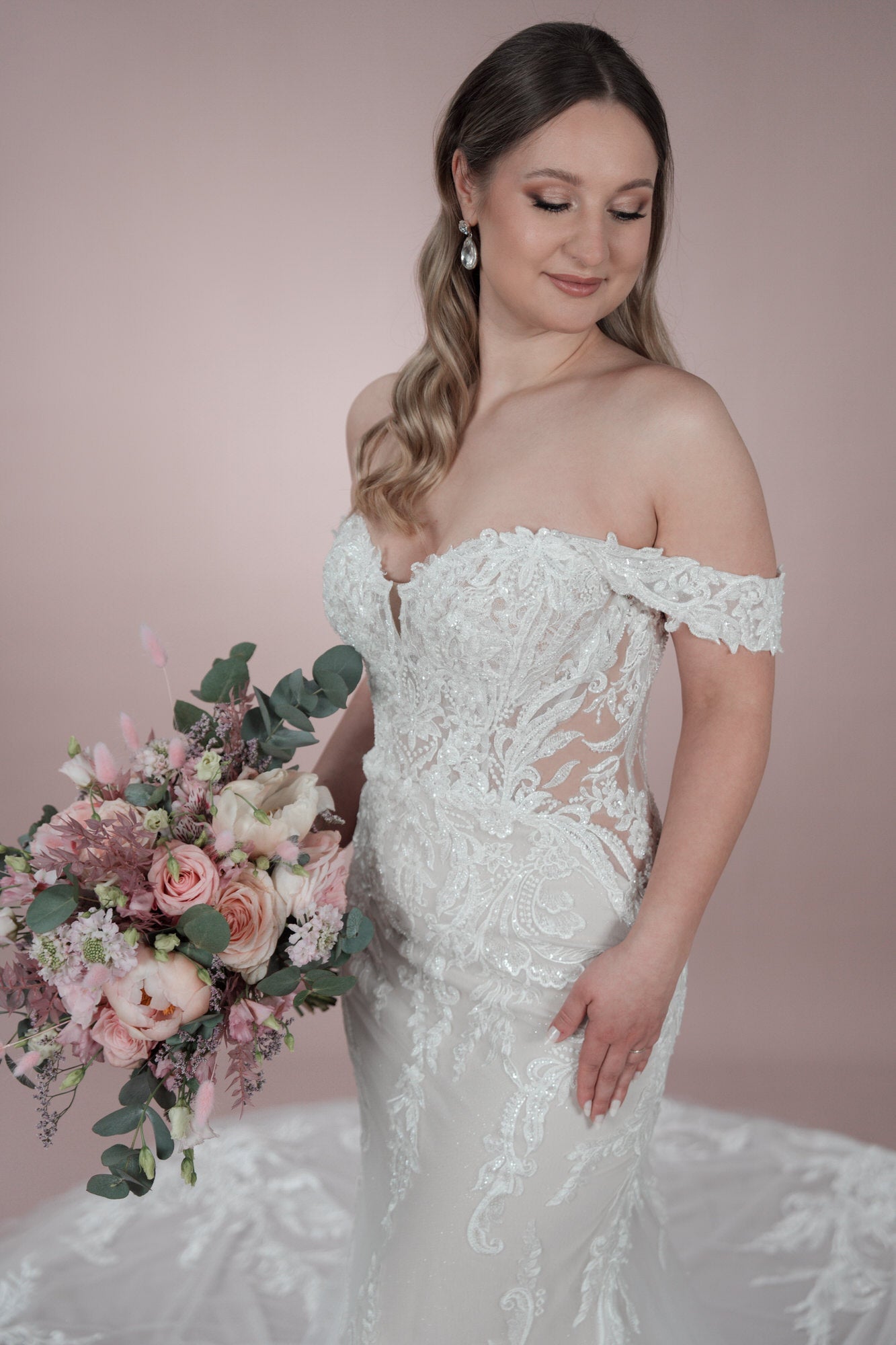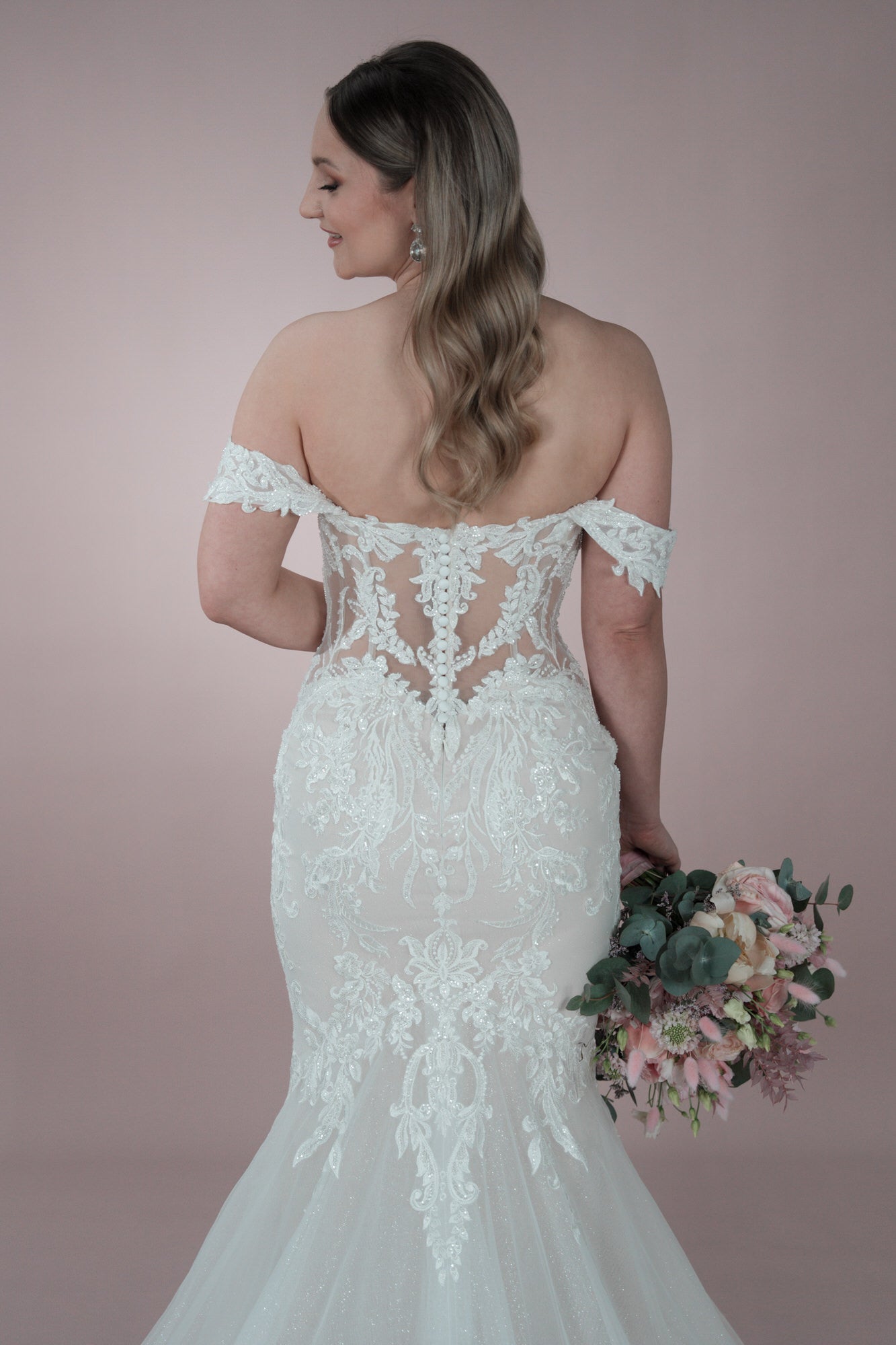Hey Fashionista, wir haben dein Traum-Hochzeitskleid: C23-12. Dieser figurbetonte Fit-and-Flare-Schnitt wurde für die modebewusste Braut mit einer Vorliebe für Romantik und einem feinen Sinn für Stil entworfen. Der klassische Herzchen-Ausschnitt wird von Trägern eingerahmt, die über die Schultern hängen und eine romantisch-feminine Silhouette lenken. Die Träger sind abnehmbar, so dass du deinen Braut-Look mit wenigen Handgriffen verändern kannst. In jedem Blickwinkel funkelt ein Mix aus feinen Perlen, schimmernden Pailletten und Kristallen, die sich um die sexy Fit-and-Flare-Silhouette wickeln und für einen glamourösen Blickfang sorgen. Markenzeichen dieser Kollektion sind die modernen Einflüsse des Lingerie-Looks, so ist die Corsage halbtransparent geschnitten und betont die Schönheit und Weiblichkeit der Frau. Für den perfekten Sitz verfügt dieses Bridonista-Design außerdem über eine starke Corsage und Push-up-Cups, damit du dich an deinem großen Tag selbstbewusst und wunderschön fühlen kannst. Die tiefen seitlichen Ausschnitte, der durchsichtige Rücken und die Illusionsspitze sind ebenfalls Lingerie-Merkmale, die diesem Hochzeitskleid einen sexyness Touch von Blumen auf nackter Haut verleihen. Bridonista ist eine detailverliebte Designerin, die ihre Bräute gerne überrascht; so bildet die Illusionsspitze im Rücken ein Herz, das erst auf den zweiten Blick sichtbar ist. Die formvollendete Komposition aus Spitzenapplikationen und Glitzertüll verläuft über den Rock bis in die Schleppe.