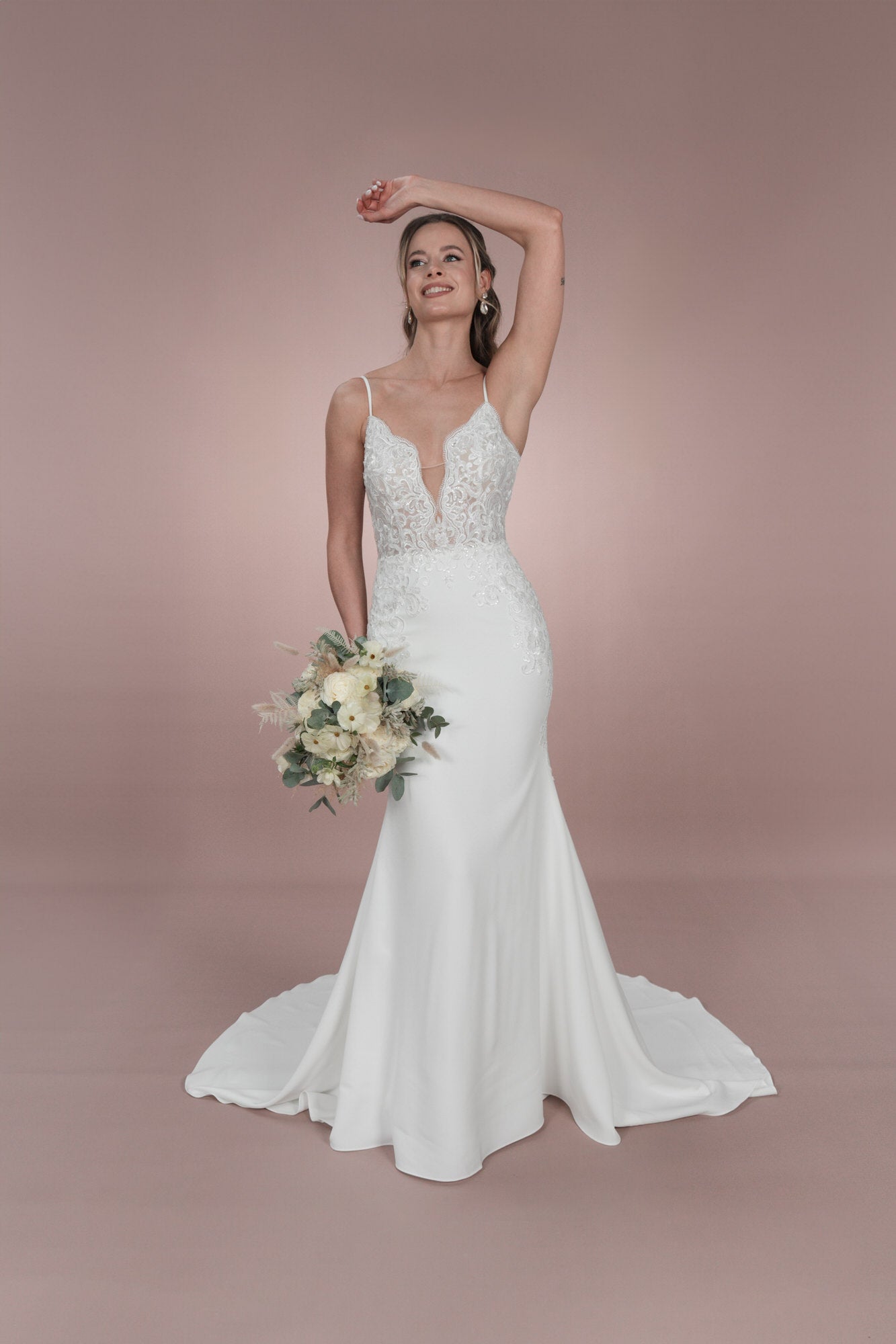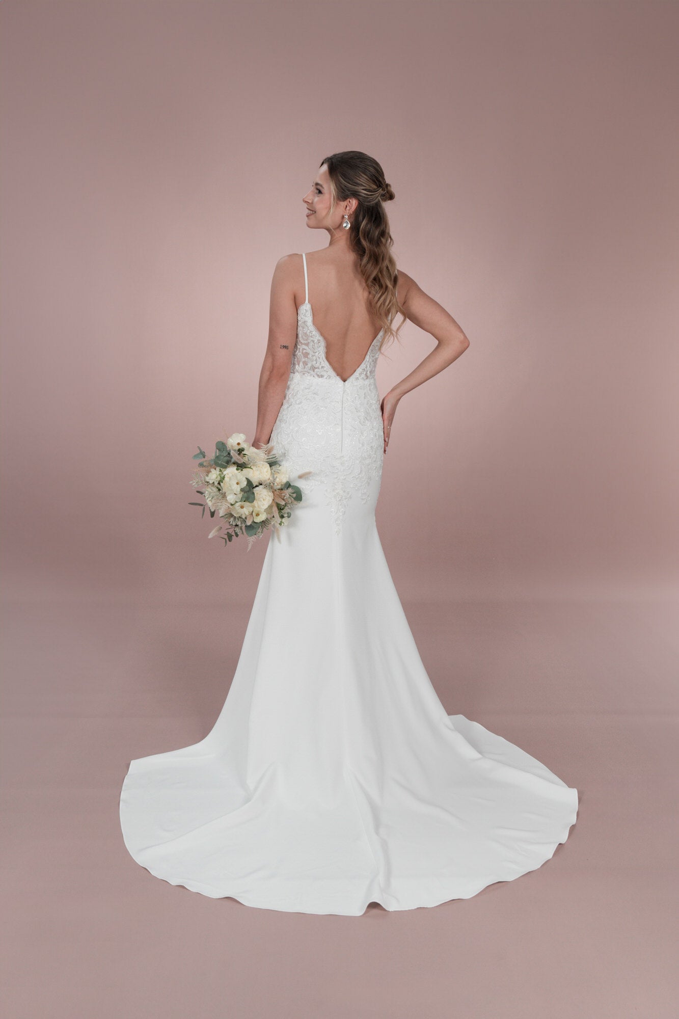 Du suchst ein Hochzeitskleid in Flare-Form für deine standesamtliche Trauung und sehnst dich nach einer aufregenden Corsage kombiniert mit einem schlichten Rock? Dann solltest du C23-17 aus der Bridonista Classic Collection genauer unter die Lupe nehmen, einen Beratungstermin bei einem Partnerhändler vereinbaren und dich unsterblich verlieben. Die florale Spitze verläuft muschelförmig über die Corsage in den Rock und ist mit einer Wimpernborte versehen, die auf den V-Ausschnitt zeigt. Im Gegensatz zu den Spaghetti-Trägern aus mattem Satin ist die Spitze mit feinen Pailletten handbestickt. Passend zum tiefen V-Ausschnitt auf der Vorderseite ist auch der hintere Ausschnitt V-förmig gestaltet. Für den perfekten Sitz verfügt dieses Bridonista-Design außerdem über eine Corsage und Push-up-Cups, damit du dich an deinem großen Tag selbstbewusst und wunderschön fühlen kannst. Die kurze Schleppe ist unkompliziert und pflegeleicht, verleiht dir aber trotzdem einen Hauch von Brautgefühl.