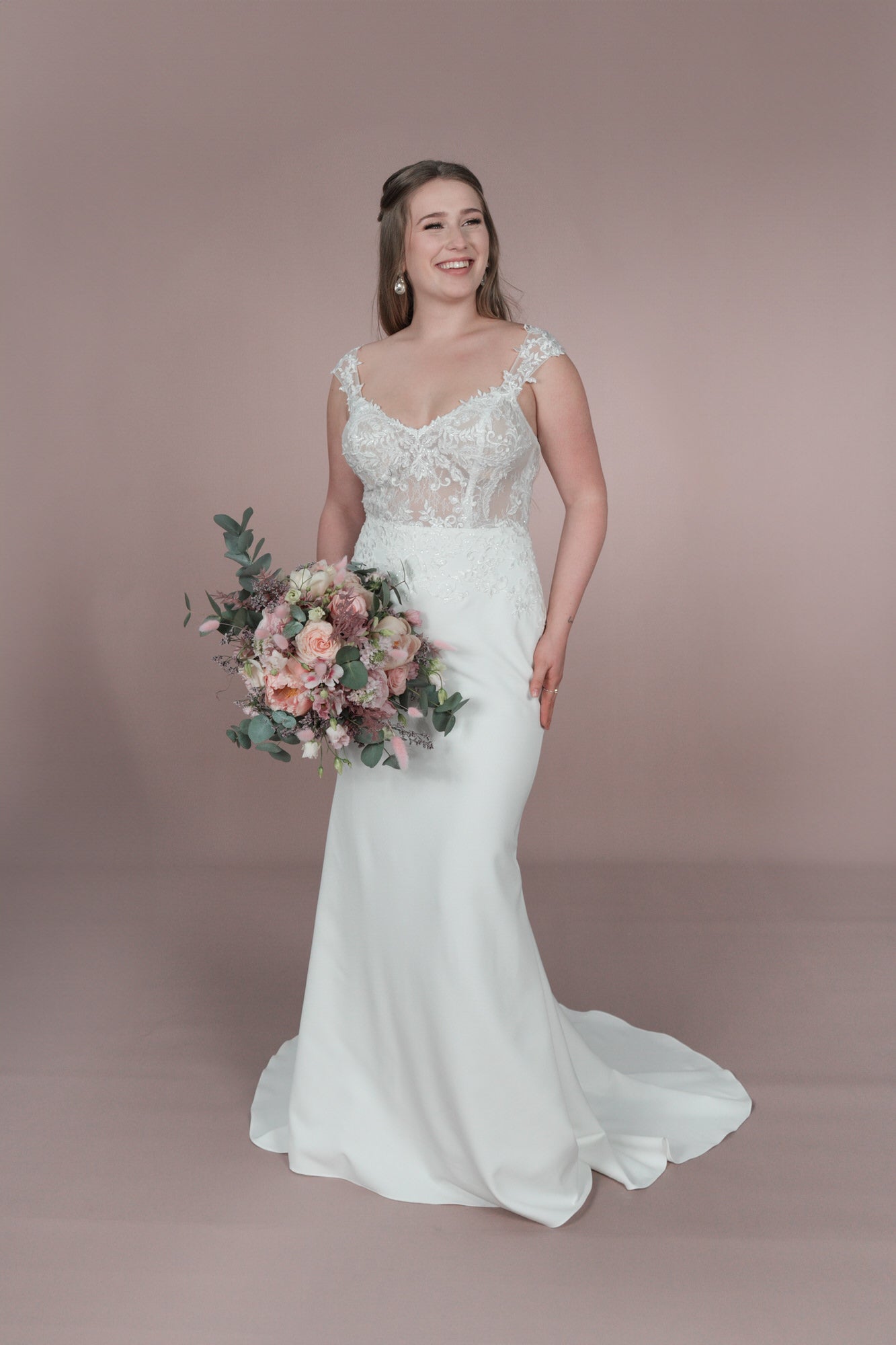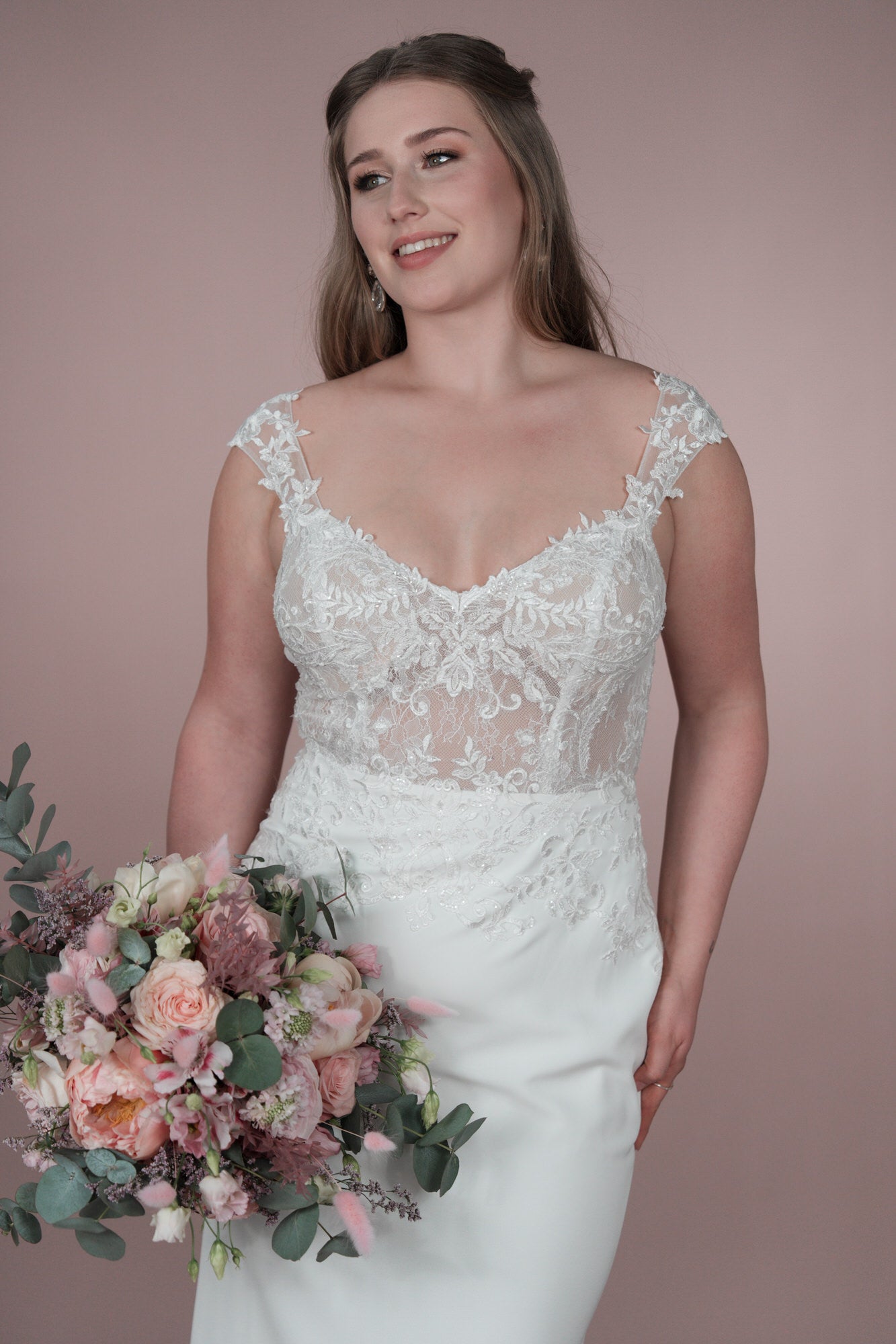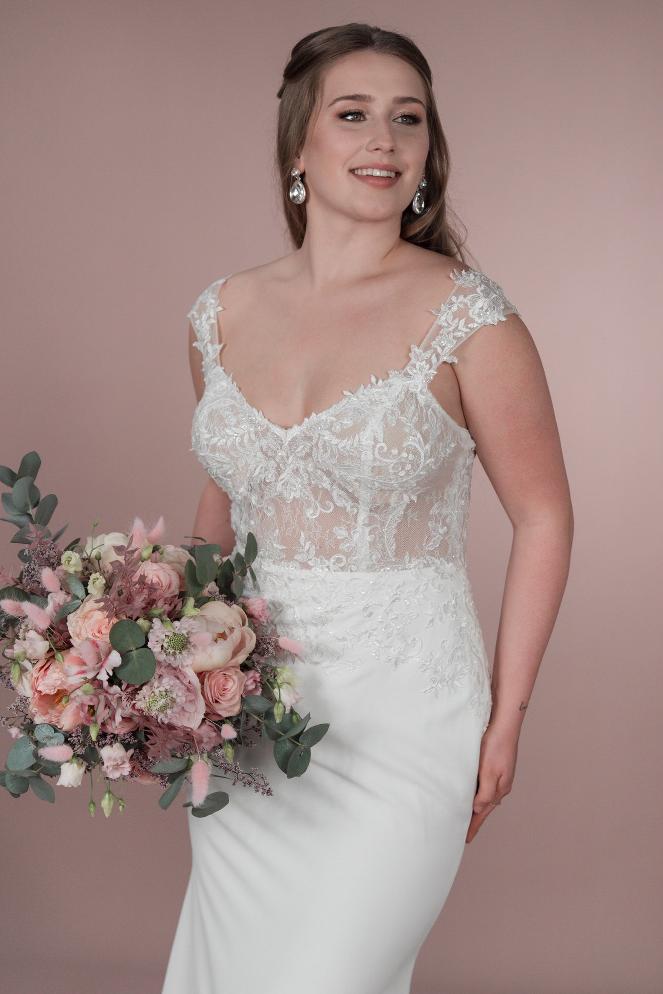 Bridonista C23-18 begeistert mit Charme und einer außergewöhnlichen Passform. Der Herzchenausschnitt mit angeschnittenen Trägern verleiht diesem Fit-und-Flare Brautkleid eine edle Note. Wir lieben die Komposition aus feiner französischer Chantilly Spitze und klassischer Brautspitze. Die semitransparente Korsage ist geprägt durch den modernen Lingerie Look und setzt die Kurven der Frau gekonnt in Szene. Für den perfekten Fit ist auch dieses Bridonista Design mit einer Korsage und Push-Up-Cups ausgestattet, so kannst du dich an deinem großen Tag sicher und wunderschön fühlen. Die kurze Schleppe ist unkompliziert und pflegeleicht, gibt dir aber dennoch Braut-Vibes.
