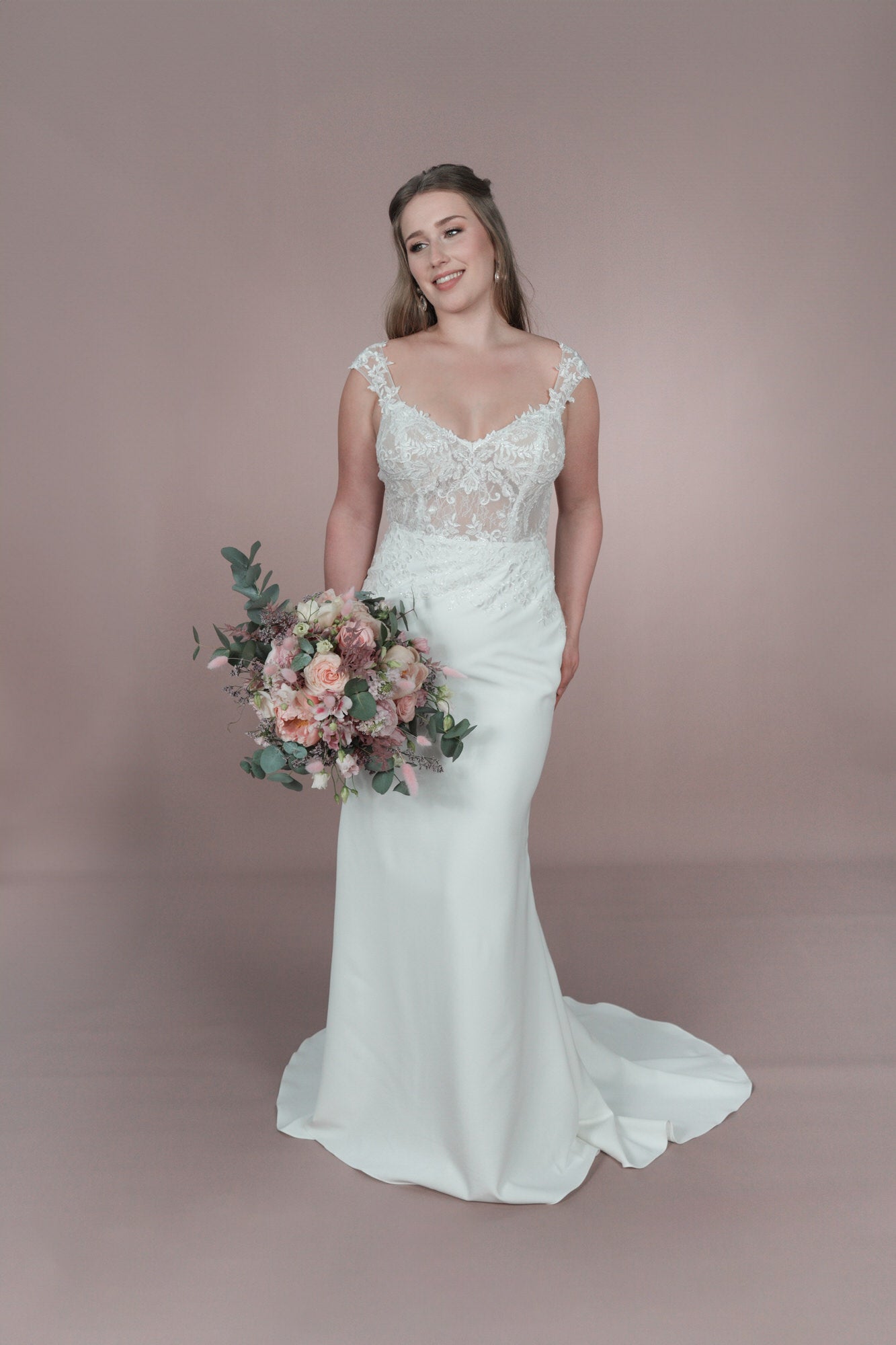 Dieses Hochzeitskleid ist mit haut-/ oder elfenbeinfarbenen Tüll in der Korsage erhältlich, der Rock ist in elfenbeinfarbenen Crêpe und Futterstoff gefertigt.