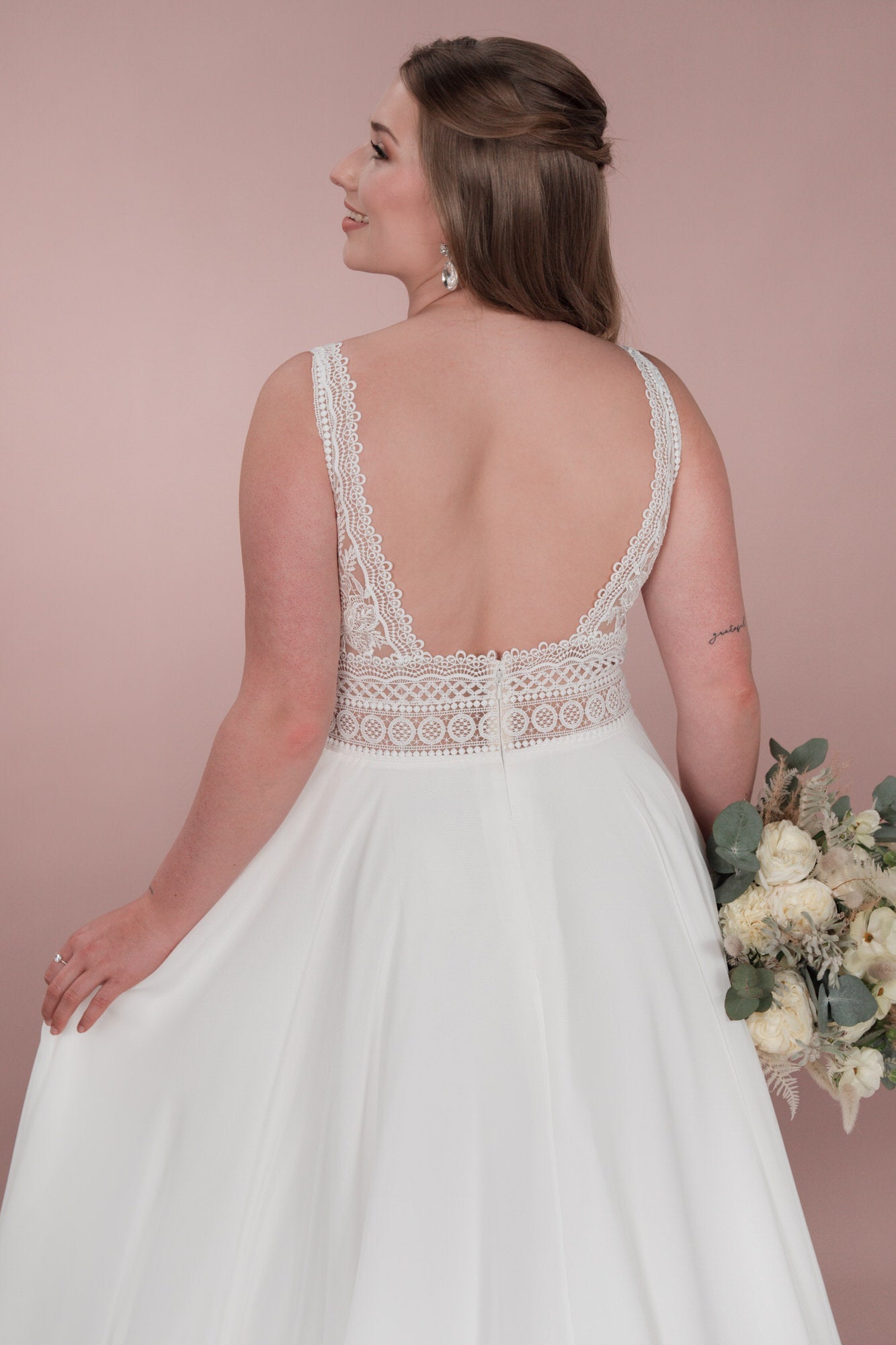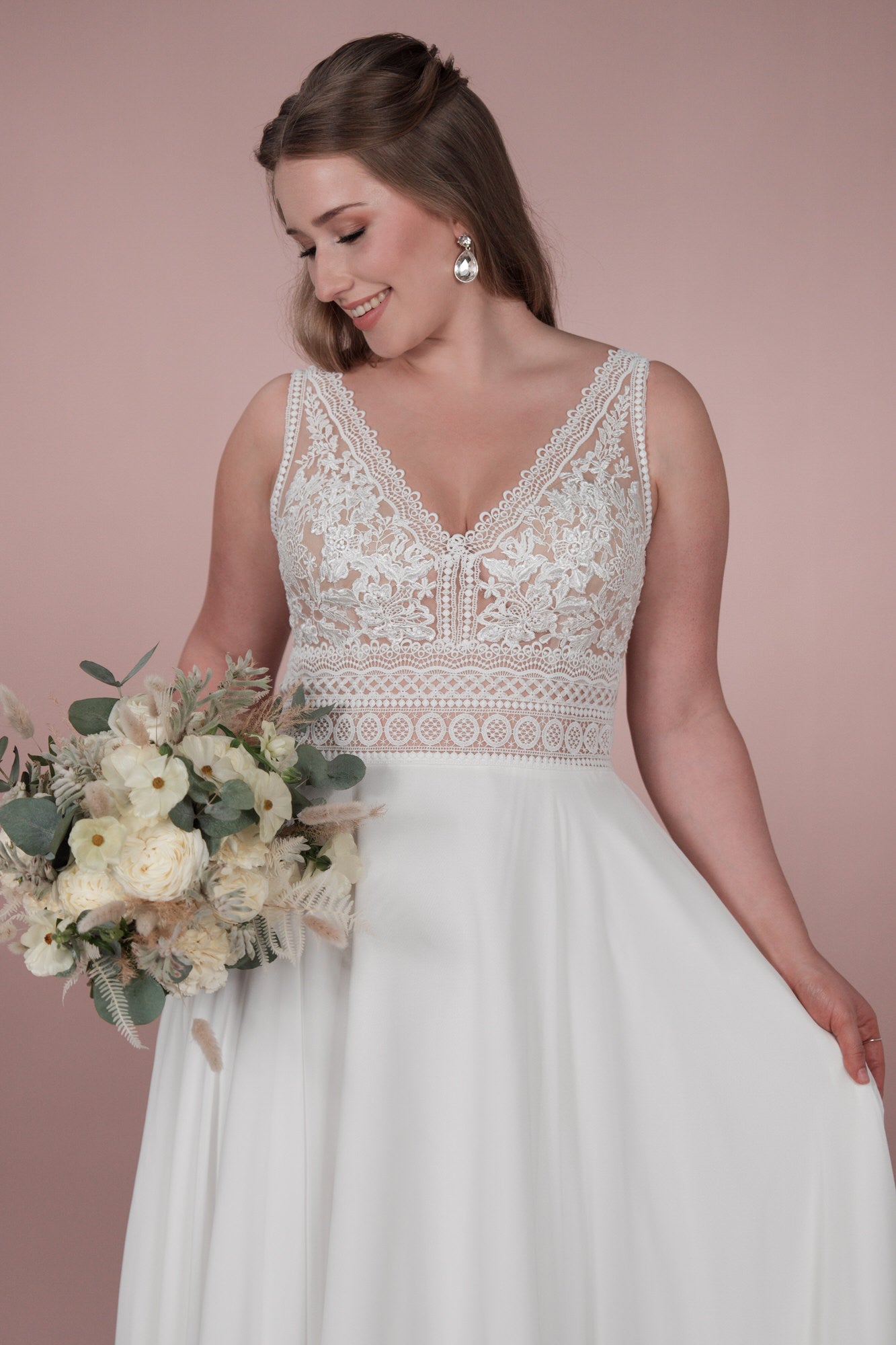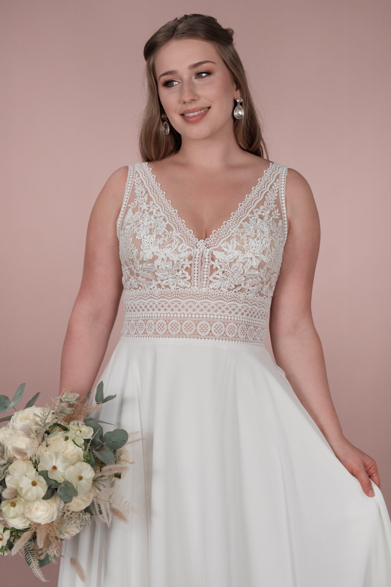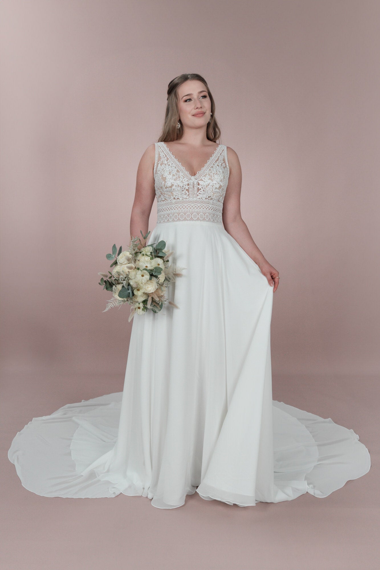 Das C23-22 Brautkleid aus der Klassik Kollektion ist das perfekte Kleid für die Bridonista mit einem verspielten Sinn für Romantik. Die elegante Spitze, der tiefe V-Ausschnitt und der fließende Chiffon sorgen für einen klassischen Boho/Vintage-Look. Die A-Linie schmeichelt jeder Figur und lässt die Braut strahlen.
