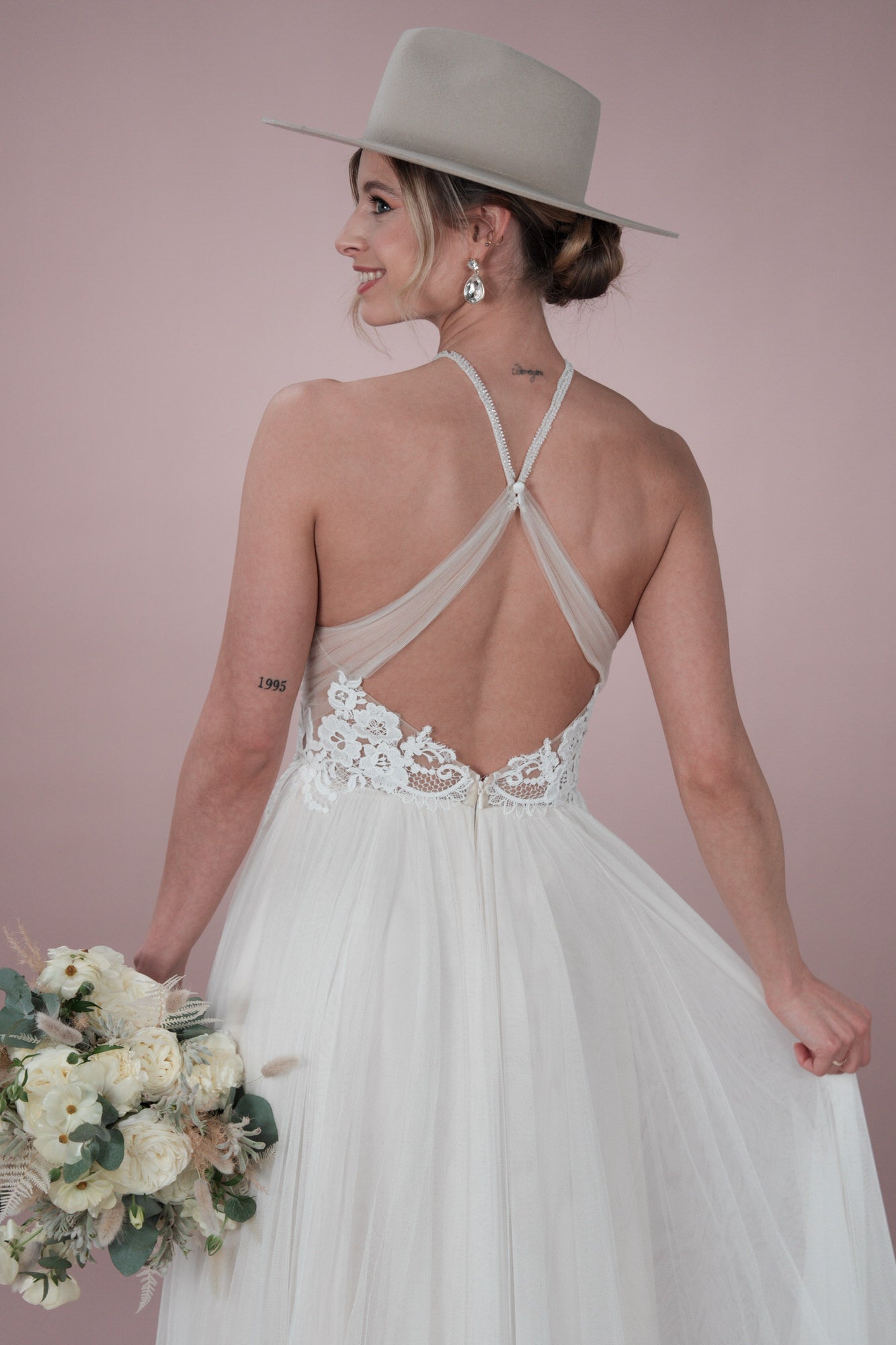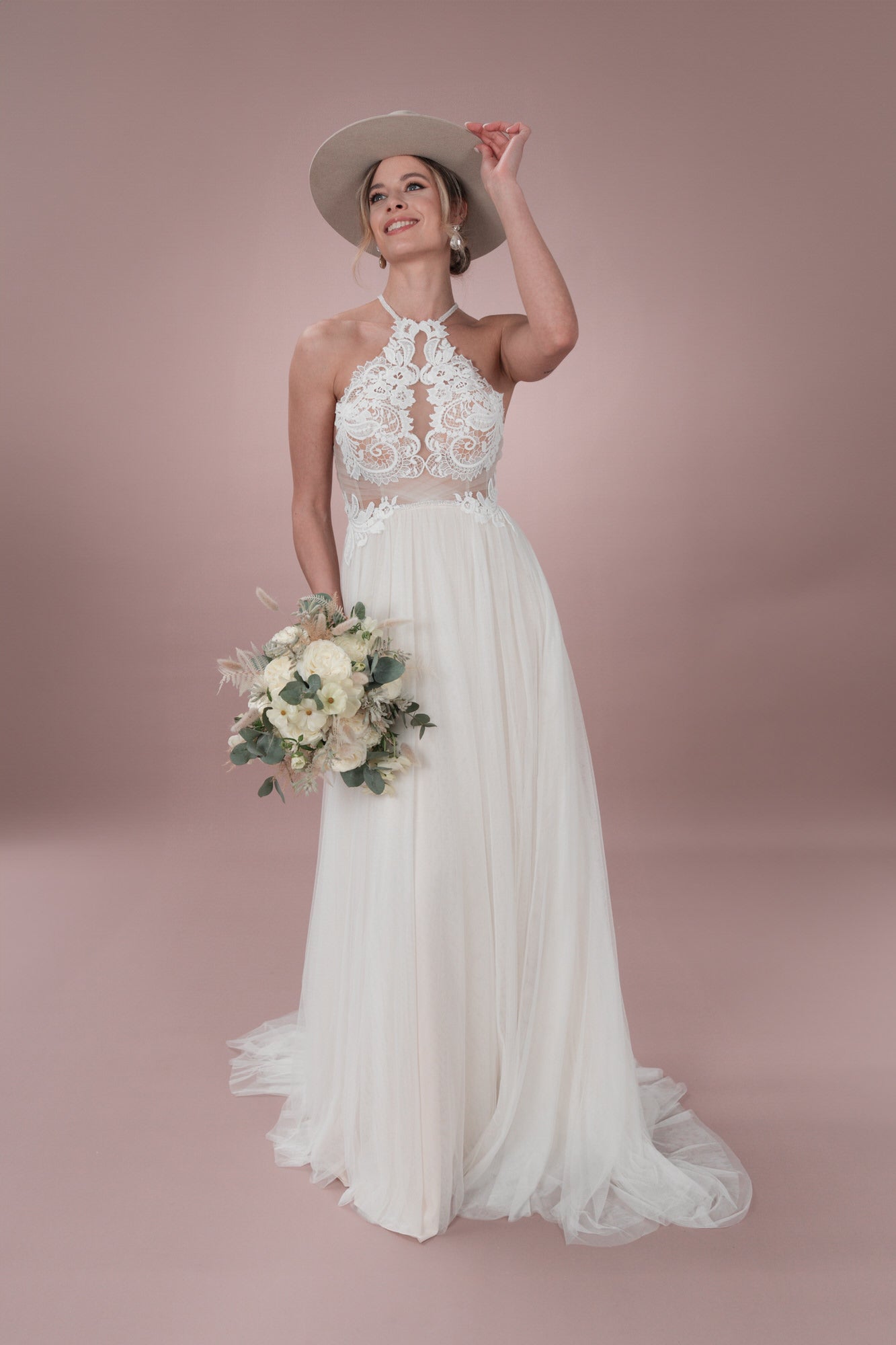 Mit dem Hochzeitskleid C24-05 von Bridonista kannst du dich für deinen großen Tag in Schale werfen! Dieses hochgeschlossene Kleid in A-Linie präsentiert schimmernden Glitzertüll in einem klassischen und doch verspielten Design mit einem sexy Schlüsselloch im Rücken und einer kurzen Schleppe, das Vintage- und Bohemien-Look vereint. Ob du am Strand tanzt oder dein Eheversprechen abgibst, du bleibst schick, cool und ganz du selbst! Dieses zeitlose Kleid liegt voll im Trend und sorgt mit seinem charmanten, verspielten Look dafür, dass sich die Köpfe bei deinem besonderen Anlass drehen. Mach dich bereit, wie die heißeste Bridonista der Welt auszusehen und zeige deinen unverwechselbaren Stil mit ein paar Drehungen auf der Tanzfläche!