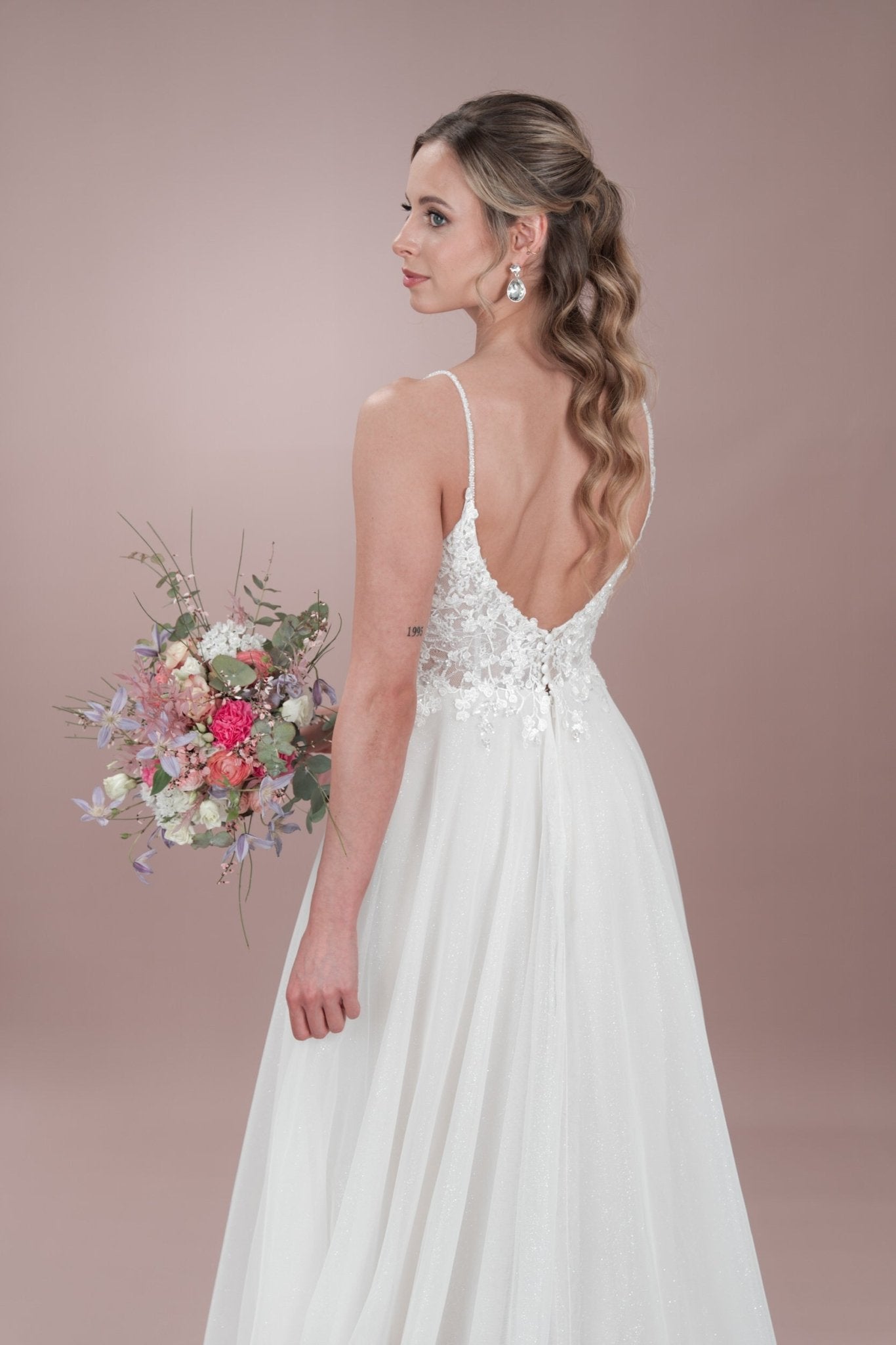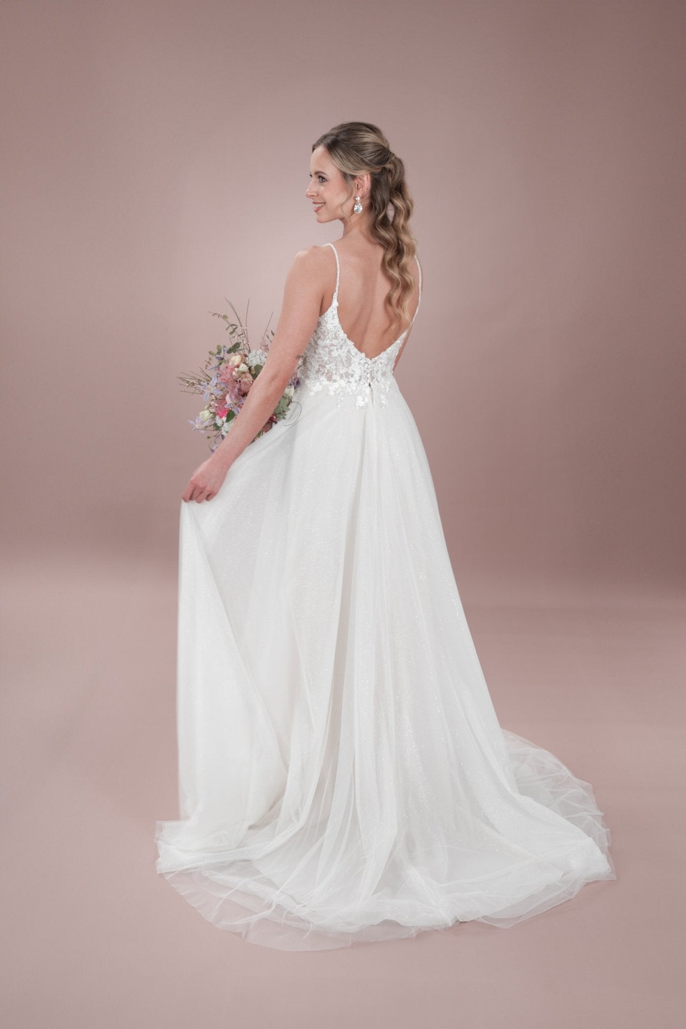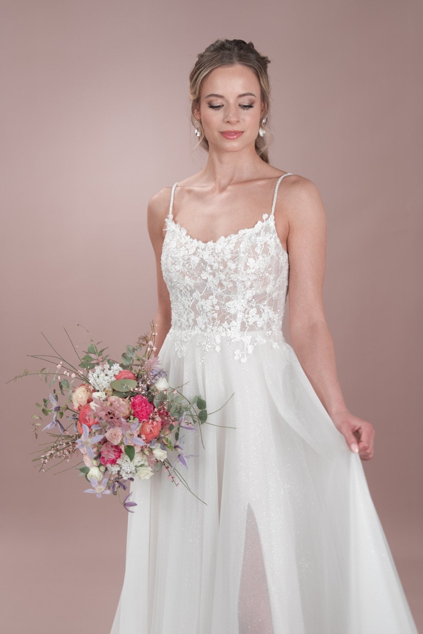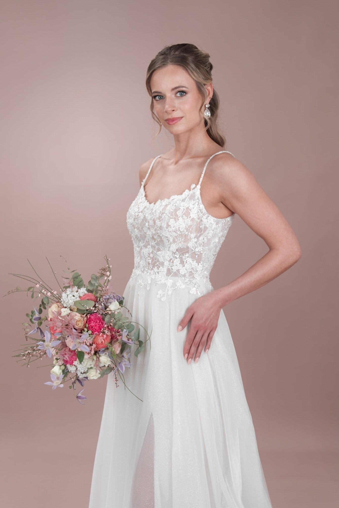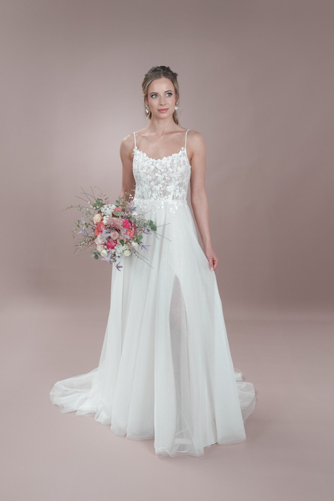 Sag selbstbewusst "Ja" in diesem zeitlosen Bridonista Hochzeitskleid in A-Linie! Zeig dich von deiner verspielten Seite mit zierlichen Spaghettiträgern, einem runden Ausschnitt und einer kurzen Knopfleiste - mit einem Hauch von Transparenz. Die feine Spitze und die feinen Stickereien sorgen für einen Hauch von moderner Eleganz, während die Wahl zwischen Glitzertüll oder ohne Glitzertüll dafür sorgt, dass dieses Kleid zu einem besonderen Unikat wird. Der Tüllrock, der Beinschlitz und die kurze Schleppe werden den Raum mit Glanz und Glamour erfüllen, wenn du die Nacht durchwirbelst. Wenn du in das C24-06 schlüpfst, bist du garantiert die Schönheit des Balls! Sorge an deinem besonderen Tag für ein Statement mit dem C24-06! Dieses atemberaubend schöne Kleid sorgt dafür, dass du der Star der Show bist - egal, wohin das Leben dich übernimmt. Mit der verspielten kurzen Knopfleiste, den zierlichen Spaghettiträgern und dem runden Ausschnitt steht deinem glamourösen Auftritt nichts mehr im Wege. Außerdem hast du die Wahl zwischen Glitzertüll und keinem Glitzertüll für den perfekten letzten Schliff. Also los, leuchte und tanze die Nacht durch!