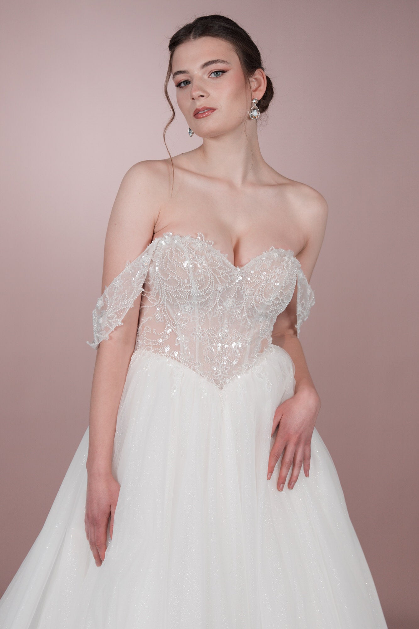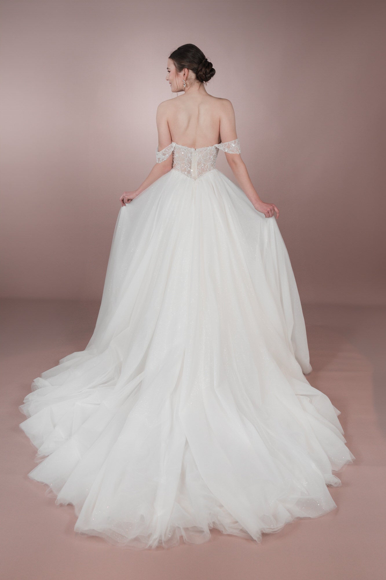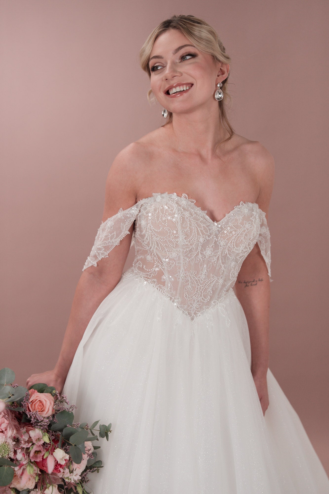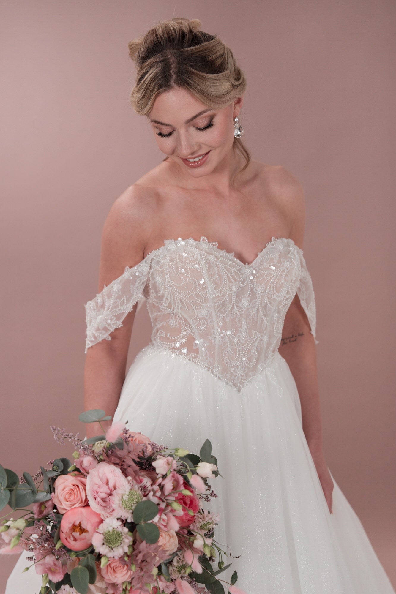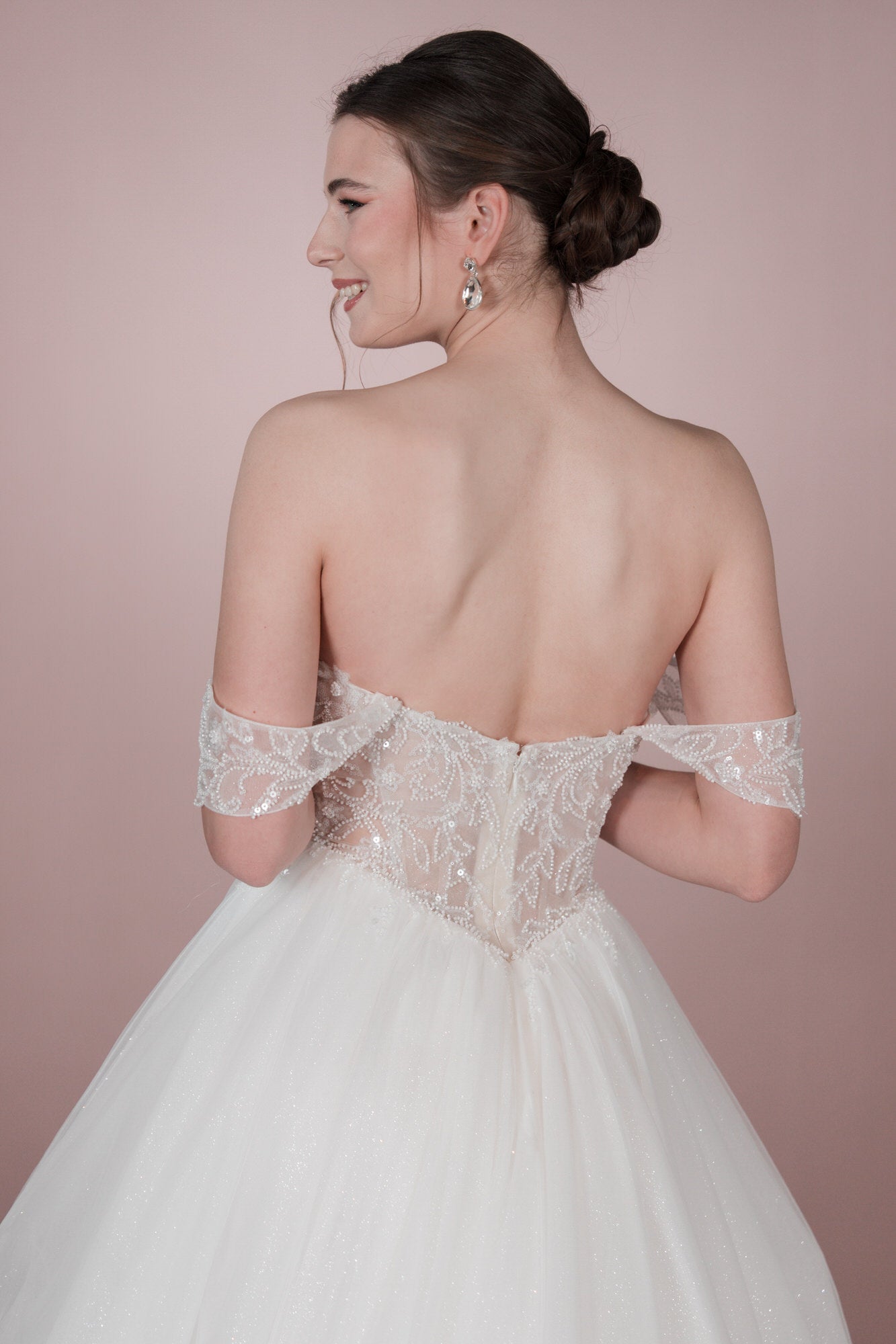 Die Carmen-Träger verleihen dem Kleid einen romantischen Touch und betonen deine Schultern auf elegante Art und Weise. Und ja, das Kleid ist definitiv pompös - es wird alle Blicke auf dich lenken!