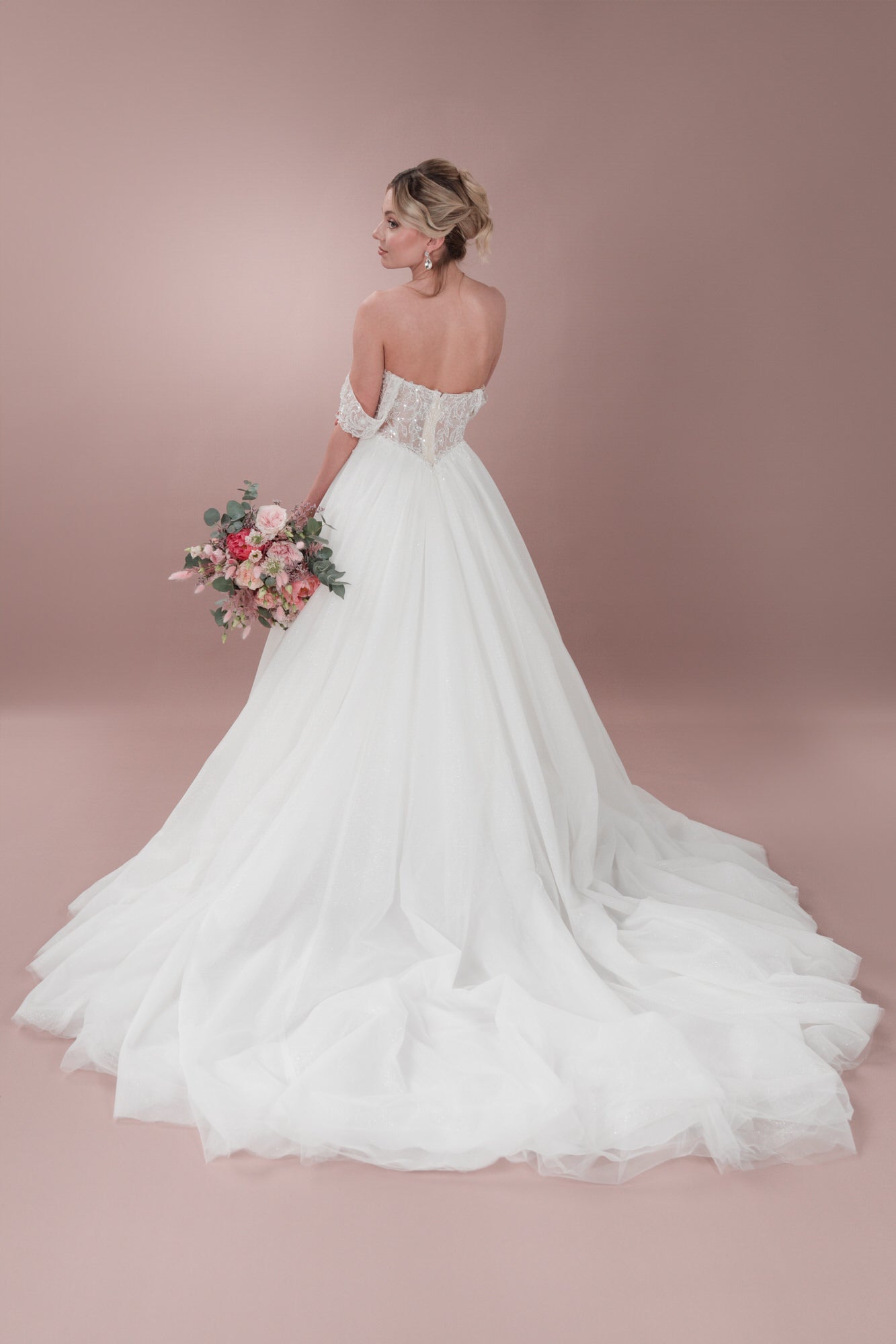 Die lange Schleppe verleiht dem Kleid einen klassischen Touch und sorgt dafür, dass du dich wie eine echte Prinzessin fühlst. Der Glitzereffekt sorgt für den Extra-Wow-Faktor und verleiht dir einen ganz besonderen Auftritt.
