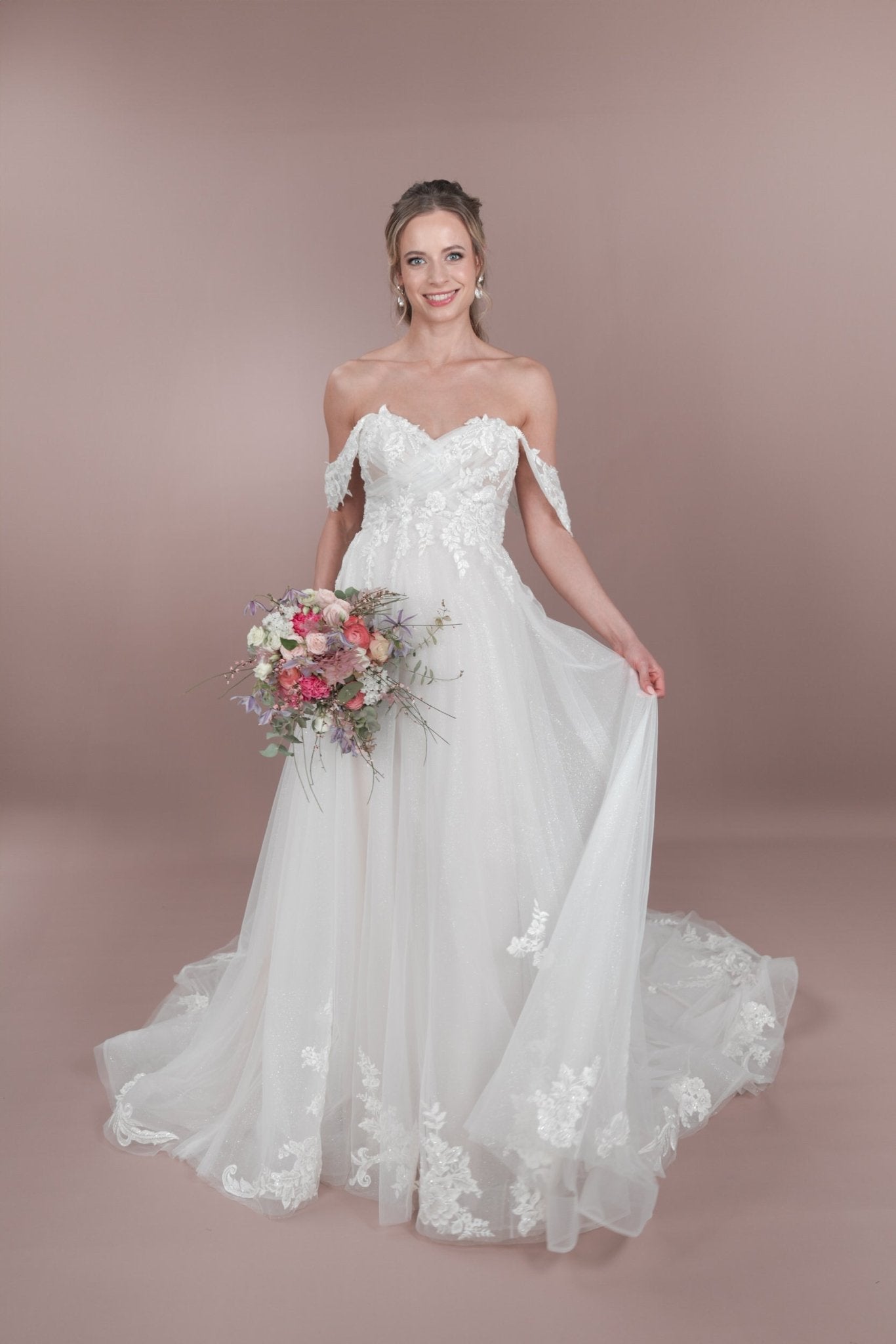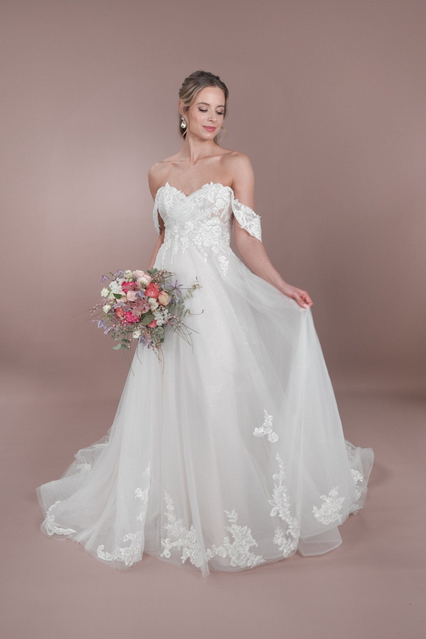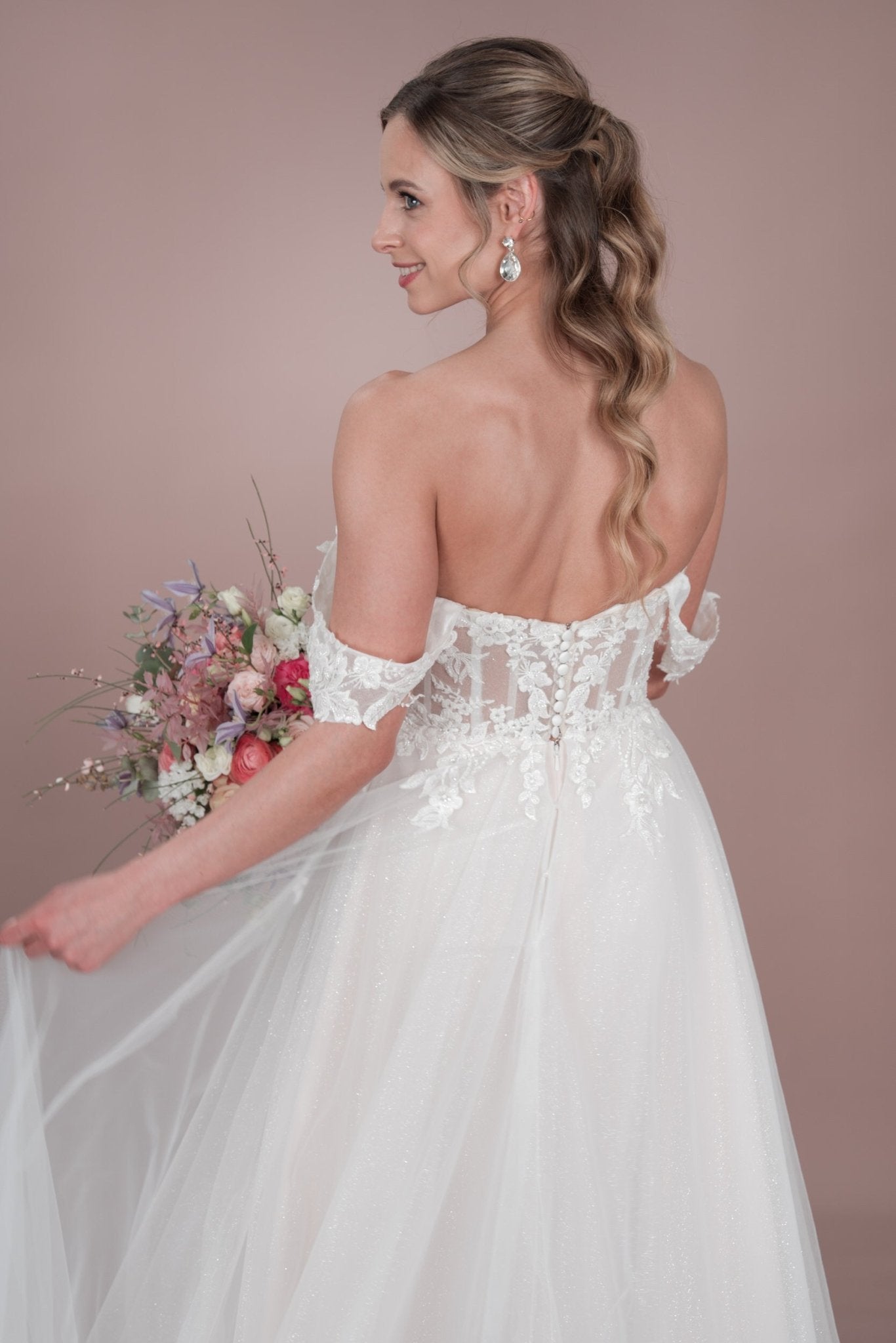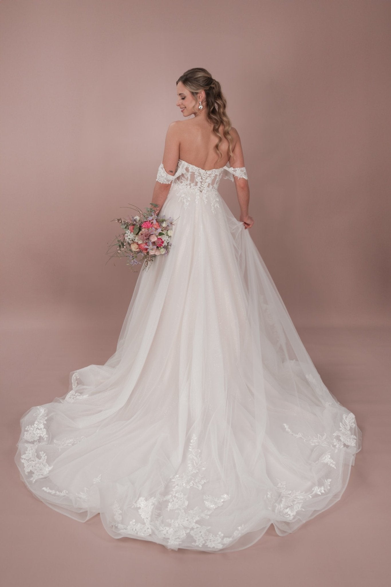 Das C24-12 Bridonista Hochzeitskleid ist dein wahr gewordener Traum! Mit seiner modernen A-Linien-Silhouette, den zeitlosen Vorzügen, dem verspielten Off-the-Shoulder-Design und dem romantischen Herzausschnitt wird dein Gang zum Traualtar zu einem echten Hingucker! Die transparenten Details, die Stickereien, die kurze Knopfleiste und der wahlweise glitzernde oder nicht glitzernde Tüllrock sorgen für die genau richtige Portion Glitzer! Und mit der mittellangen Schleppe und dem geraden Rückenausschnitt wirst du eine unvergessliche errötende Braut sein! Du wirst dich von der Zeremonie bis zum Empfang *fabelhaft* fühlen! Mit wunderschönen Lagen und maßgeschneiderten Details sorgt dieses Kleid dafür, dass du dich die ganze Nacht lang wohl fühlst.