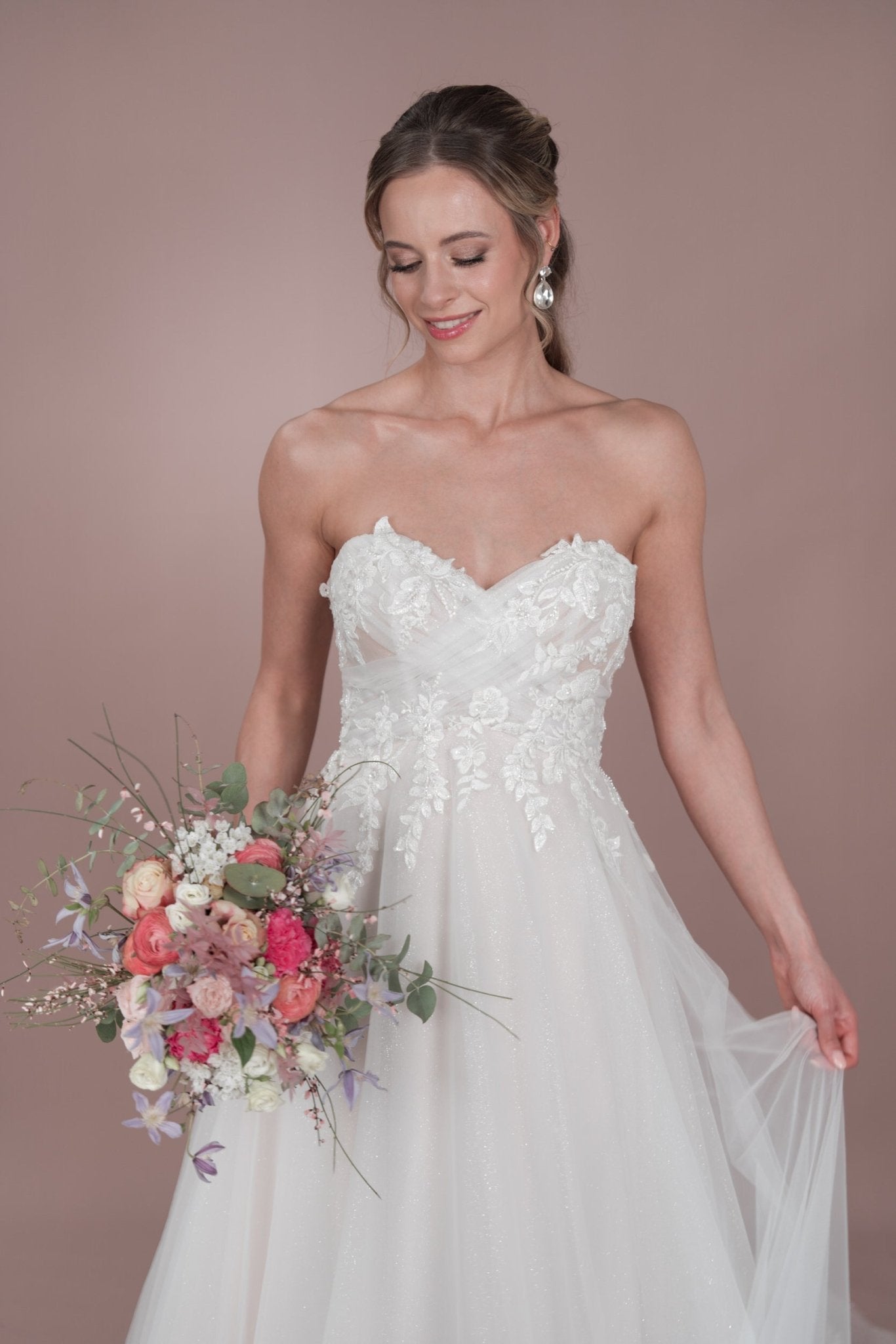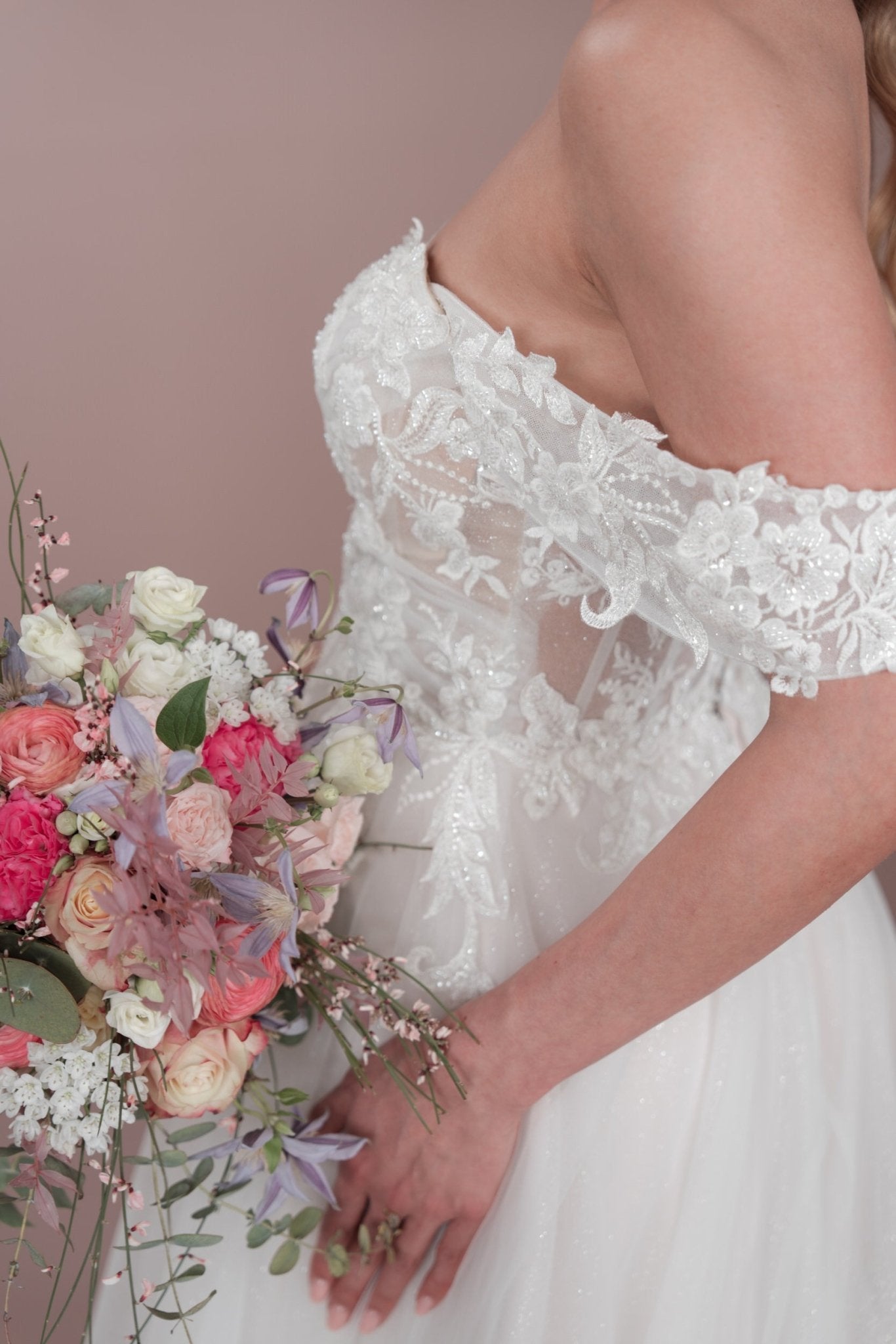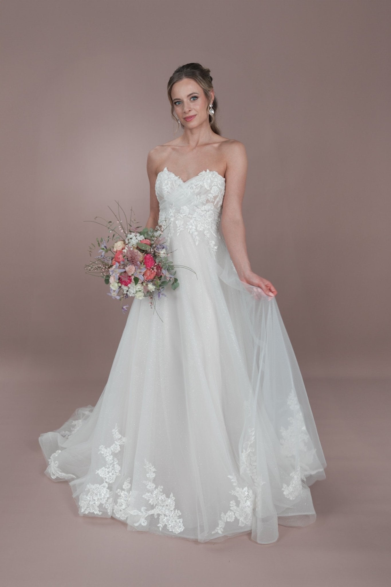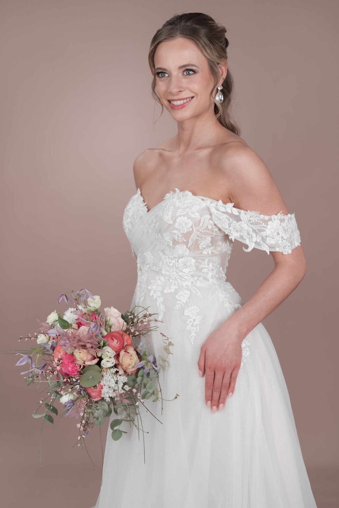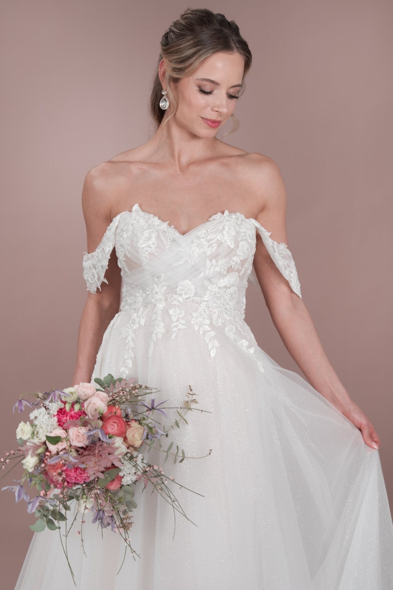 Das C24-12 Bridonista Hochzeitskleid ist dein wahr gewordener Traum! Mit seiner modernen A-Linien-Silhouette, den zeitlosen Vorzügen, dem verspielten Off-the-Shoulder-Design und dem romantischen Herzausschnitt wird dein Gang zum Traualtar zu einem echten Hingucker! Die transparenten Details, die Stickereien, die kurze Knopfleiste und der wahlweise glitzernde oder nicht glitzernde Tüllrock sorgen für die genau richtige Portion Glitzer! Und mit der mittellangen Schleppe und dem geraden Rückenausschnitt wirst du eine unvergessliche errötende Braut sein! Du wirst dich von der Zeremonie bis zum Empfang *fabelhaft* fühlen! Mit wunderschönen Lagen und maßgeschneiderten Details sorgt dieses Kleid dafür, dass du dich die ganze Nacht lang wohl fühlst.