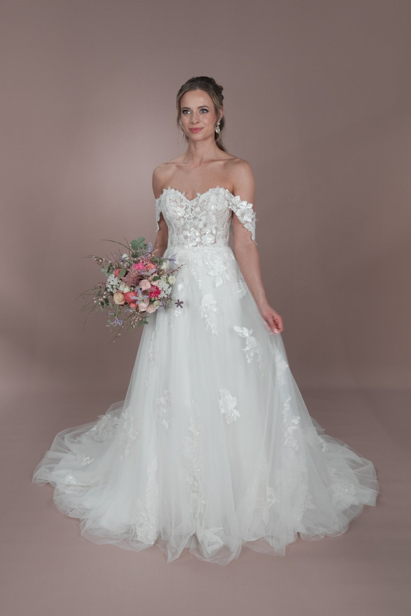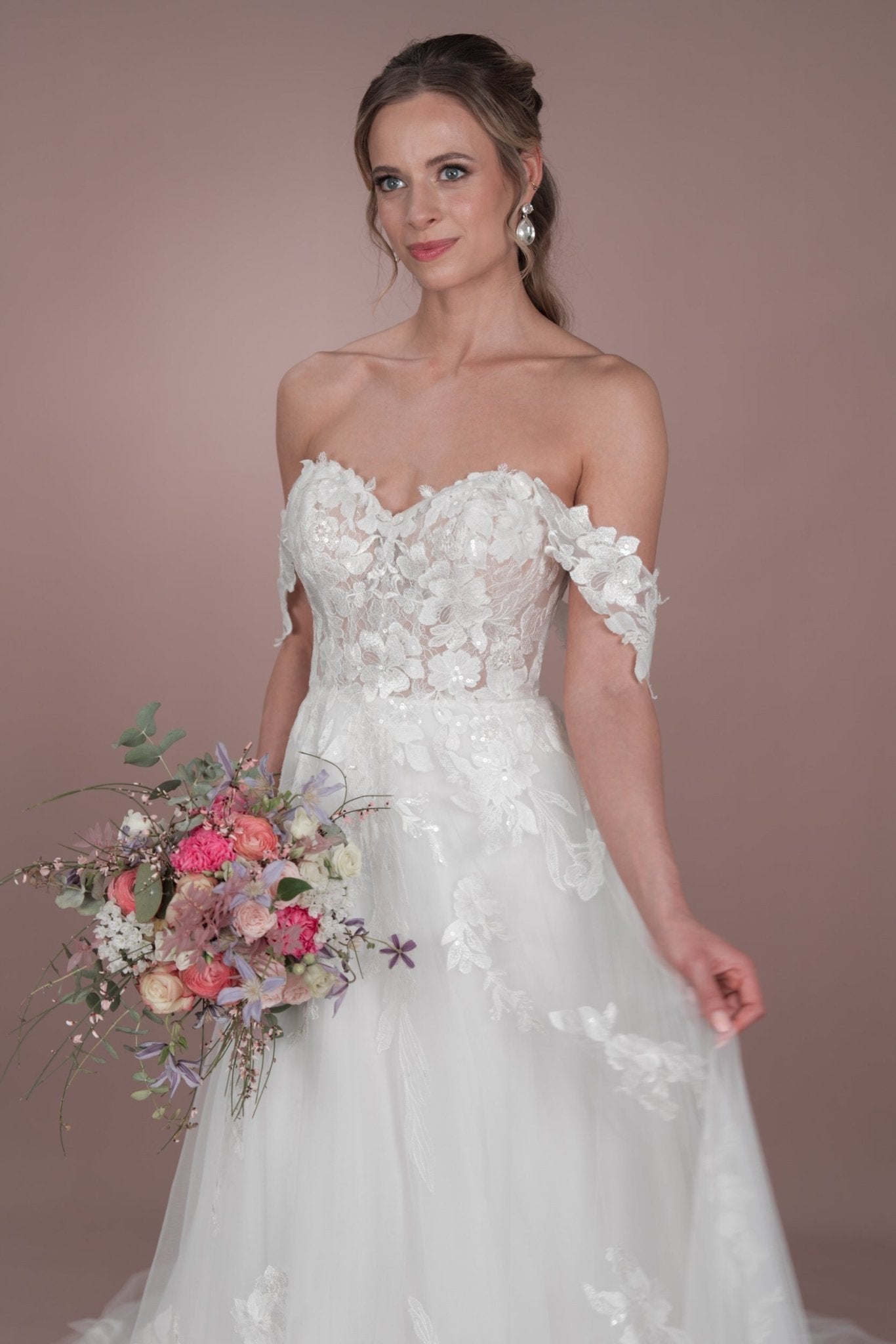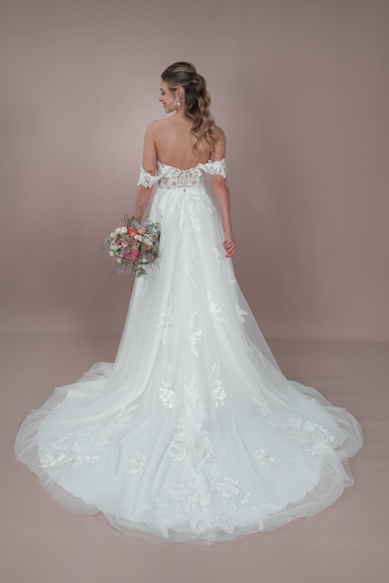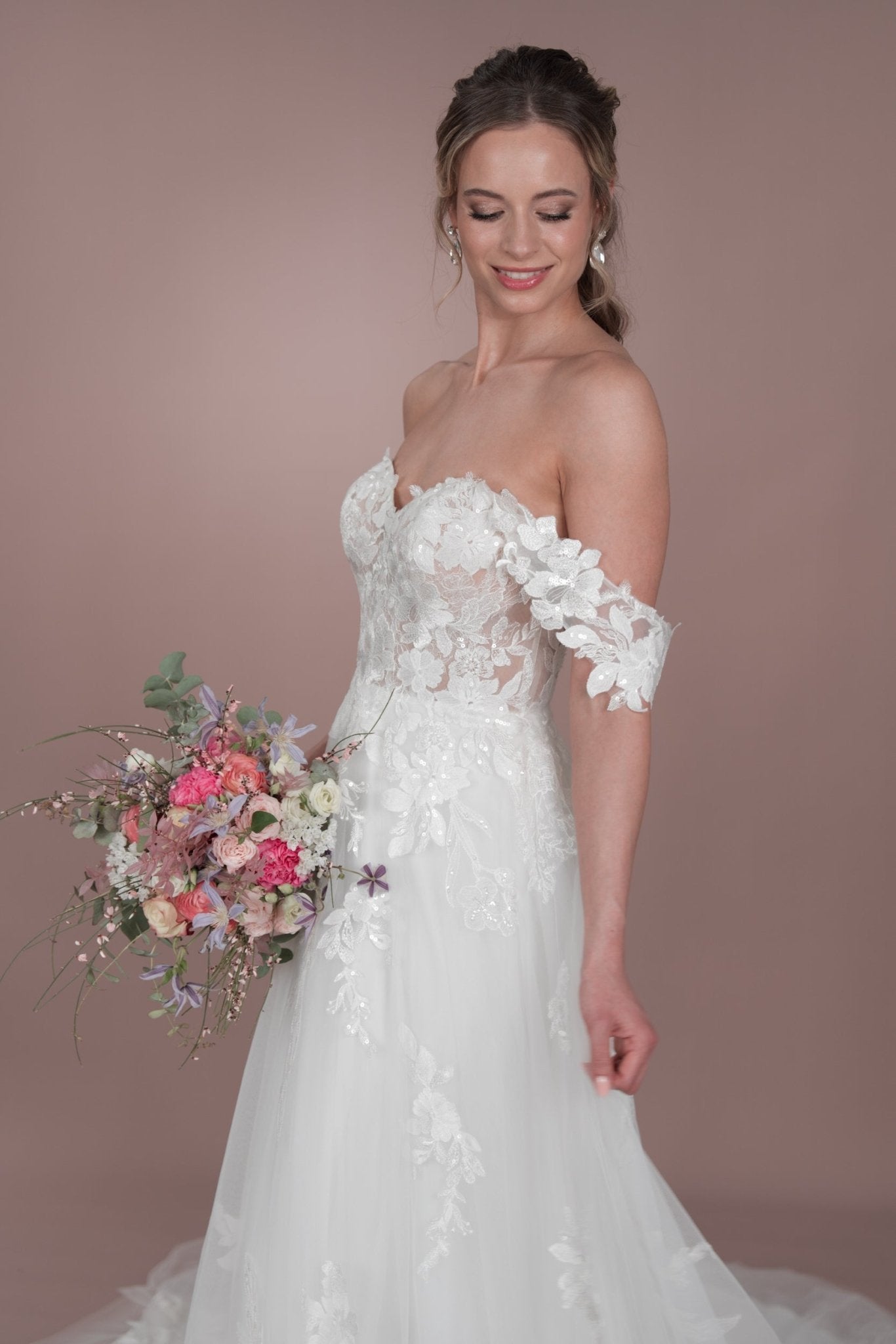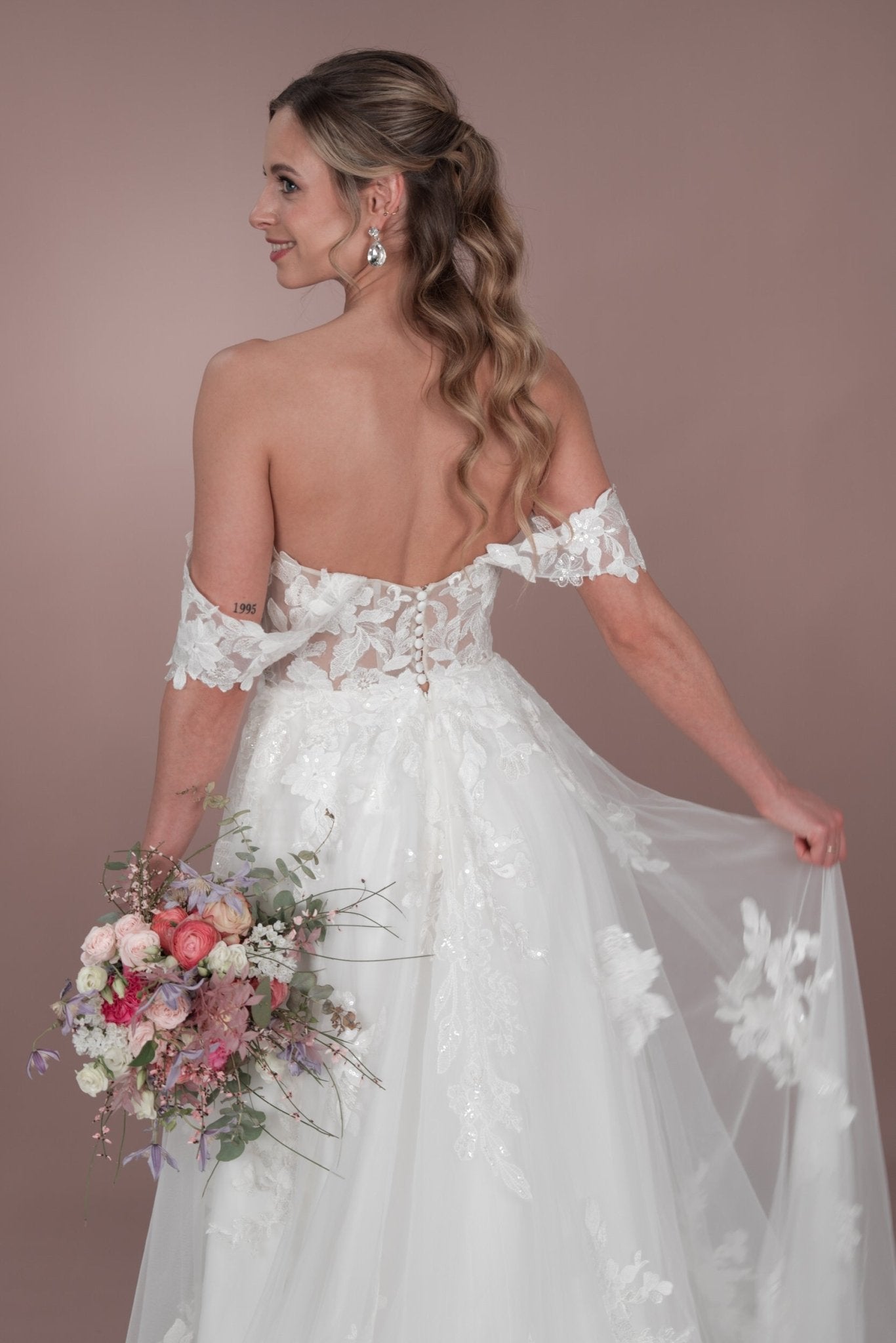 Mit dem Bridonista Hochzeitskleid C24-13 bringst du deinen besonderen Tag zum Strahlen! Dieses auffällige A-Linienkleid hat die perfekten Zutaten für einen zeitlosen, romantischen Look. Moderne Akzente wie der schulterfreie Ausschnitt mit Herz-Cutout, abnehmbare Träger und Glitzertüll werden dafür sorgen, dass deine Nerven vor Aufregung flattern. Spitze, Pailletten und eine kurze Knopfleiste sorgen für eine Extraportion Glamour und Glitzer! Mit der mittellangen Schleppe sorgst du garantiert für Aufsehen! Das Bridonista-Kleid C24-13 wird deine Gäste begeistern und sie bis in die frühen Morgenstunden tanzen lassen! Es ist die perfekte Mischung aus zeitloser Romantik, modernen Akzenten und glitzerndem Glamour, mit dem du dich an deinem großen Tag von deiner besten Seite zeigen wirst!