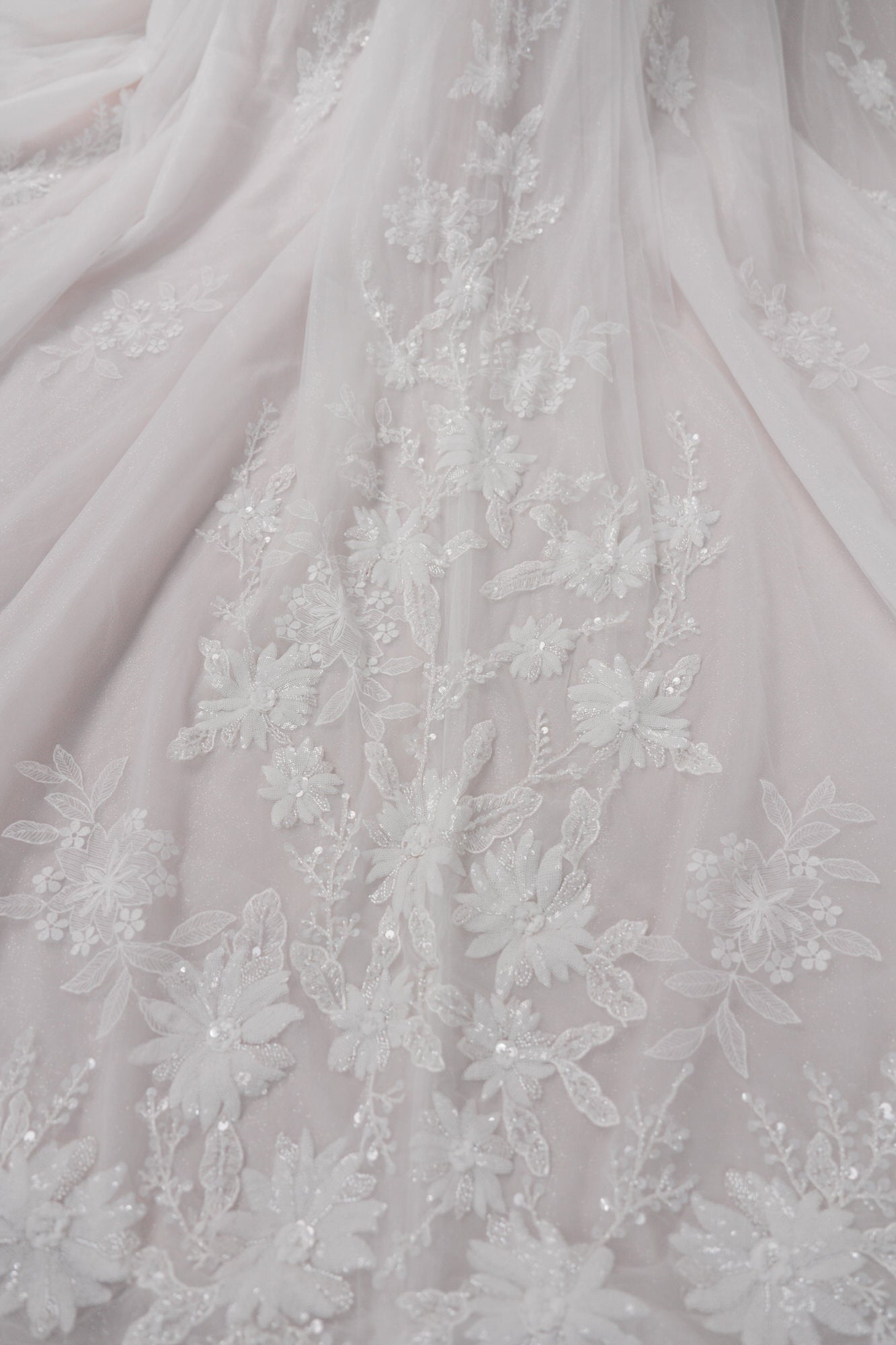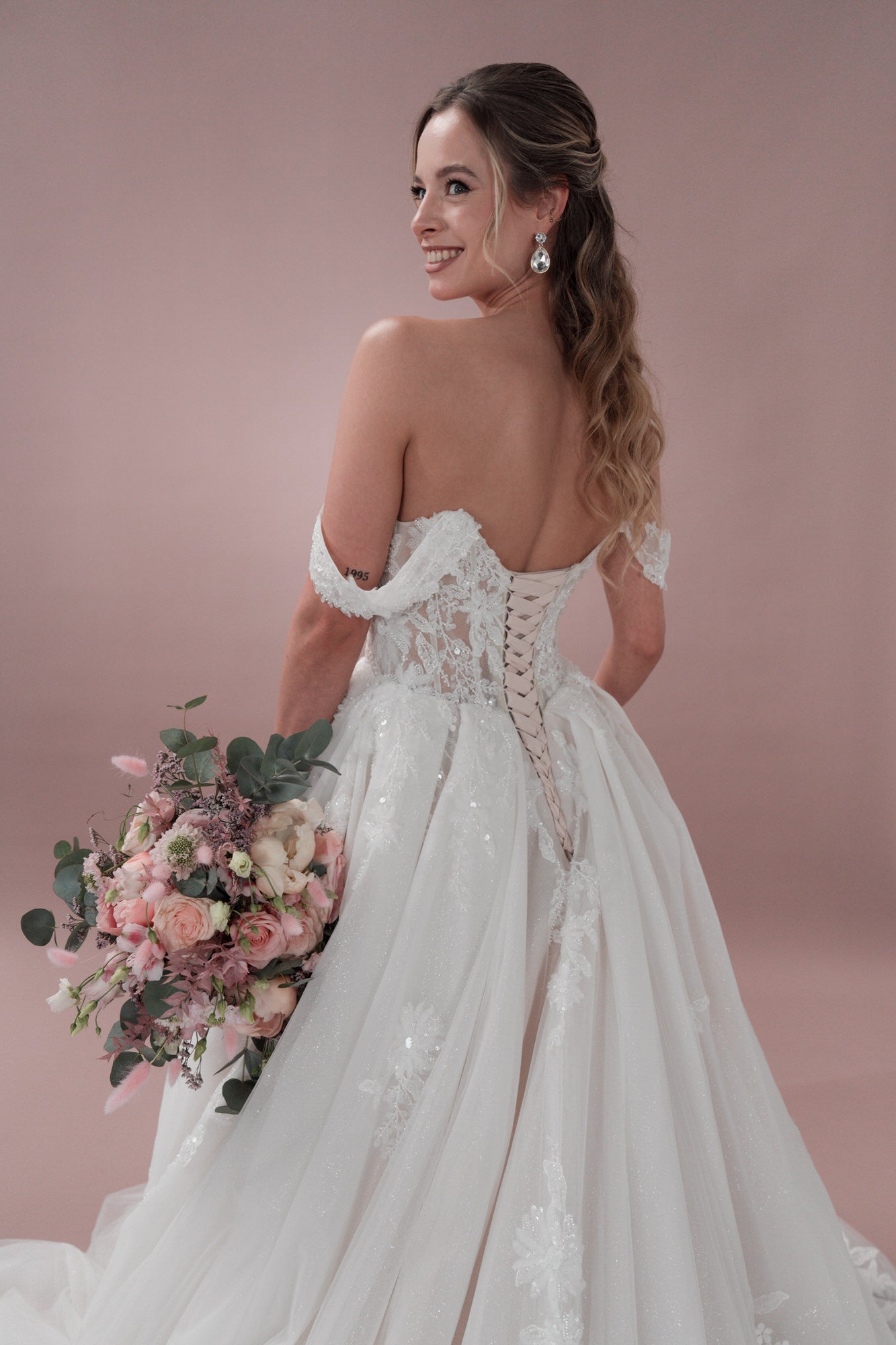 Ein Highlight dieses Kleides ist der glitzernde Tüll, der dem ganzen Look einen funkelnden Touch verleiht. Du wirst im Licht glänzen wie nie zuvor! Die Schleppe fällt lang und elegant hinter dir her, wenn du den Traualtar entlanggehst.