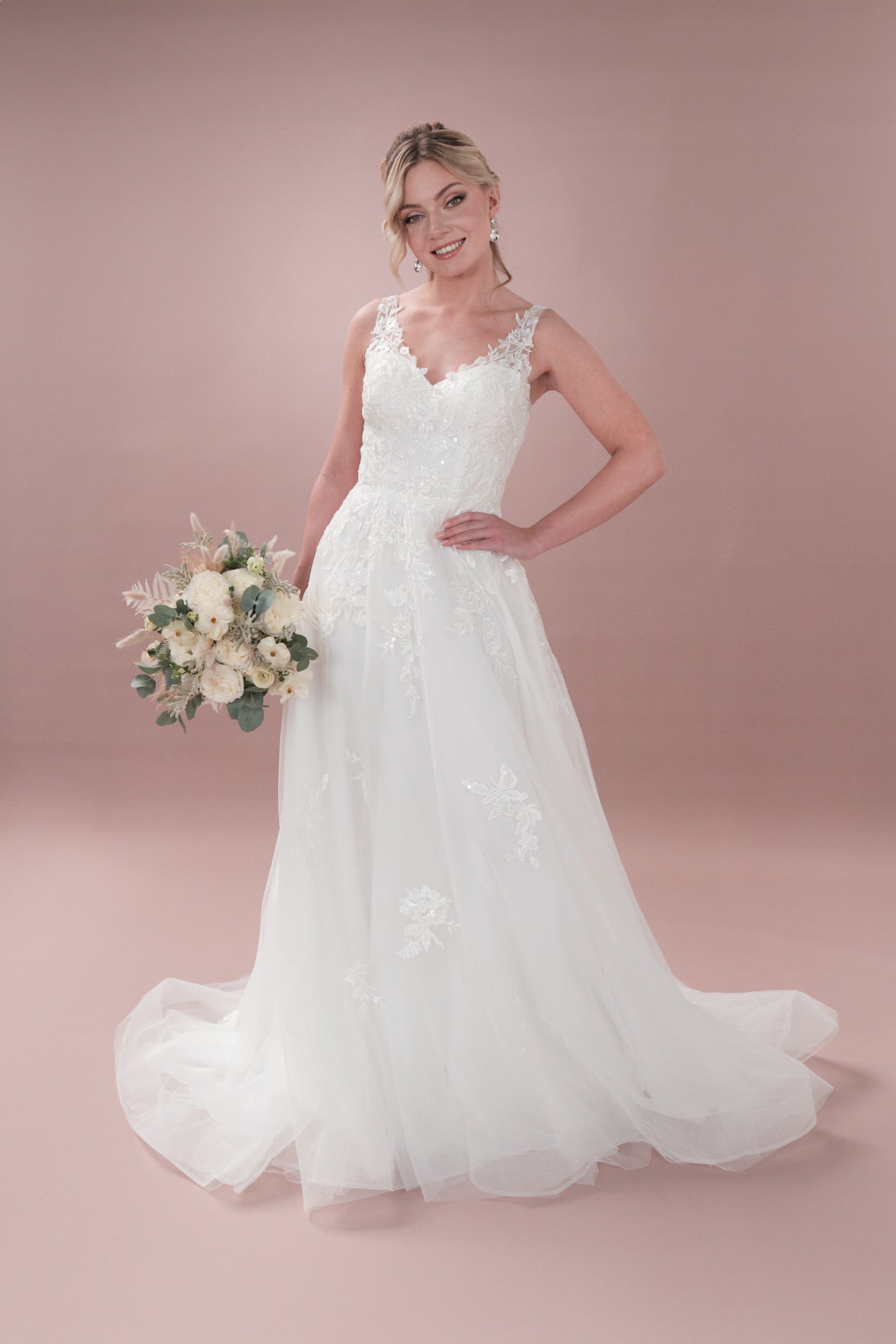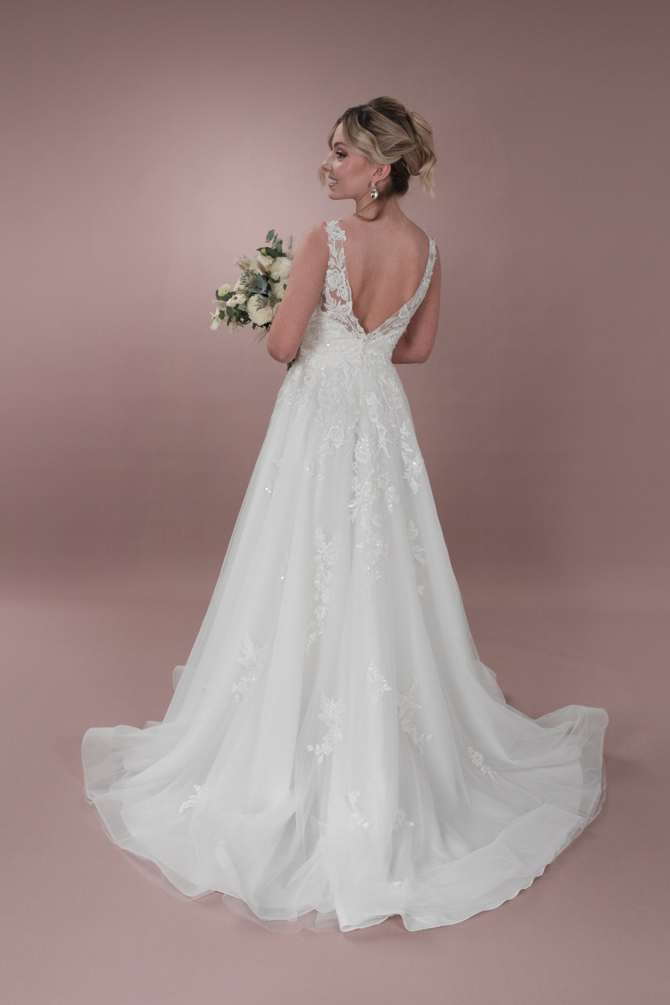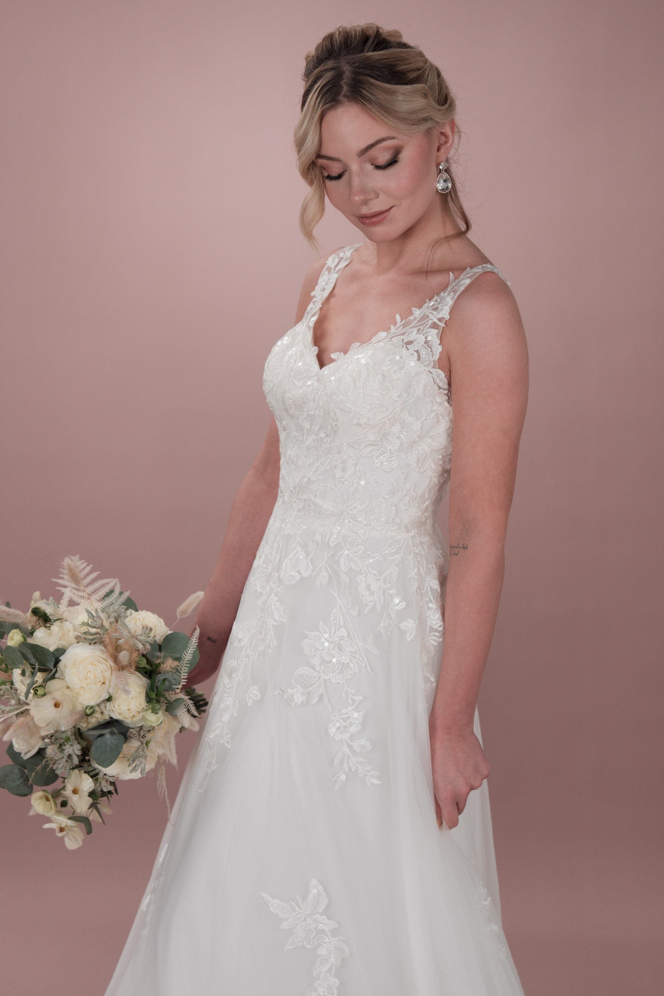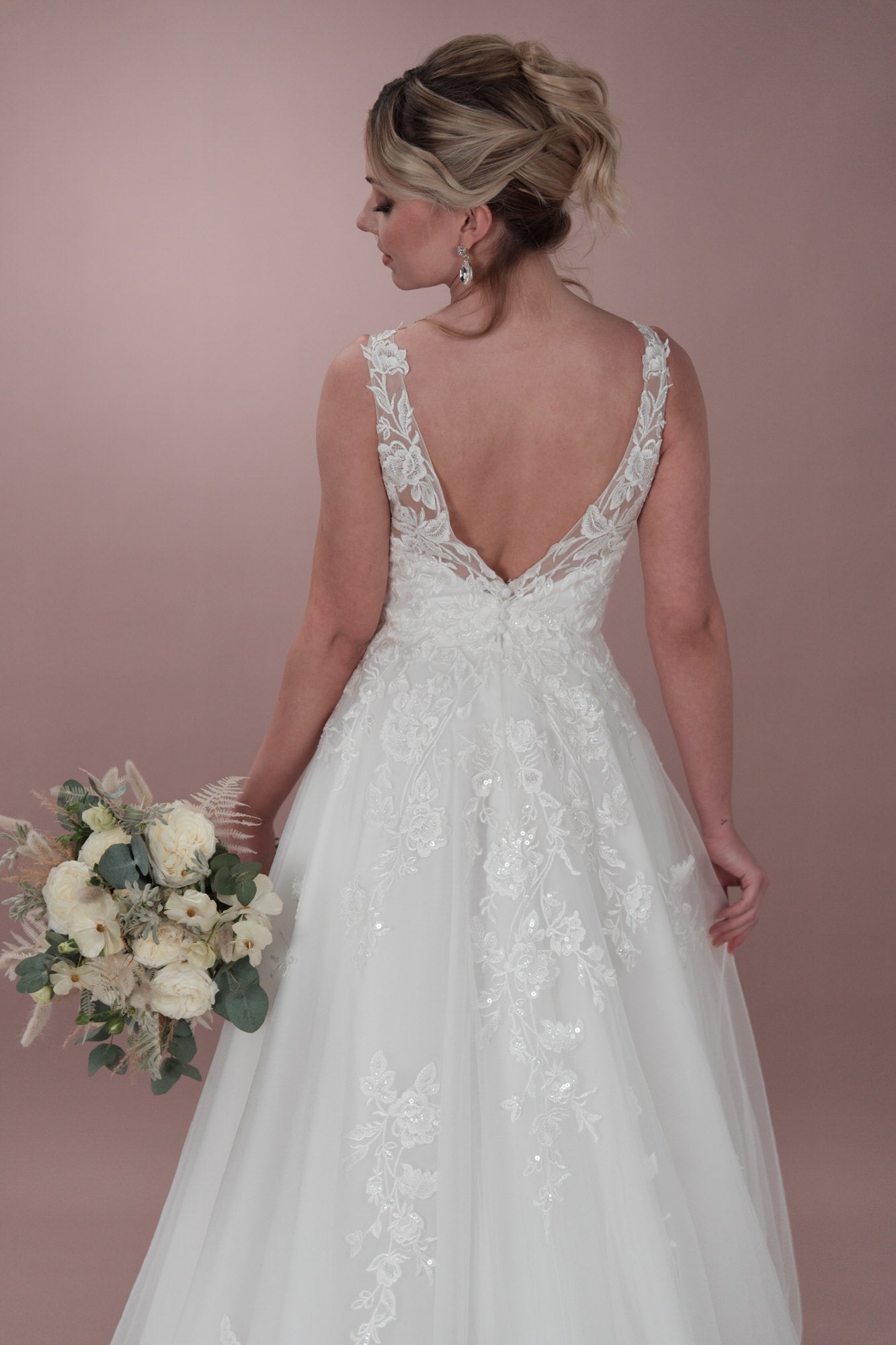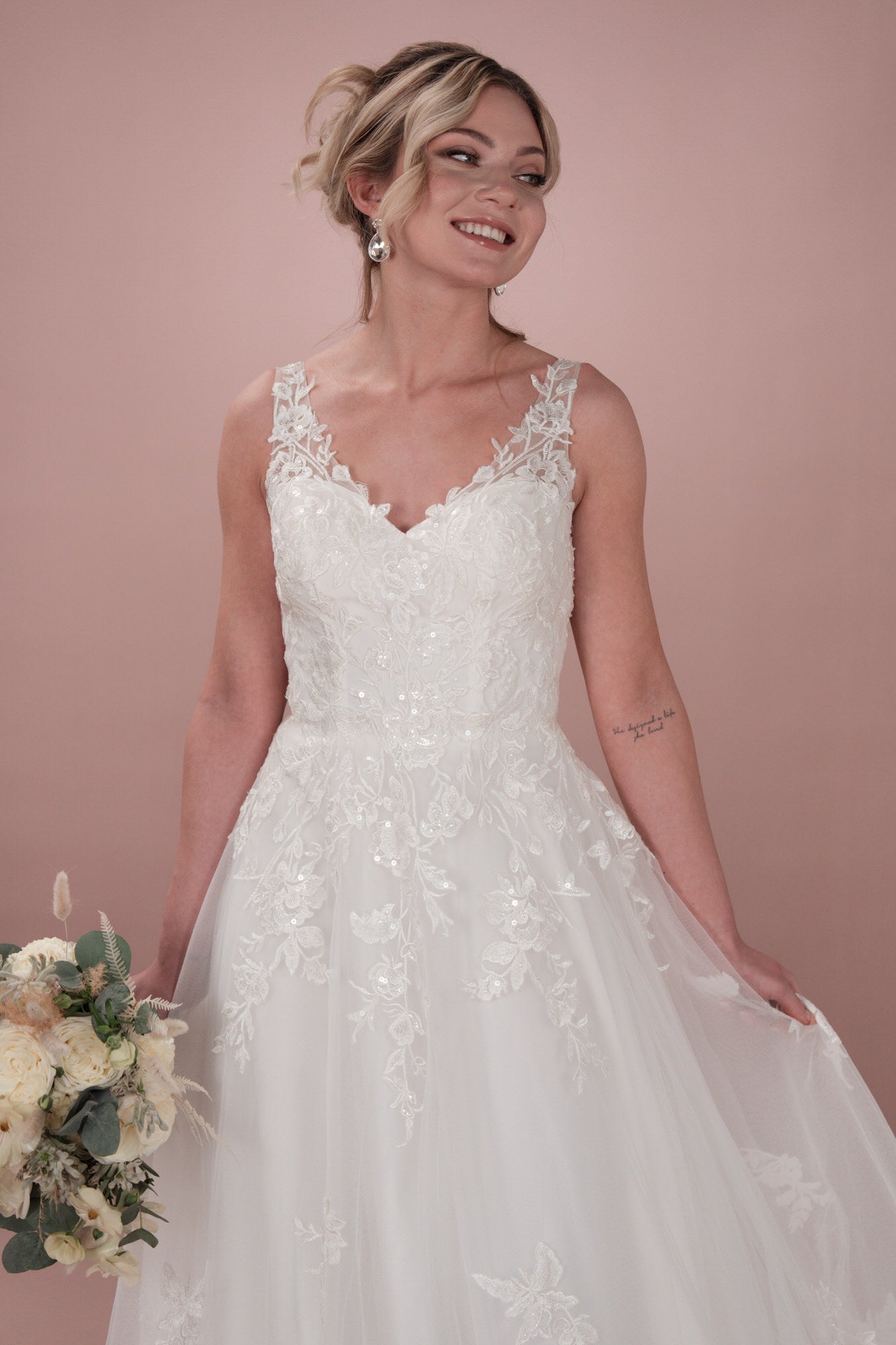 Die A-Linie des Kleides schmeichelt jeder Figur und zaubert eine wunderschöne Silhouette. Die Kombination aus Spitze, Pailletten und Tüll sorgt dafür, dass das Kleid ein echter Hingucker ist. Jeder Schritt wird von einer mittellangen Schleppe begleitet, die dir einen majestätischen Auftritt beschert.
