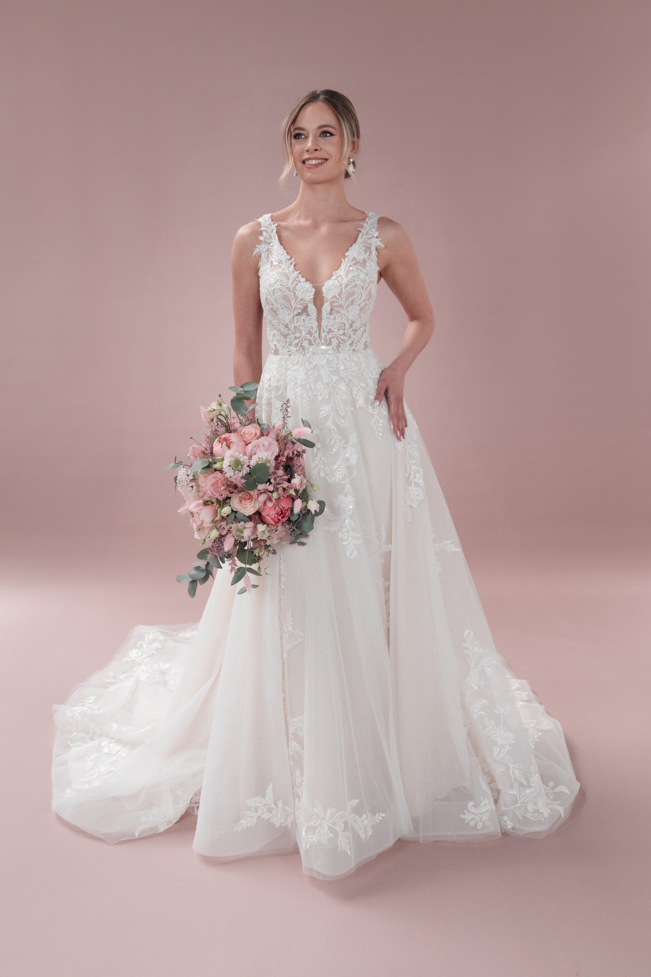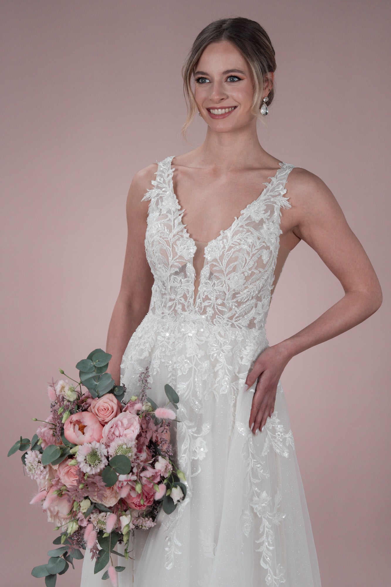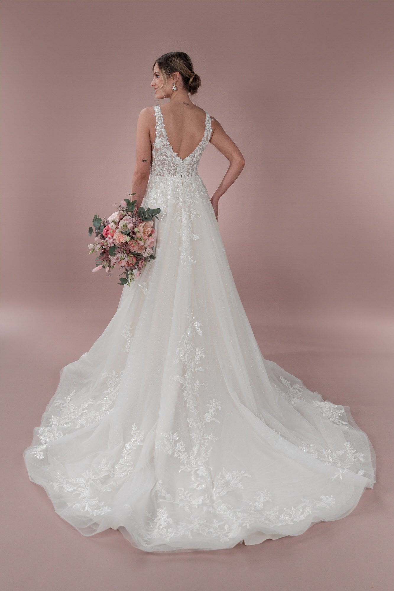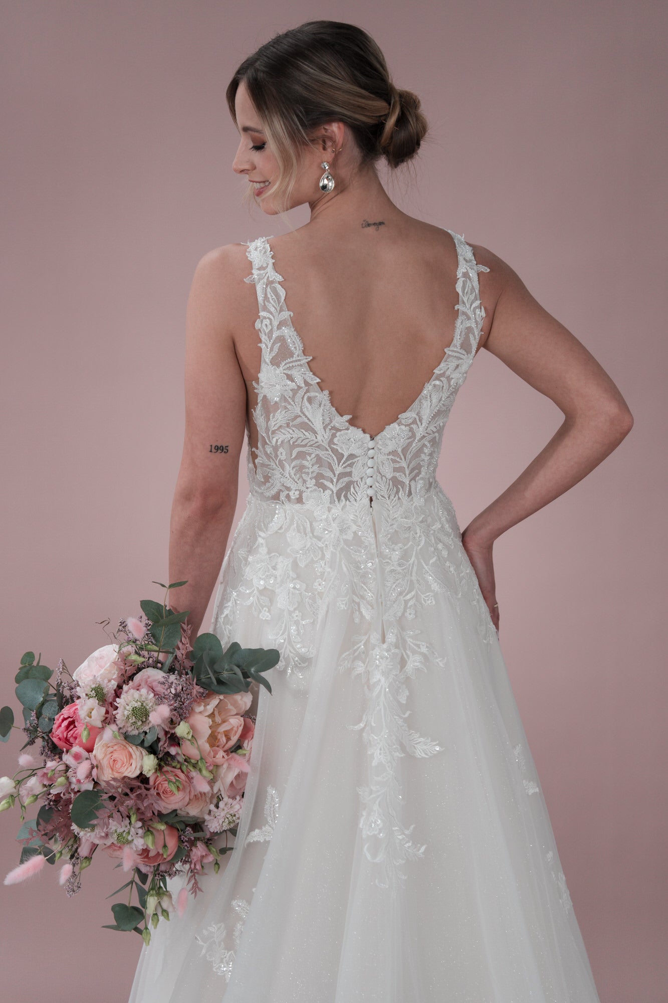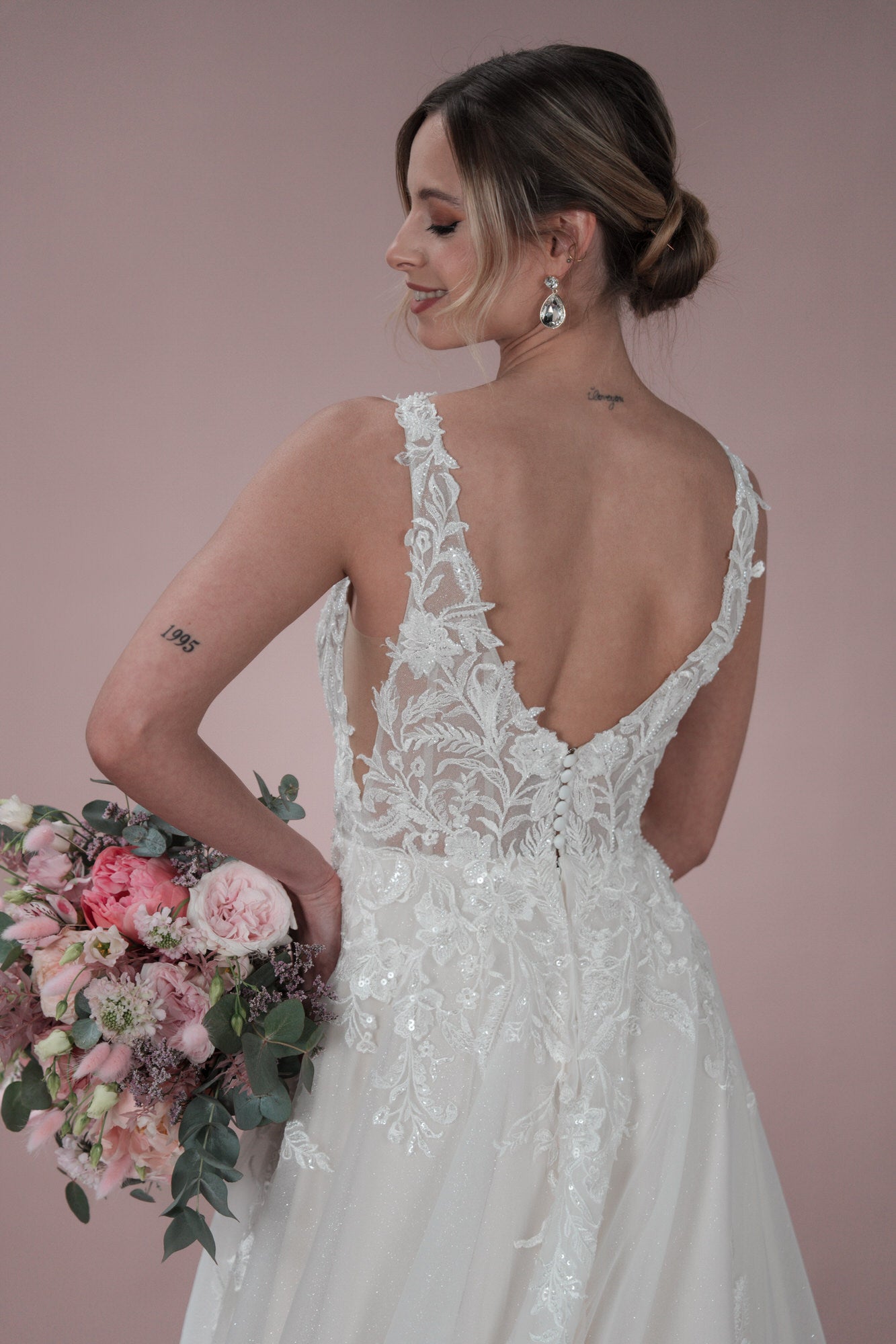 Das Hochzeitskleid C24-24 Bridonista sorgt bei modernen Bräuten mit einem zeitlosen Style für Aufsehen! Mit seinem verspielten A-Linienschnitt, der romantischen Spitze, den koketten Ausschnitten und der Transparenz - ganz zu schweigen von der Knopfleiste, dem Rock aus Glitzertüll (oder glitzerfreiem Tüll) und der mittellangen Schleppe - wird dich dieses Kleid sicher stilvoll zum Traualtar führen. Mach dich bereit, "I do" zu sagen und deine Hochzeit zum Modeereignis des Jahrhunderts zu machen! Dieses Kleid strahlt moderne Klasse mit einem Hauch von Frechheit aus! Wenn du das Bridonista anziehst, wirst du deine Gäste mit einem zeitlos schicken Look beeindrucken, der dennoch ein modernes Flair versprüht. Sei die Schönheit des Balls (oder die Braut des Haufens!) und sorge dafür, dass dein Hochzeitstag ein unvergessliches Erlebnis wird.