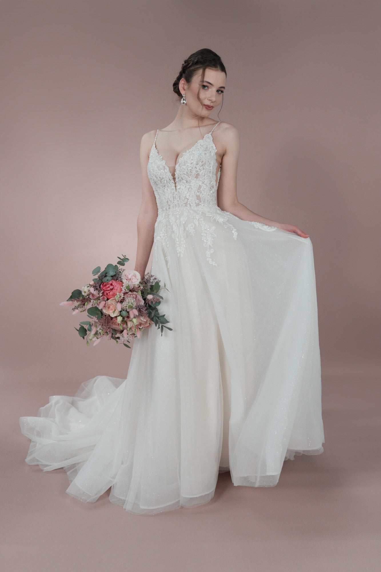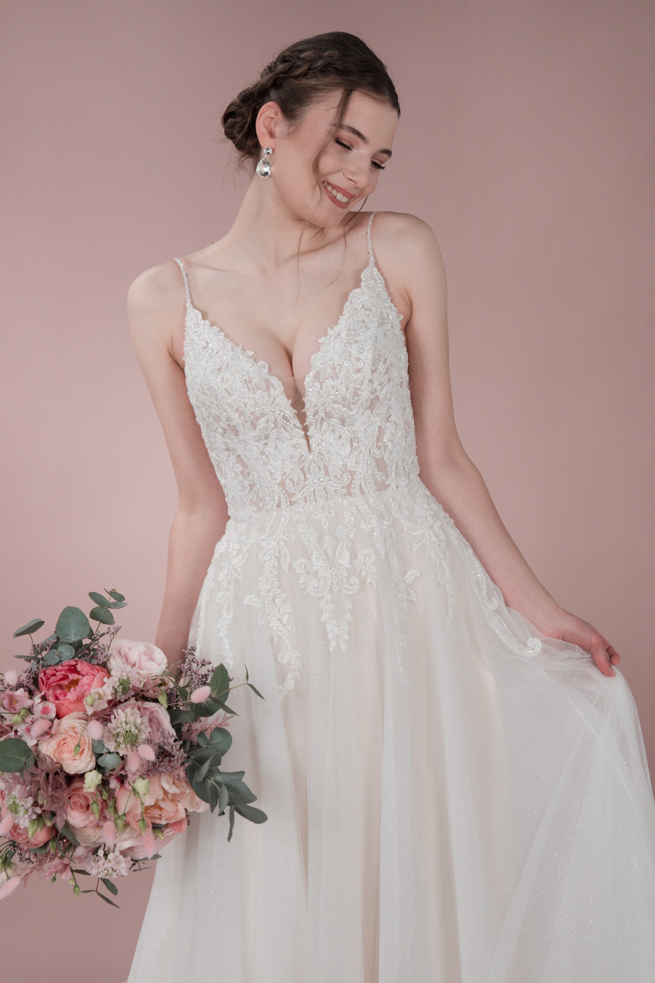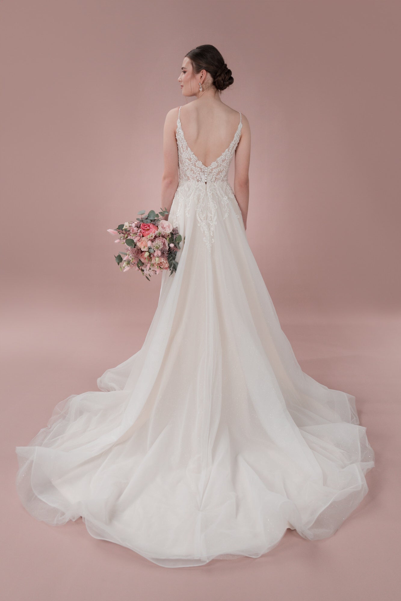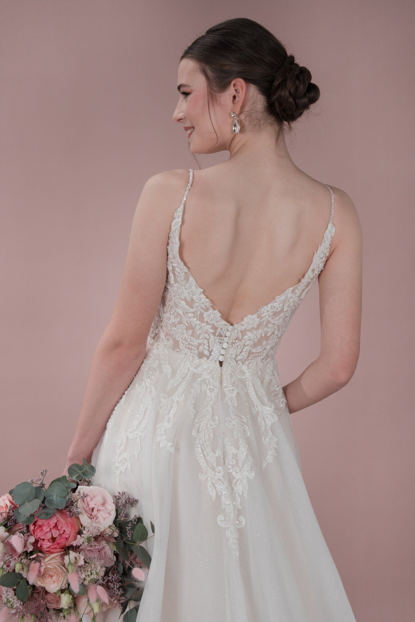Mach dich bereit, die ultimative Bridonista in unserem Hochzeitskleid C24-19 zu sein! Dieses Brautkleid in A-Linie mit Spaghetti-Trägern und klassischem V-Ausschnitt ist perfekt für moderne Bräute mit einer verspielten Seite. Atemberaubende Stickereien und Cut-outs verleihen dem zeitlosen Design einen Hauch von Transparenz, während der Tüllrock und der optionale Glitzertüll für einen Hauch von Laune sorgen. Die kurze Knopfleiste und die mittellange Schleppe sind wie geschaffen für eine Prinzessin. Nichts sagt so sehr "Ich bin eine Bridonista" wie unser Hochzeitskleid C24-19! Mit seinen einzigartigen Spaghetti-Trägern und dem klassischen V-Ausschnitt ist dieses Brautkleid in A-Linie perfekt für moderne Bräute, die ein bisschen Spaß lieben. Die atemberaubenden Stickereien und Cut-Outs sorgen für einen Hauch von Transparenz, während der Tüllrock und der schimmernde optionale Glitzertüll dem zeitlosen Design eine verspielte Note verleihen. Und für ein wahrhaft königliches Gefühl solltest du dir die prinzessinnenhafte kurze Knopfleiste und die mittellange Schleppe nicht entgehen lassen.