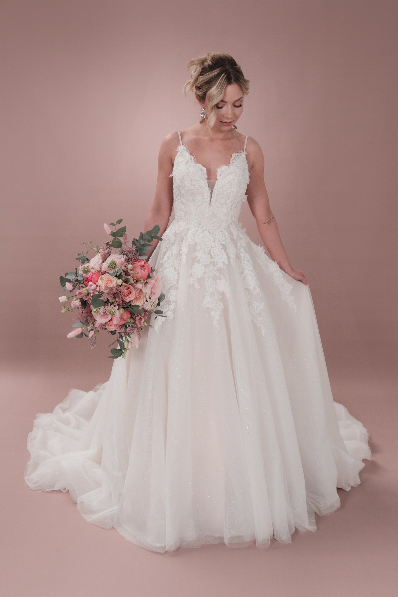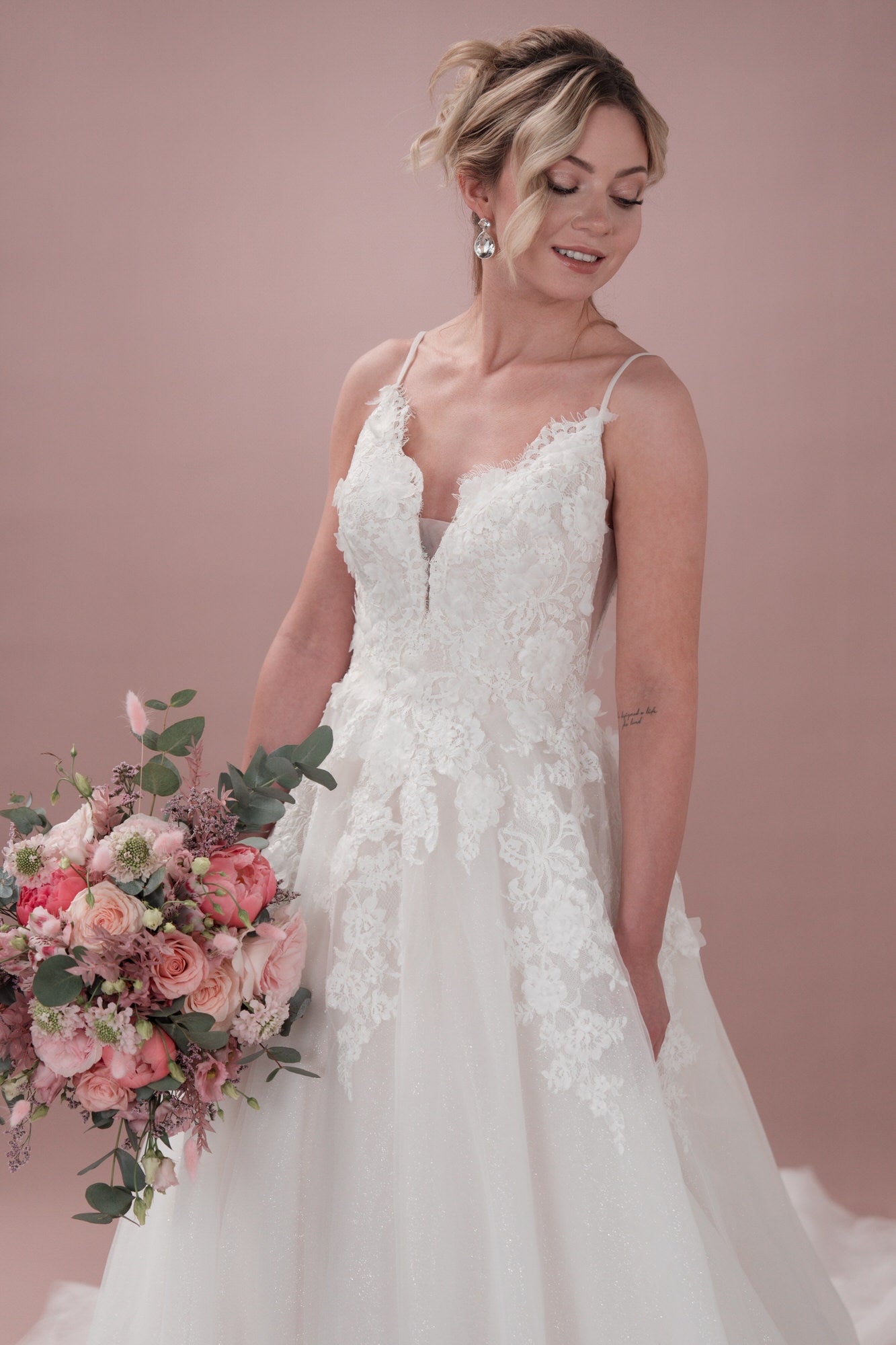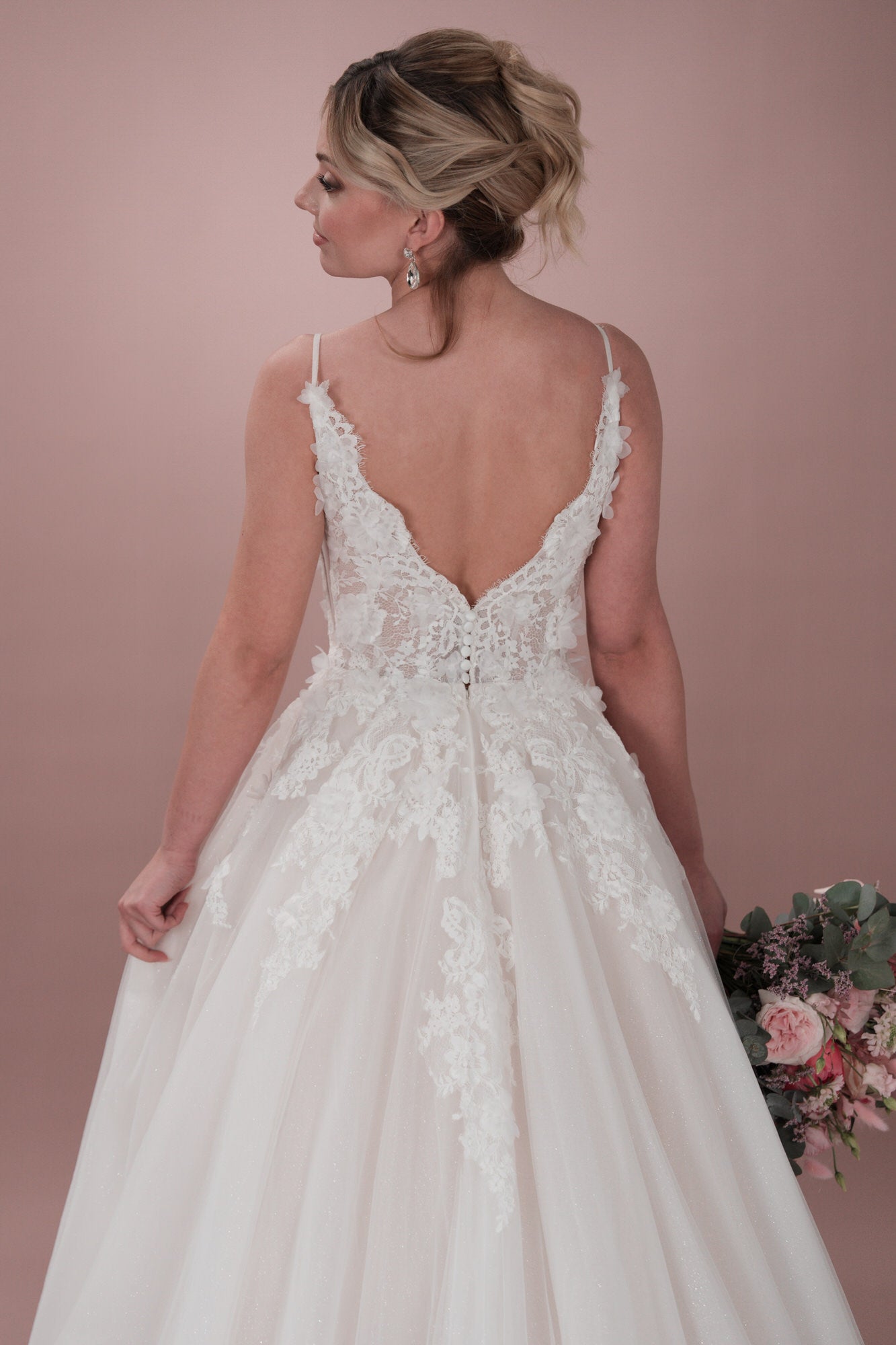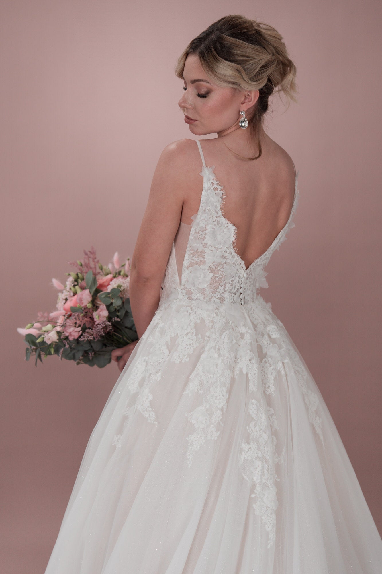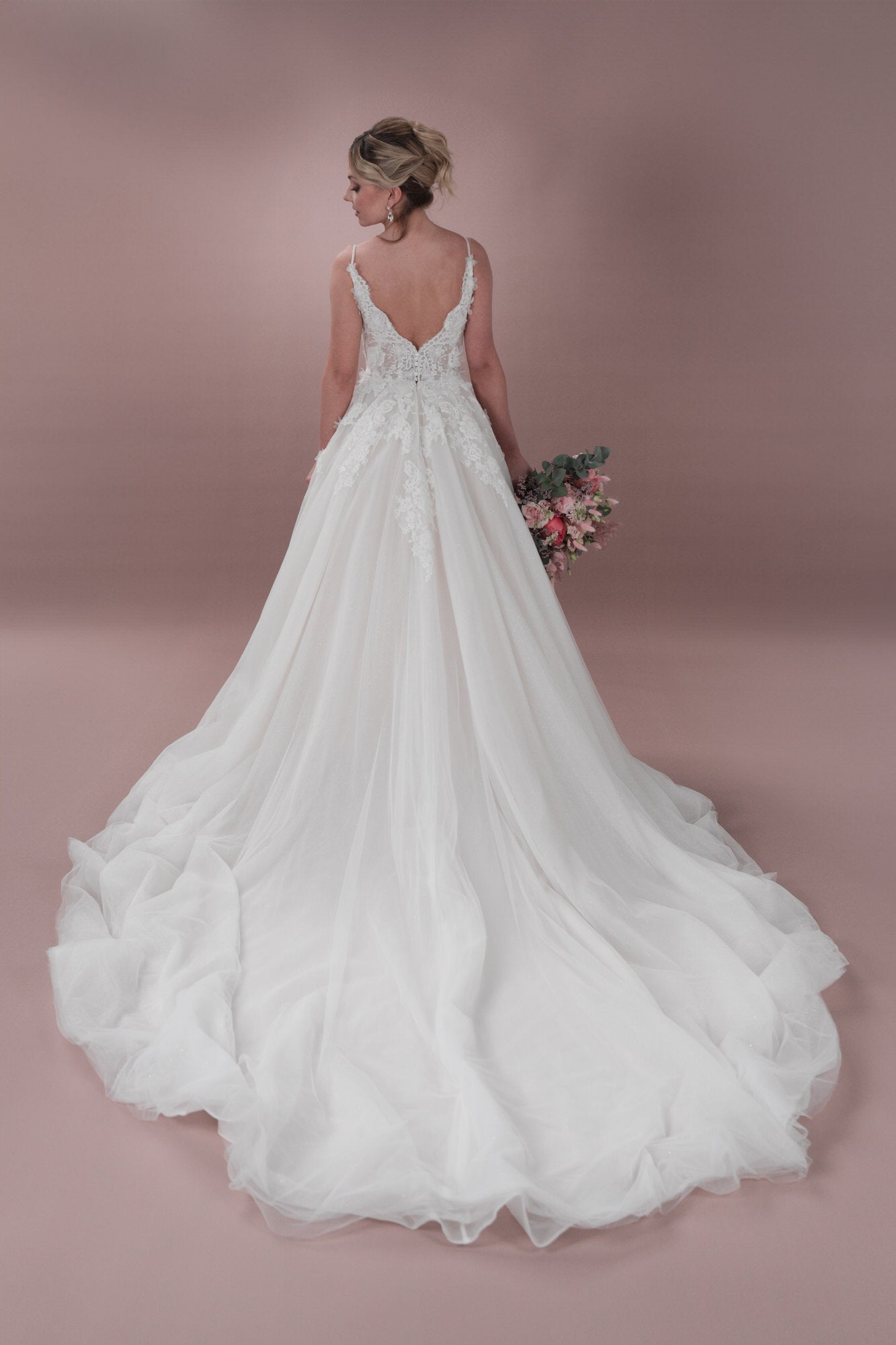 Das Hochzeitskleid C24-26 von Bridonista wird dafür sorgen, dass alle deine romantischen Träume wahr werden! Sein klassisches Design mit V-Ausschnitt, V-Rücken, V-Cutouts und langer Schleppe, die A-Linie und die feine Prinzessinnen-Taille sorgen dafür, dass es allen Körpertypen schmeichelt. Der glitzernde Tüllstoff und der Reißverschluss oder die Spitze geben dem Kleid den letzten Schliff! Ein wunderschönes, maßgeschneidertes Kleid für die Boho-Braut - übernehme deinen besonderen Tag von gewöhnlich zu außergewöhnlich!