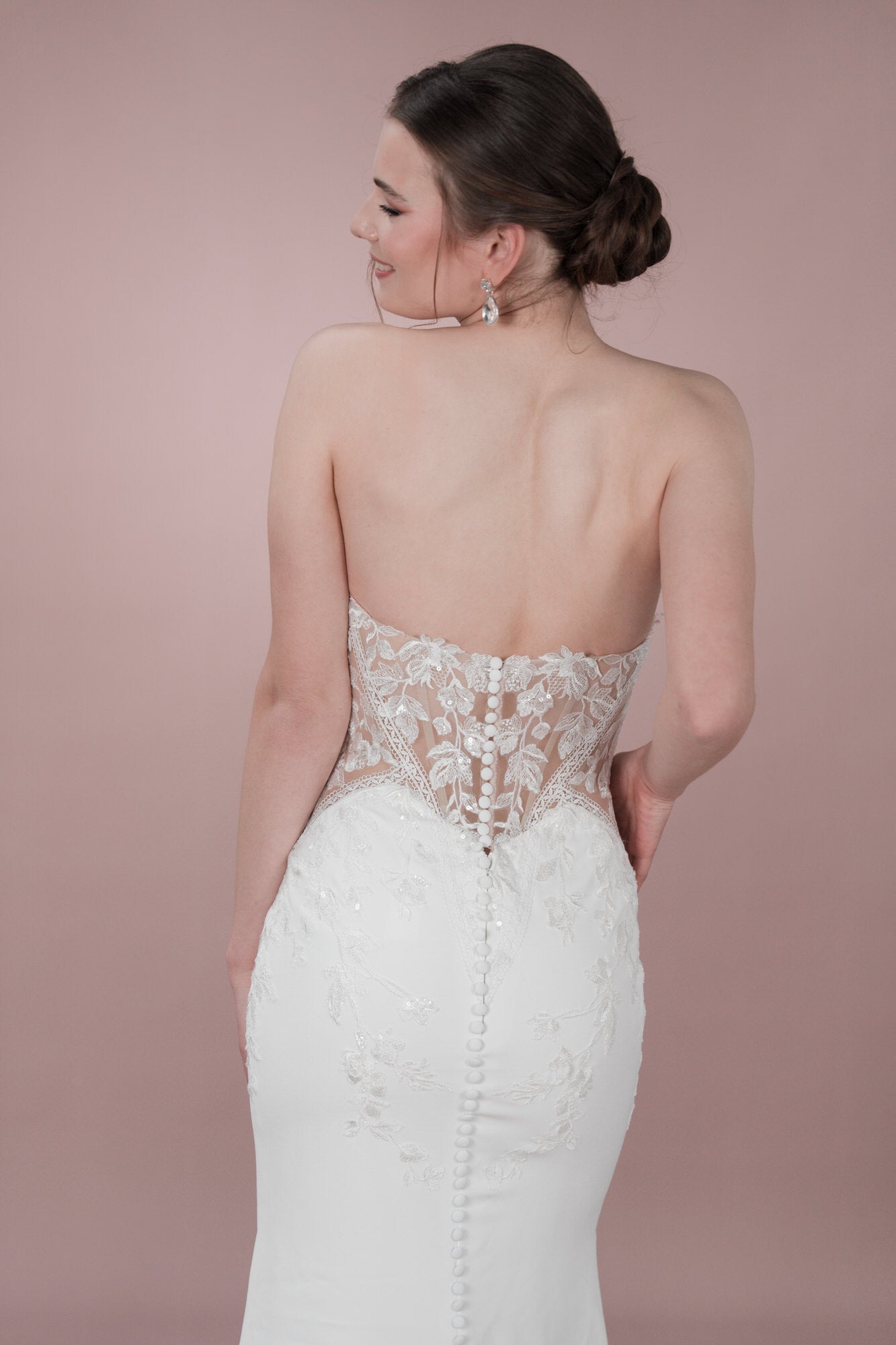 Ein besonderes Highlight des Bridonista Hochzeitskleides ist der Body im Lingerie-Look mit seitlichen Cut-Outs. Diese kleinen Details verleihen dem Kleid einen Hauch von Verführung und setzen deinen Körper gekonnt in Szene.