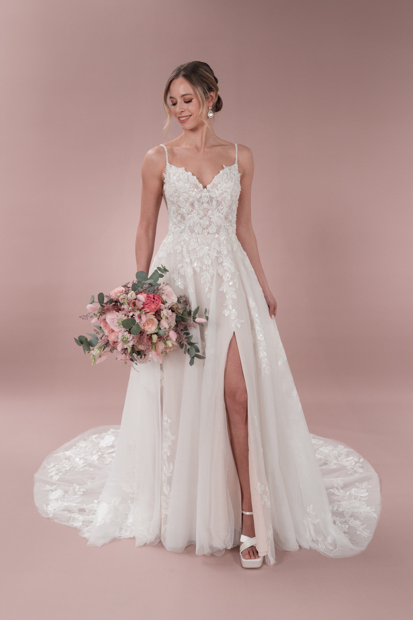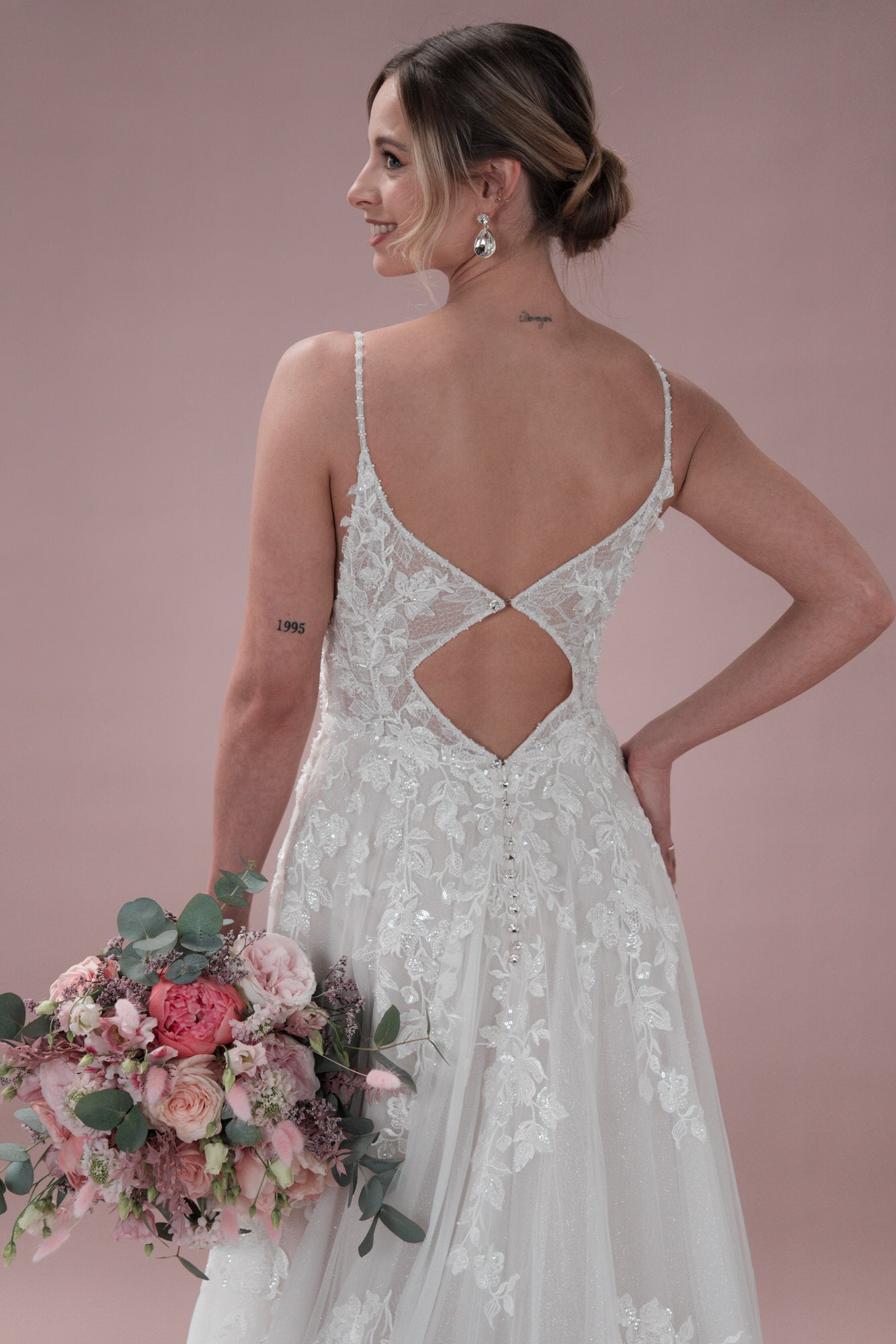 Mach dich bereit, an deinem besonderen Tag eine Bridonista zu sein - mit unserem Hochzeitskleid C24-25! Dieses atemberaubende Brautkleid hat vorne einen V-Ausschnitt und hinten einen Schlüsselloch-Ausschnitt. Die florale Spitze mit Pailletten und Perlen verleiht einen Hauch von Glamour, während die Spaghetti-Träger und Push-up-Cups deine Figur betonen. Wähle zwischen Verzierungen aus Glitzertüll oder Spitze für den perfekten letzten Schliff. Sorge mit unserem Hochzeitskleid C24-25 für einen noch schöneren Tag! Dieses atemberaubende Brautkleid hat nicht nur einen V-Ausschnitt und einen Schlüsselloch-Ausschnitt, sondern betont auch deine Figur mit Push-up-Cups und Spaghetti-Trägern. Und die florale Spitze mit Pailletten und Perlen? Das ist wie ein Hauch von Glitzer und Glamour für deinen besonderen Tag. Außerdem kannst du zwischen Verzierungen aus Glitzertüll oder Spitze wählen, um dem Ganzen den letzten Schliff zu geben. Die Optionen sind einfach zum Verlieben!
