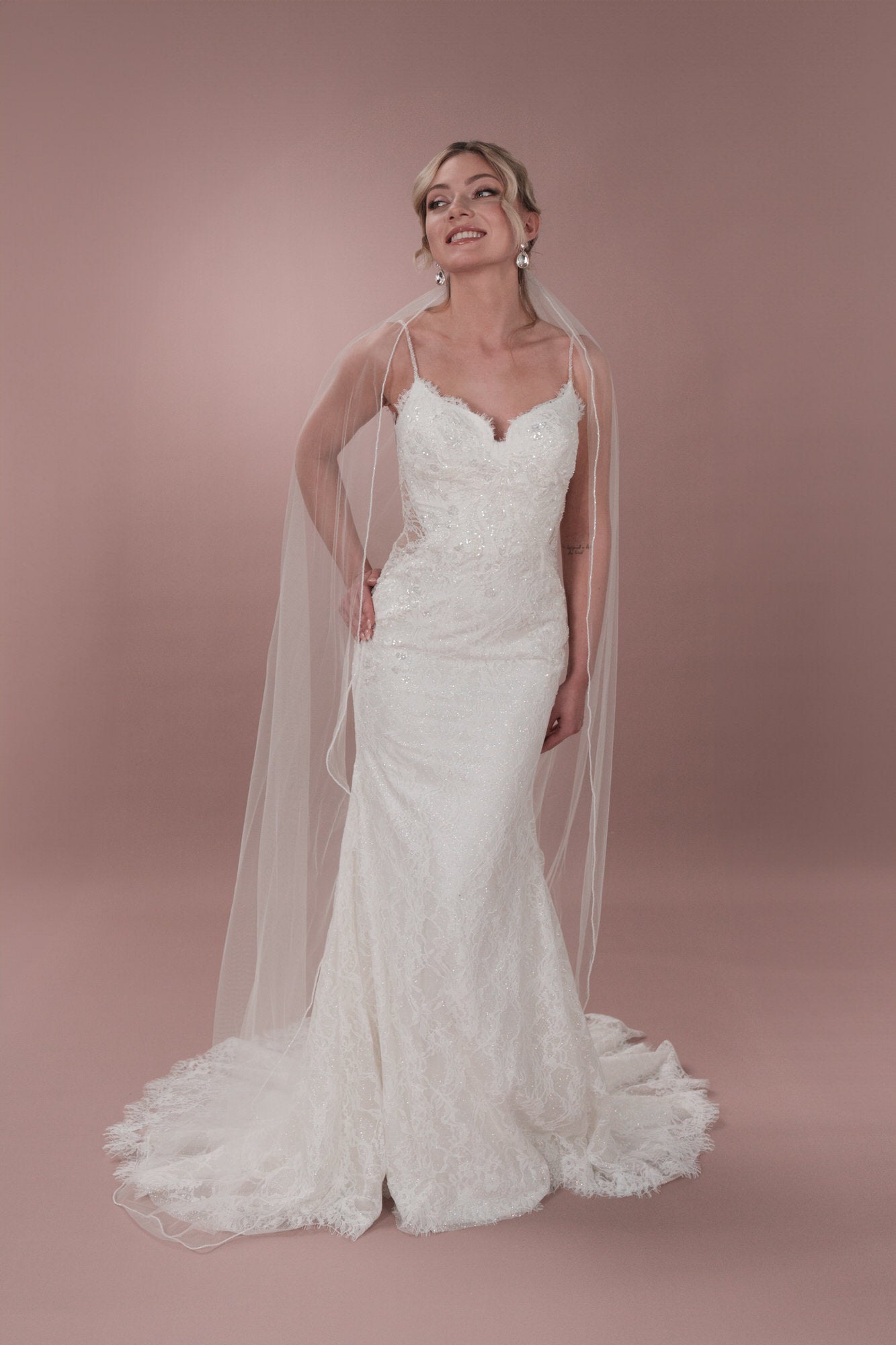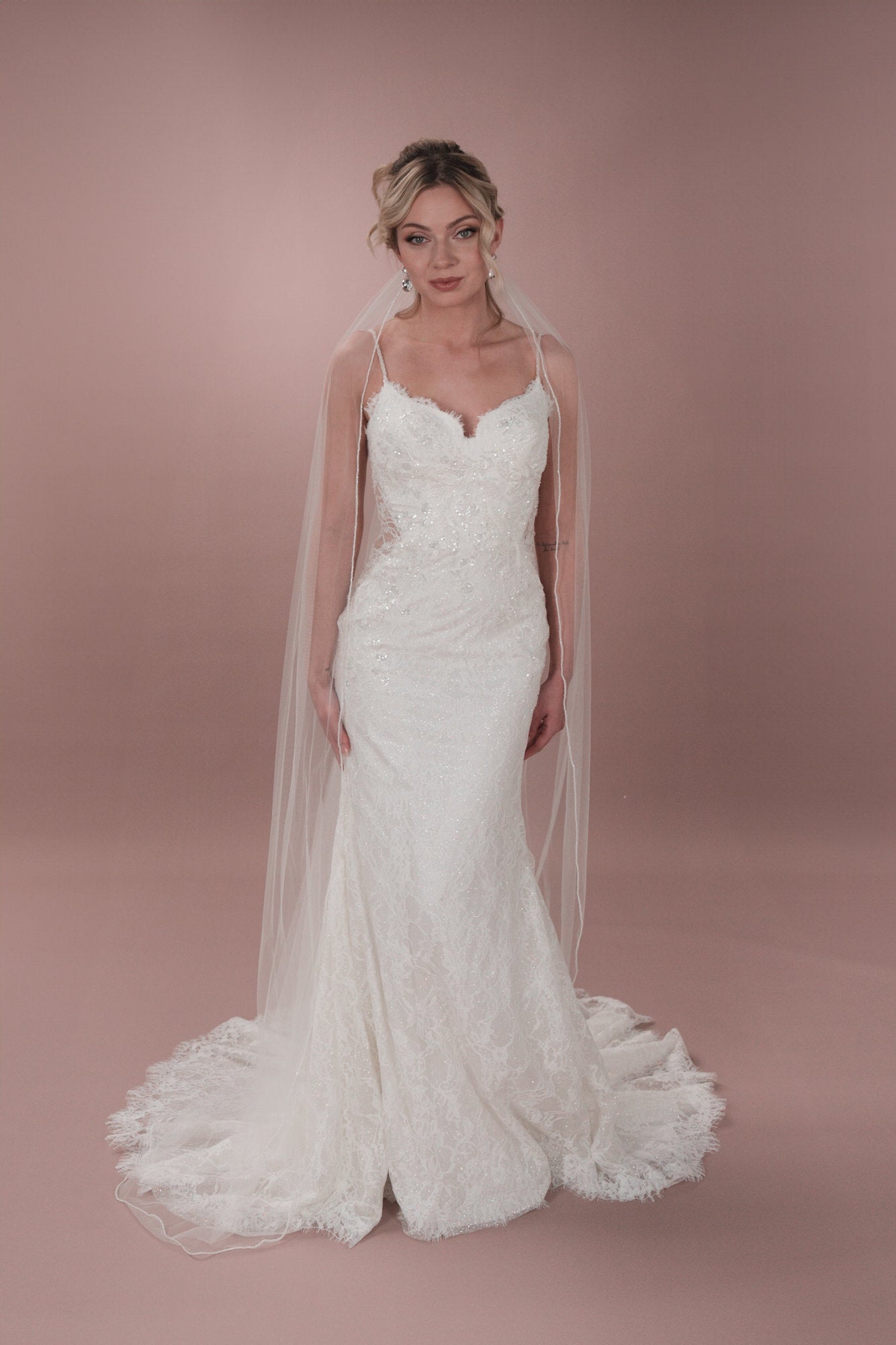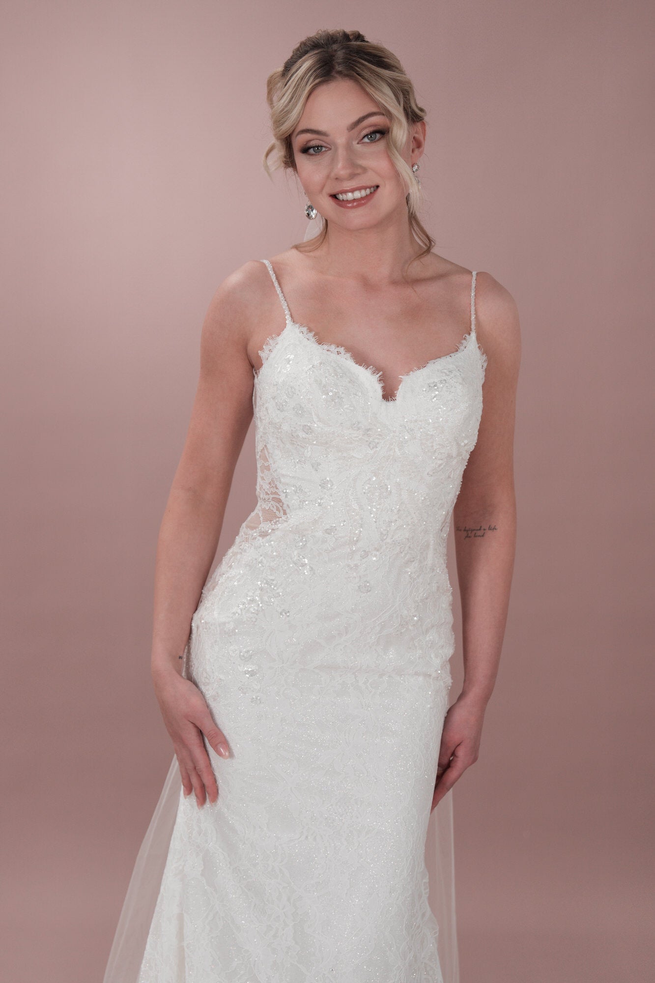 Mit diesem einzigartigen Hochzeitskleid aus Tüll in Fit-and-Flare-Form kannst du deine innere Bridonista zum Vorschein bringen. Es verfügt über wunderschöne Spaghettiträger und einen Herzchen-Ausschnitt vorne sowie einen verspielten V-Ausschnitt am Rücken. Die Chantilly-Spitze verleiht diesem Brautkleid einen Hauch von Eleganz, während die seitlichen Ausschnitte und die Rosshaar-Verarbeitung einen Hauch von Spaß in dieses wunderschöne Kleid bringen. Für einen Hauch von Glitzer kannst du hochpigmentierten Glitzertüll hinzufügen oder es ganz klassisch mit den Knöpfen und Schleifen in der Corsage halten. In jedem Fall wird dieses Kleid dafür sorgen, dass du an deinem besonderen Tag auffällst! Sorge an deinem großen Tag für ein Statement mit unserem einzigartigen Hochzeitskleid aus Tüll in Fit-and-Flare-Form. Du wirst die feinen, mit Perlen besetzten Spaghetti-Träger und den verspielten V-Ausschnitt im Rücken lieben. Die elegante Chantilly-Spitze verleiht diesem Brautkleid einen Hauch von Klasse, während die seitlichen Ausschnitte und die Rosshaar-Finishs diesem atemberaubenden Kleid ein lustiges Element verleihen. Der hochpigmentierte Glitzertüll sorgt für einen Hauch von Glanz, während die Knöpfe und Schleifen für einen zeitlosen Look sorgen. In jedem Fall wirst du die Show stehlen!