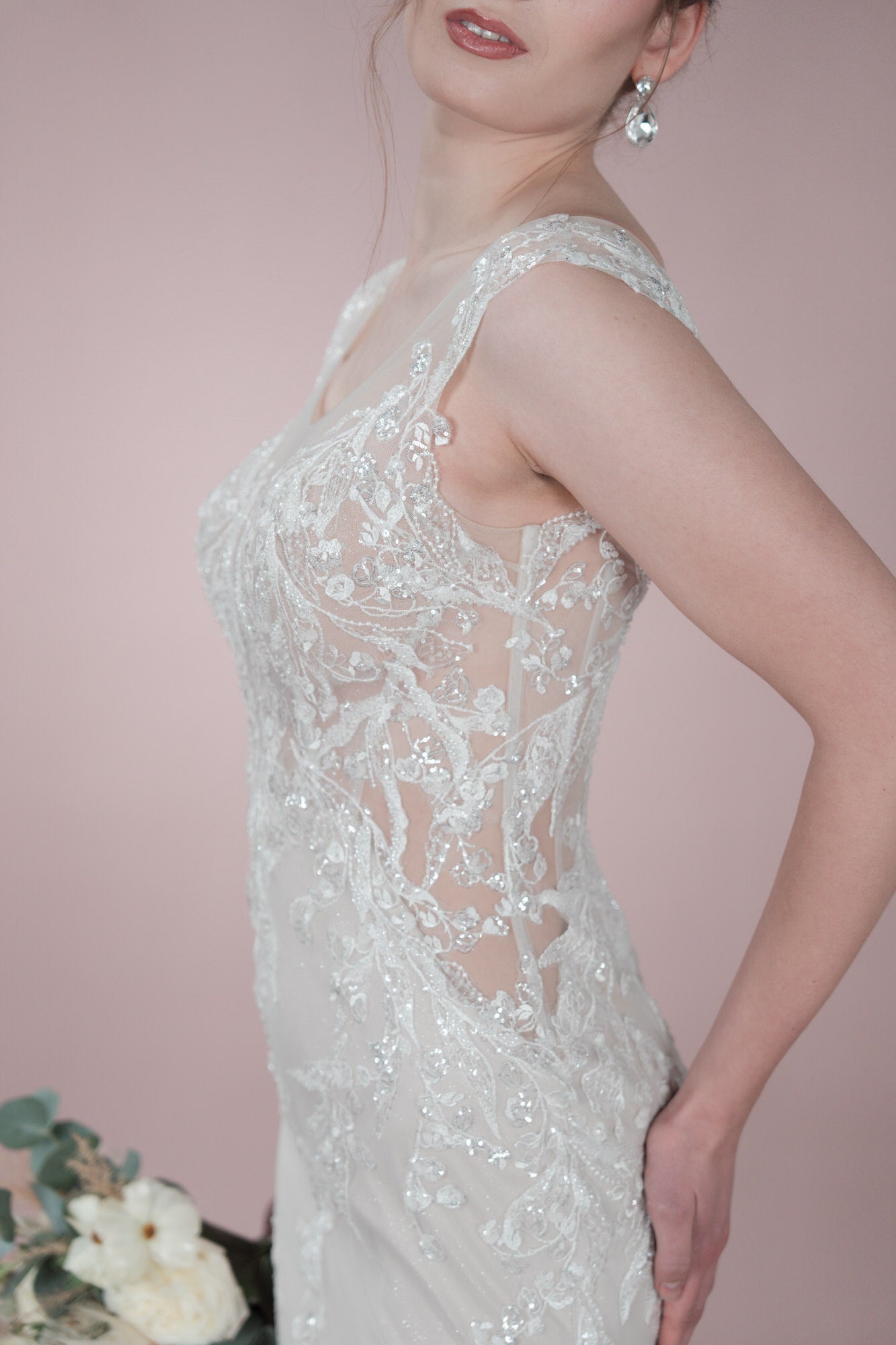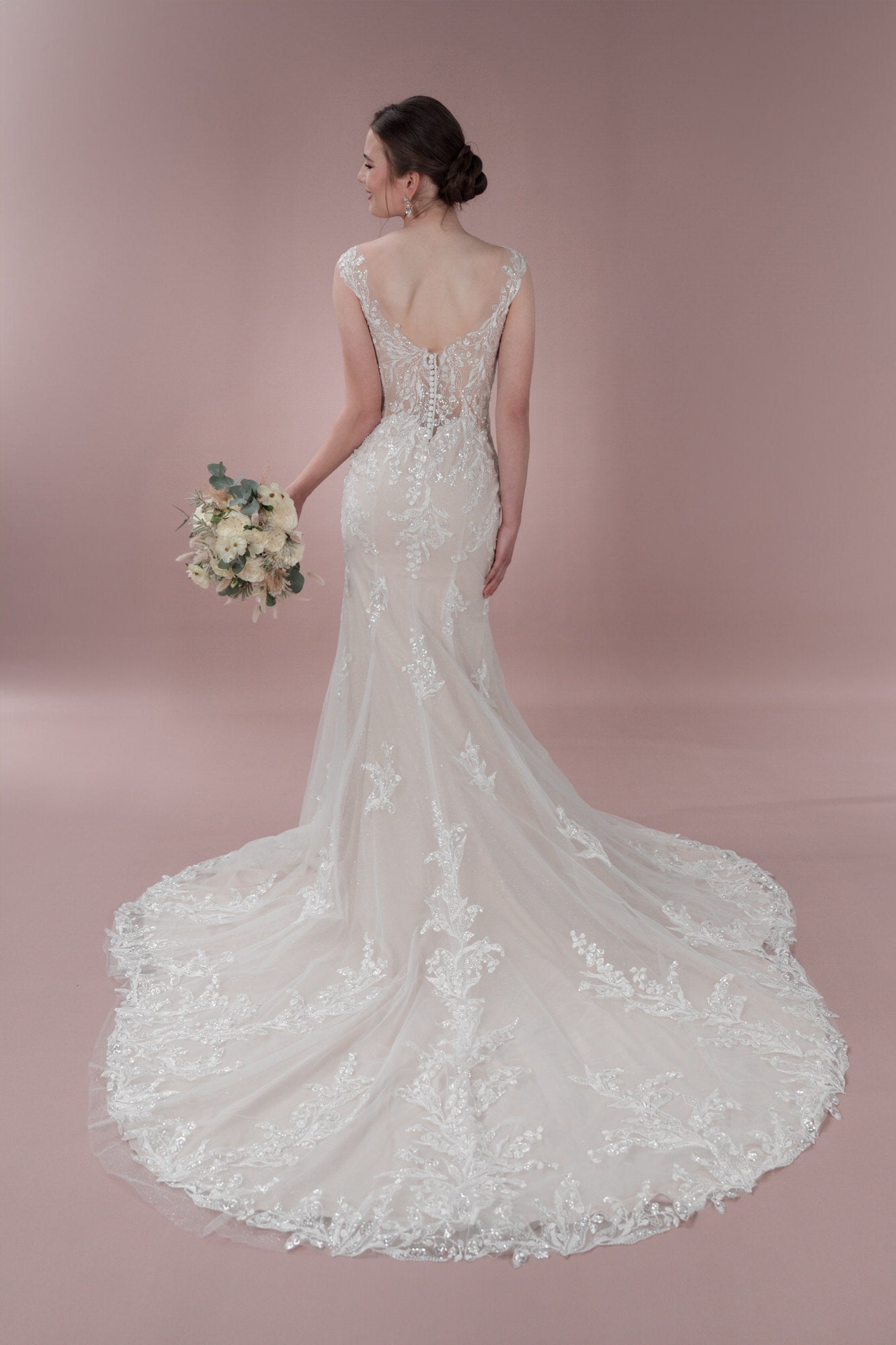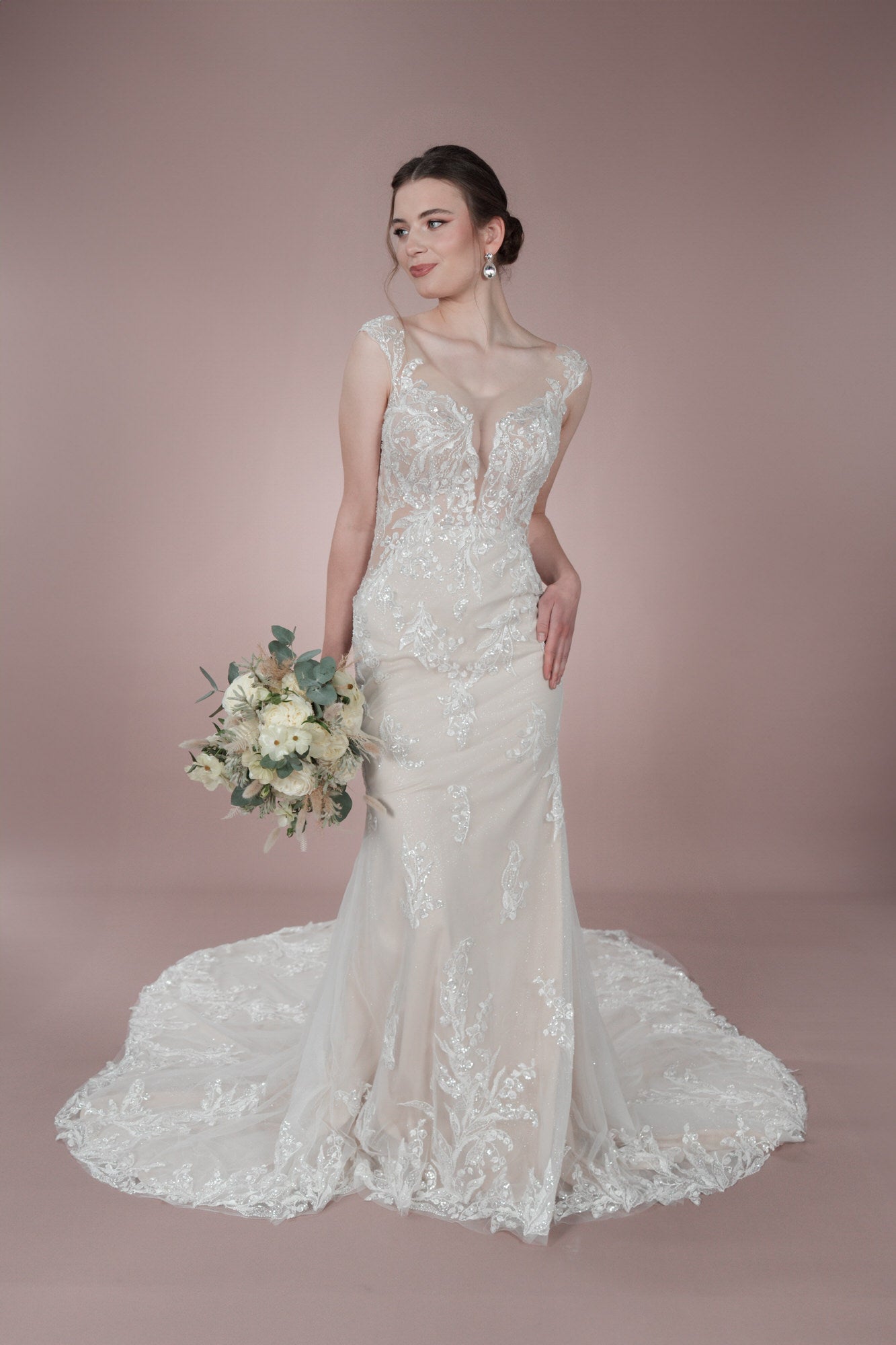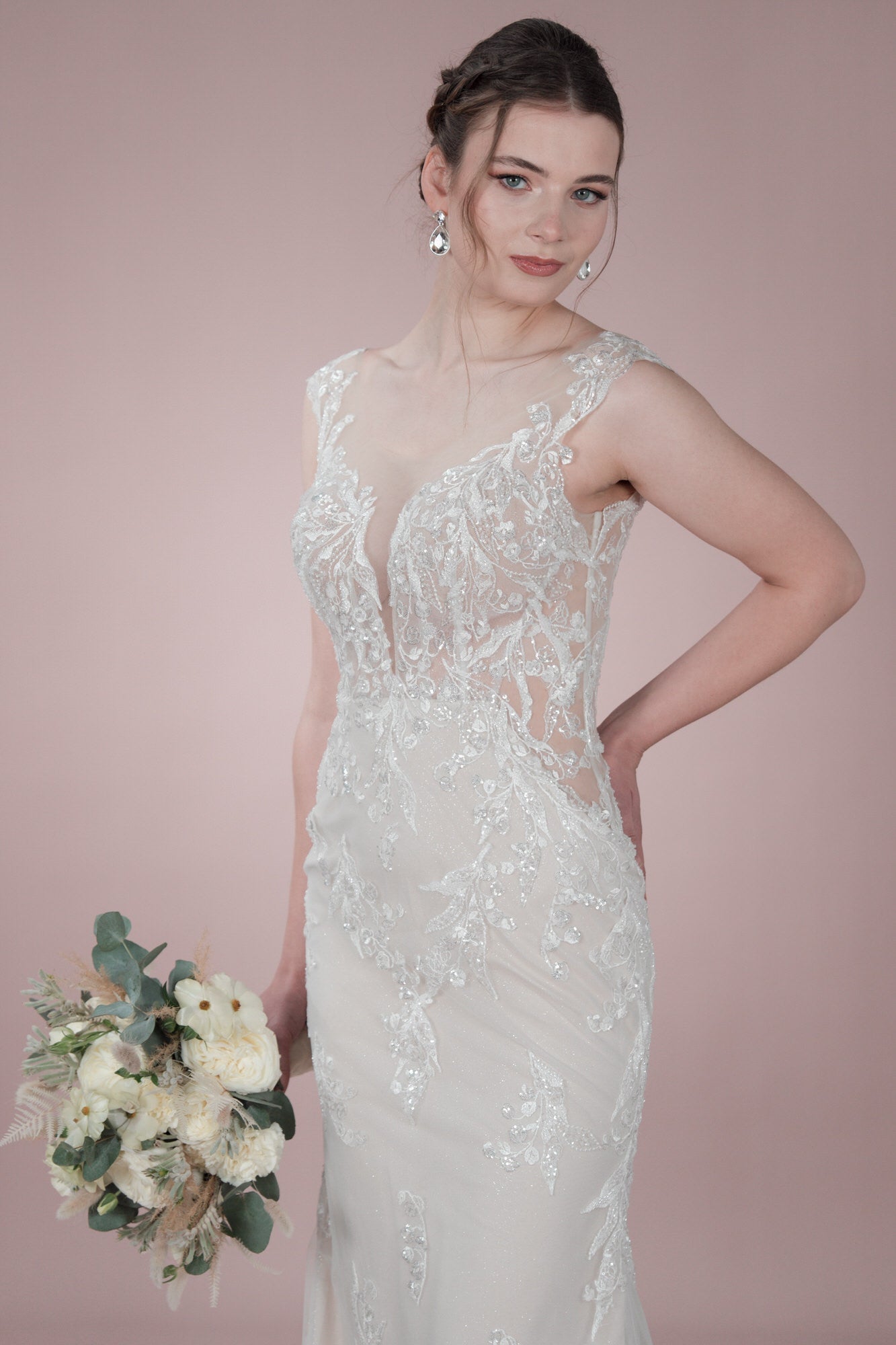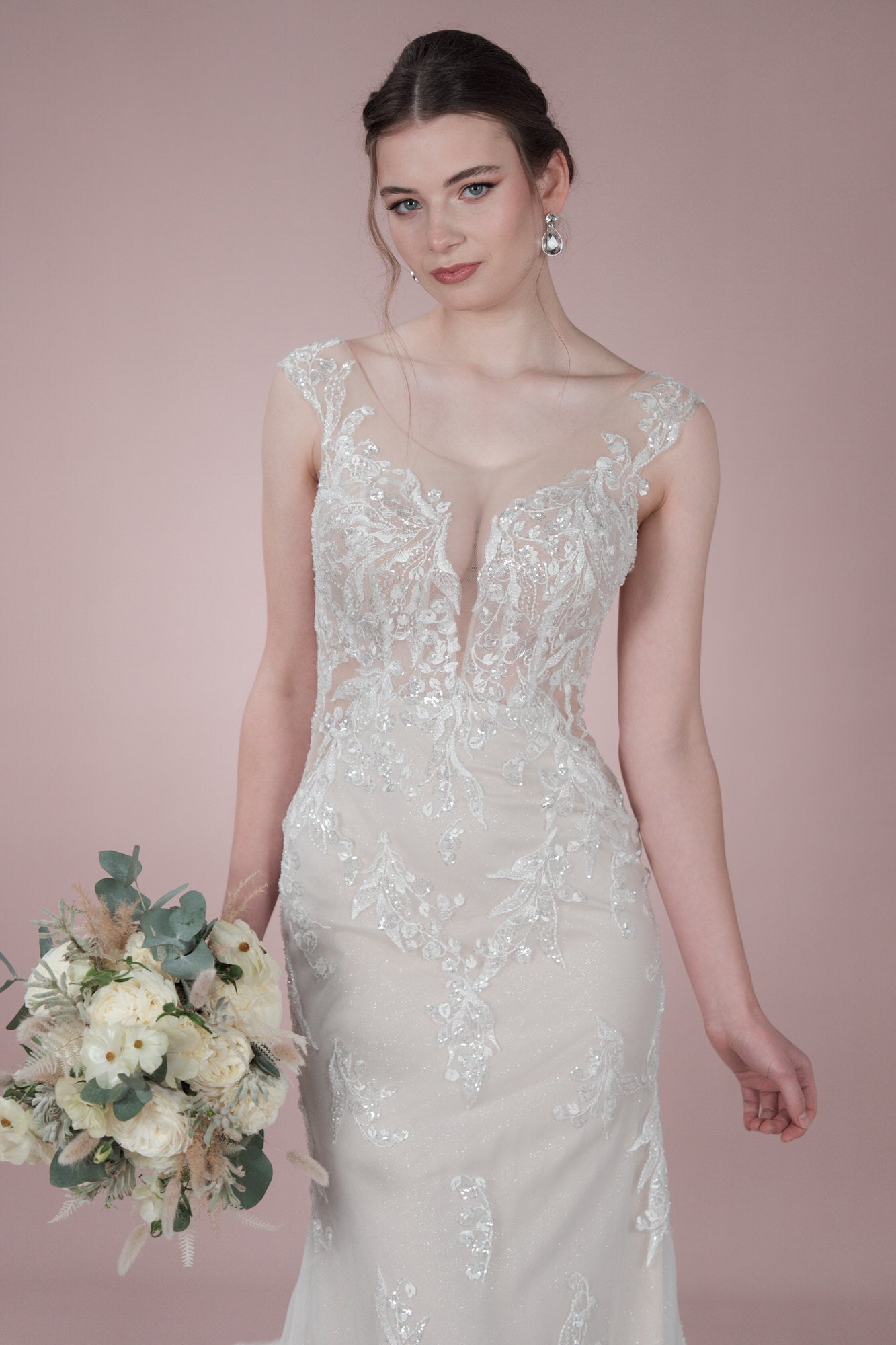 Mit unserem Bridonista Hochzeitskleid aus Tüll in Fit & Flare-Form mit Spitzenträgern und Illusionstüll wirst du alle Blicke auf dich ziehen. Die Carmen-Ausschnitte vorne und hinten sorgen für einen Hauch von Eleganz, während die florale Spitze mit Pailletten und Perlen für einen atemberaubenden und einzigartigen Look sorgt. Erhältlich mit oder ohne Glitzer-Tüll für zusätzlichen Glanz. Mit 12 Stäbchen und seitlichen Ausschnitten bietet dieses Kleid die perfekte Passform. Außerdem hat es Knöpfe und Schlaufen an der Corsage und einen Reißverschluss am Rock für ein einfaches An- und Ausziehen. Mittlere Schleppe (80 cm). Mit unserem Bridonista Hochzeitskleid kannst du deinen besonderen Tag aufwerten! Dieses elegante Brautkleid hat eine Fit & Flare-Form aus Tüll mit Trägern aus Spitze und Illusionstüll für einen atemberaubenden und einzigartigen Look. Die Carmen-Ausschnitte vorne und hinten verleihen dem Kleid einen Hauch von Eleganz! Mit seinen 12 Stäbchen und den seitlichen Ausschnitten bietet dieses Kleid den perfekten Sitz und Komfort. Und für zusätzlichen Glanz wählst du die Option mit Glitzer-Tüll. Mit Knöpfen und Schlaufen an der Corsage und einem Reißverschluss am Rock ist dieses Kleid perfekt, um die ganze Nacht durchzutanzen!