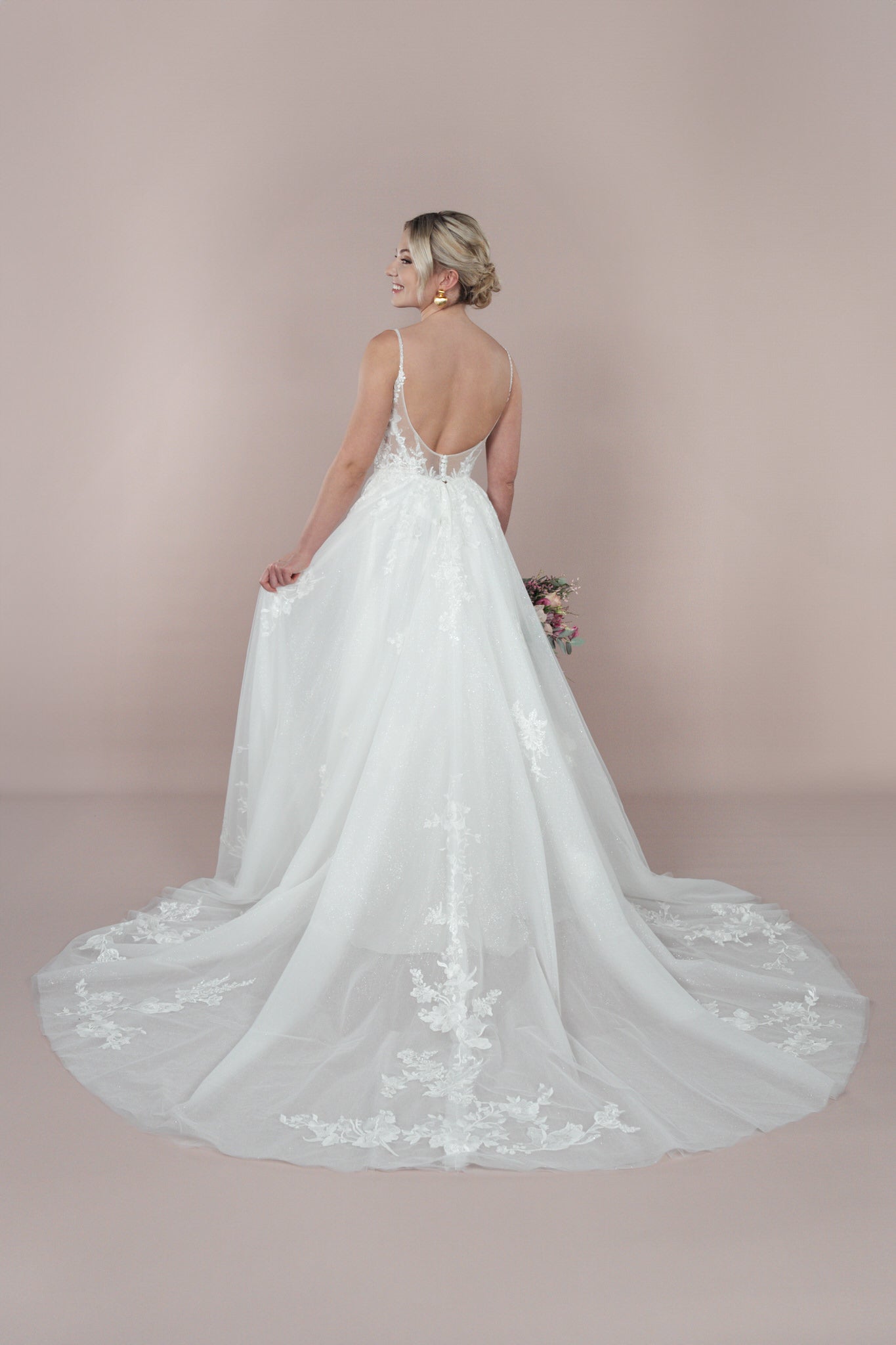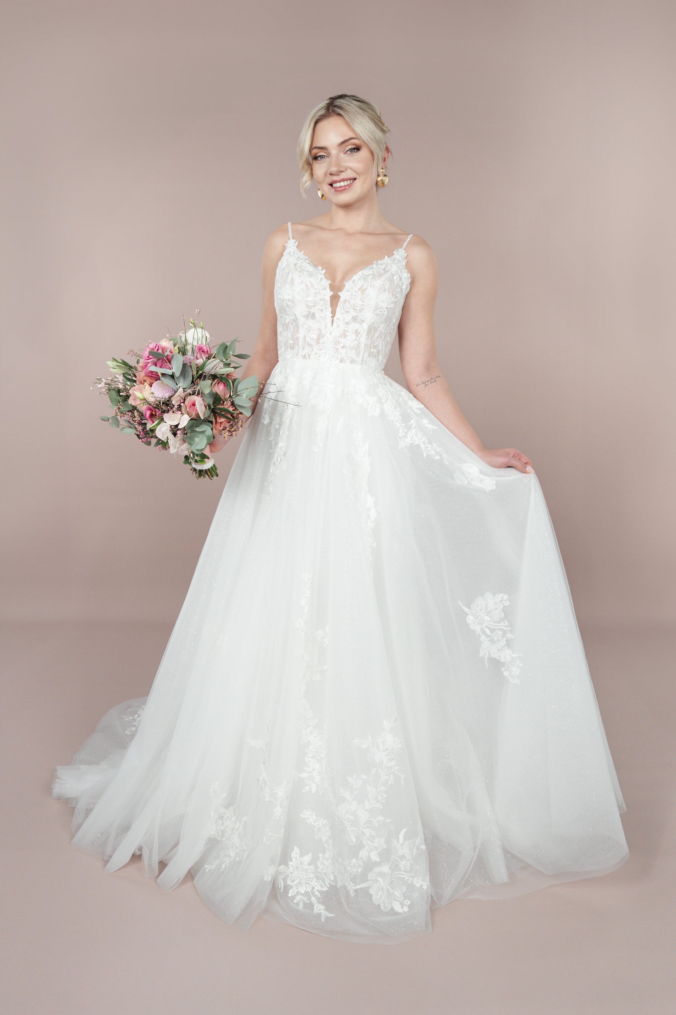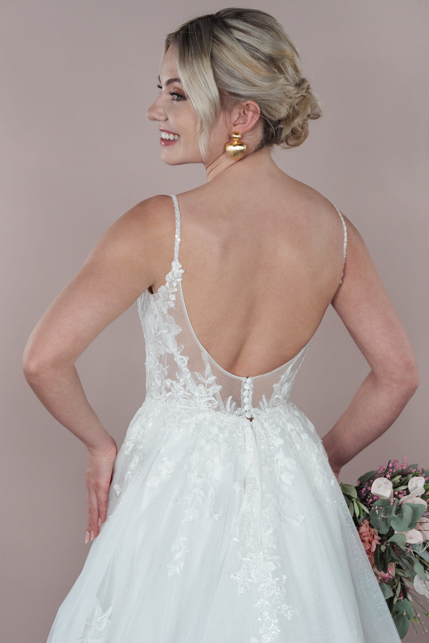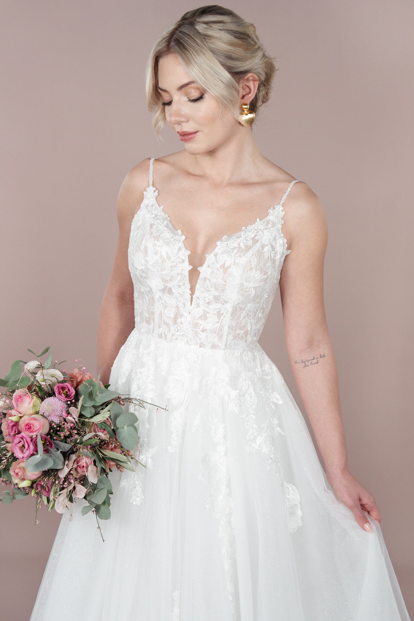 Die zarten Spaghetti-Träger sorgen nicht nur für einen bequemen Halt, sondern tragen auch zur verspielten Eleganz des Kleides bei. Sie fügen sich harmonisch in das Gesamtbild ein und ermöglichen es dir, dich an deinem großen Tag vollkommen wohlzufühlen.