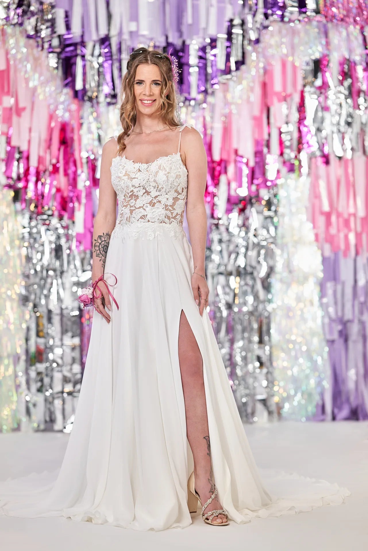 Übernehme den Traualtar an deinem besonderen Tag stilvoll mit dem ID23-08(C)! Dieses einzigartige Hochzeitskleid hat ein feines Oberteil mit Spaghetti-Trägern, das mit Spitze verziert ist und von einem wunderschönen Chiffonrock ergänzt wird - ein wirklich zeitloser Look. Der A-Linien-Schnitt im Boho-Vintage-Stil, der stilvolle Schlitz und die strandfreudige Ausstrahlung sorgen dafür, dass deine Gäste bei diesem Look nicht "Ich will" sagen werden. Heirate in dieser zeitlosen Schönheit!