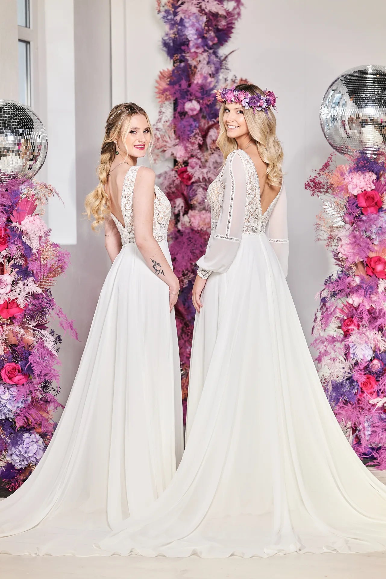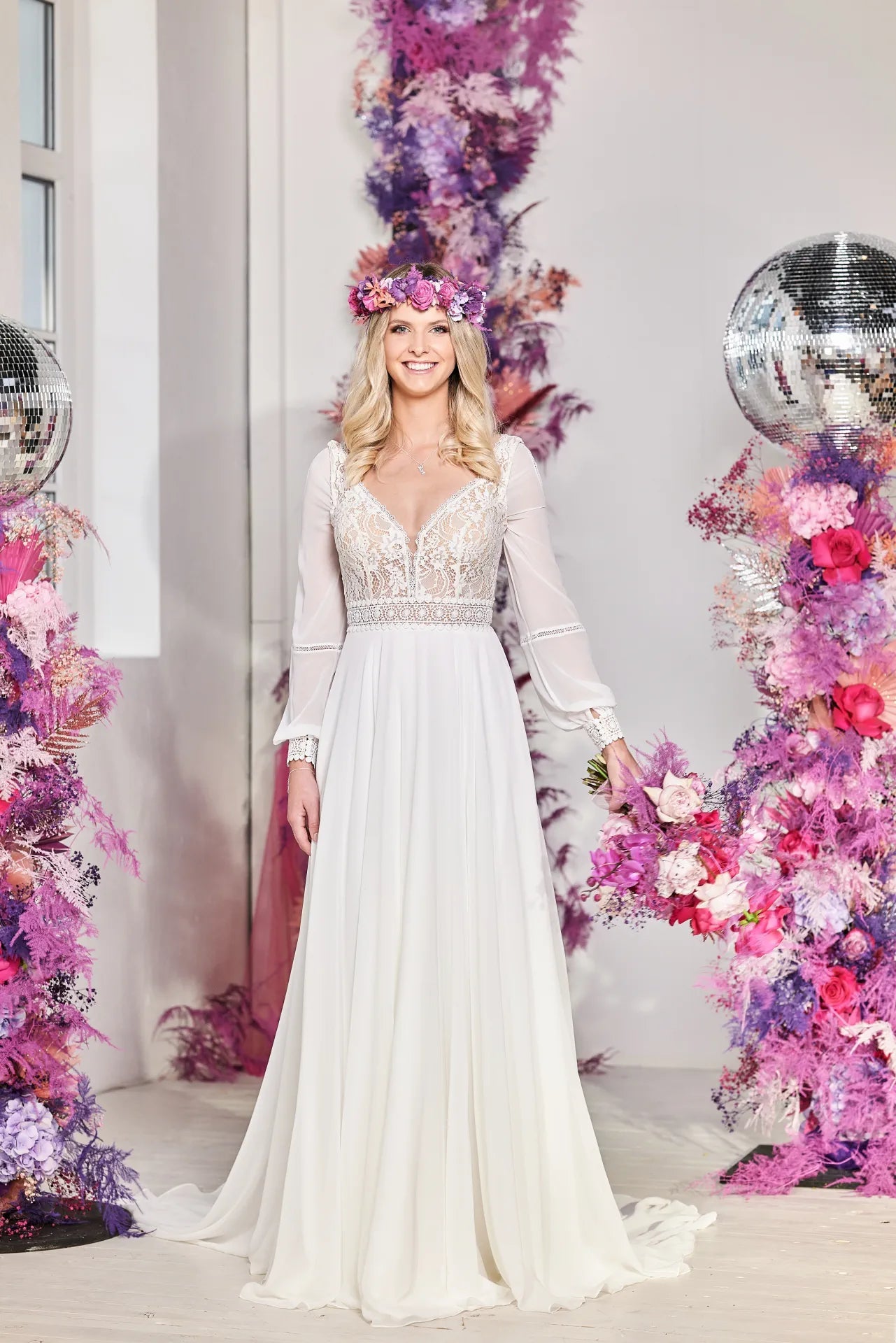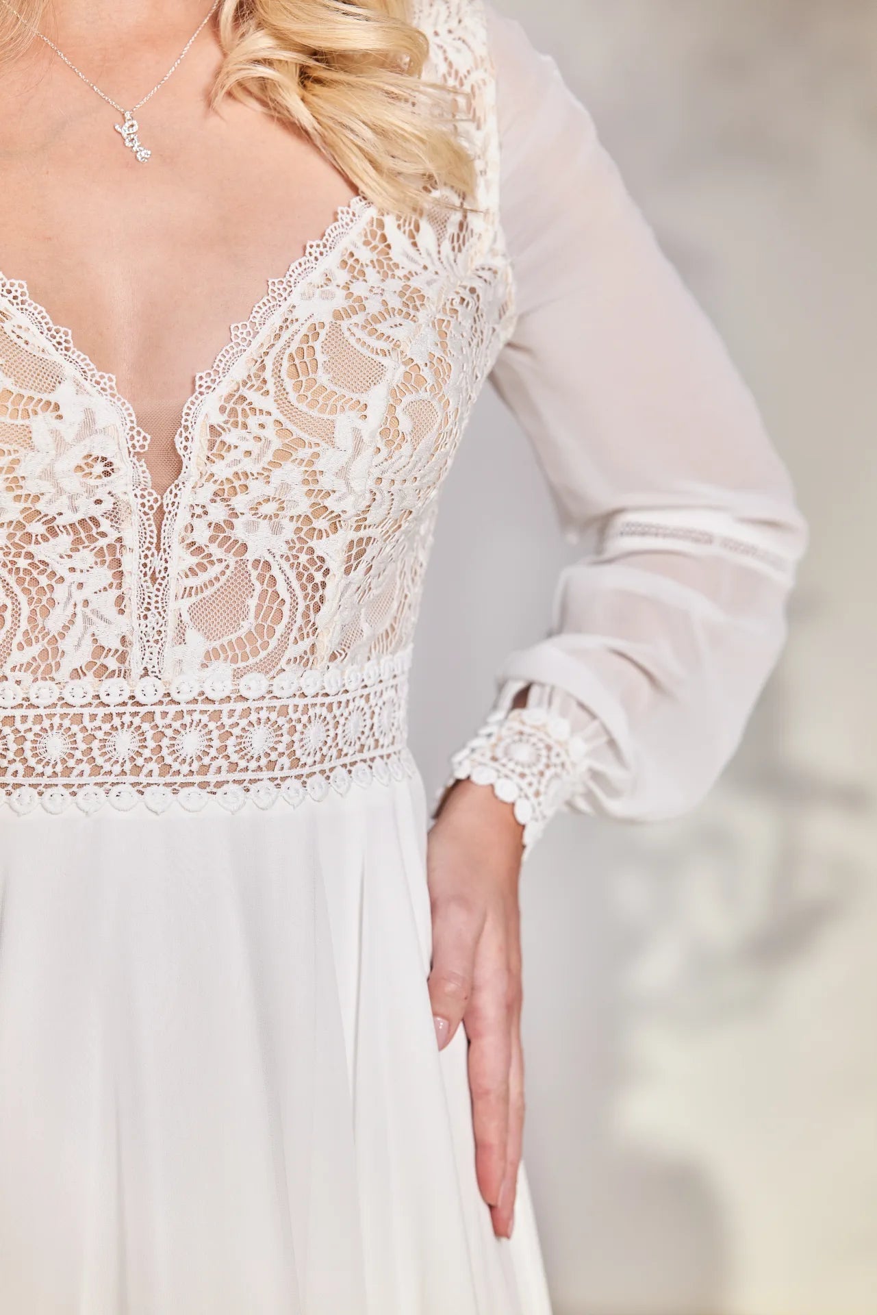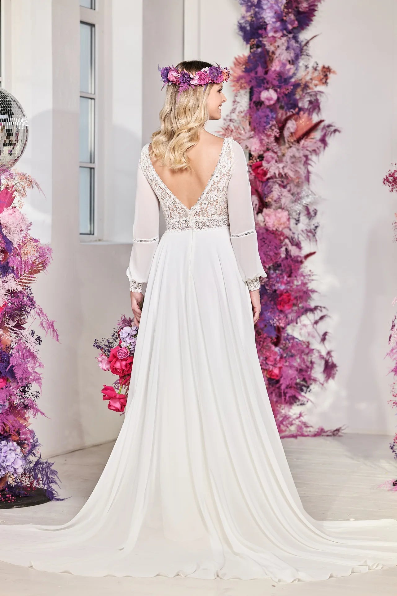 Fühle dich wunderschön, sehe modisch aus und fühle dich wohl in unserem meistverkauften Hochzeitskleid ID23-12(C)! Von Spitze über Chiffon bis hin zu strandfreudigem Boho-Vintage - dieser Stunner mit A-Linie und V-Ausschnitt hat alles, was du brauchst, einschließlich Ärmel und V-Ausschnitt am Rücken. Außerdem ist es umstandslos tragbar, so dass du stilvoll "Ich will" sagen kannst!