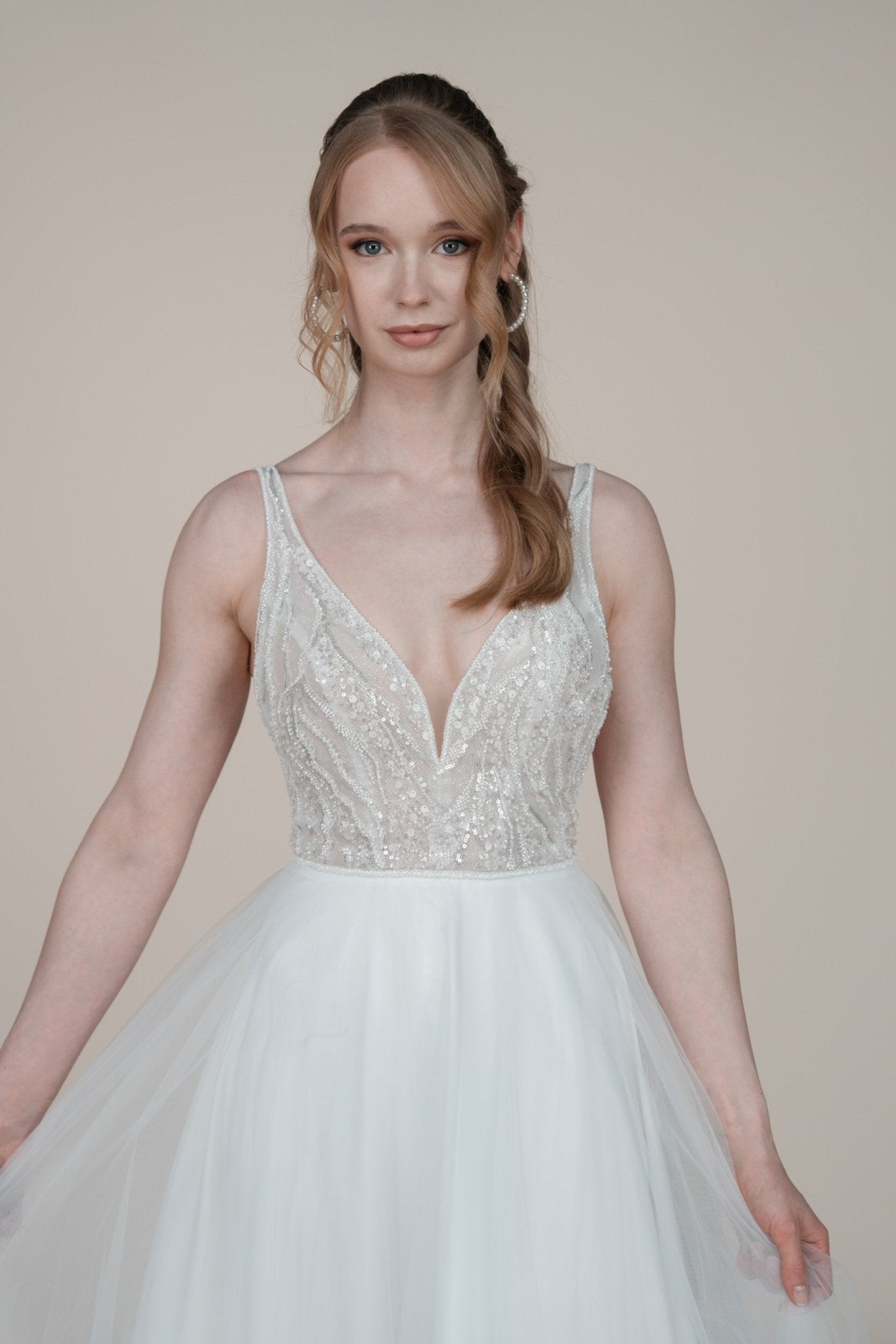 Glänze an deinem großen Tag mit dem Hochzeitskleid ID25-05. Dieses Bridonista-Kleid hat eine moderne A-Linien-Silhouette, auffällige Pailletten und glamouröse Details wie Perlen, Glitzer und Perlen. Der V-Ausschnitt, der V-Rücken und die V-Ausschnitte verleihen ihm einen Hauch von Vintage-Charme, während der Tüllrock und die Cutouts ihm einen verspielten Touch verleihen. Sag stilvoll "Ja" mit dieser wunderschönen Boho-Hochzeit. (Nur 50 Wörter, aber vielleicht kannst du bei Bedarf mehr übernehmen) Lass deinen persönlichen Stil an deinem besonderen Tag in dem Hochzeitskleid ID25-05 erstrahlen. Die A-Linien-Silhouette ist modern und schmeichelhaft, während die auffälligen Details wie Pailletten, Perlen, Glitzer und Perlen einen Hauch von Glam verleihen. Der Vintage-Charme und die verspielten Cutouts sorgen dafür, dass es eine einzigartige Wahl ist, perfekt für die Boho-Braut.