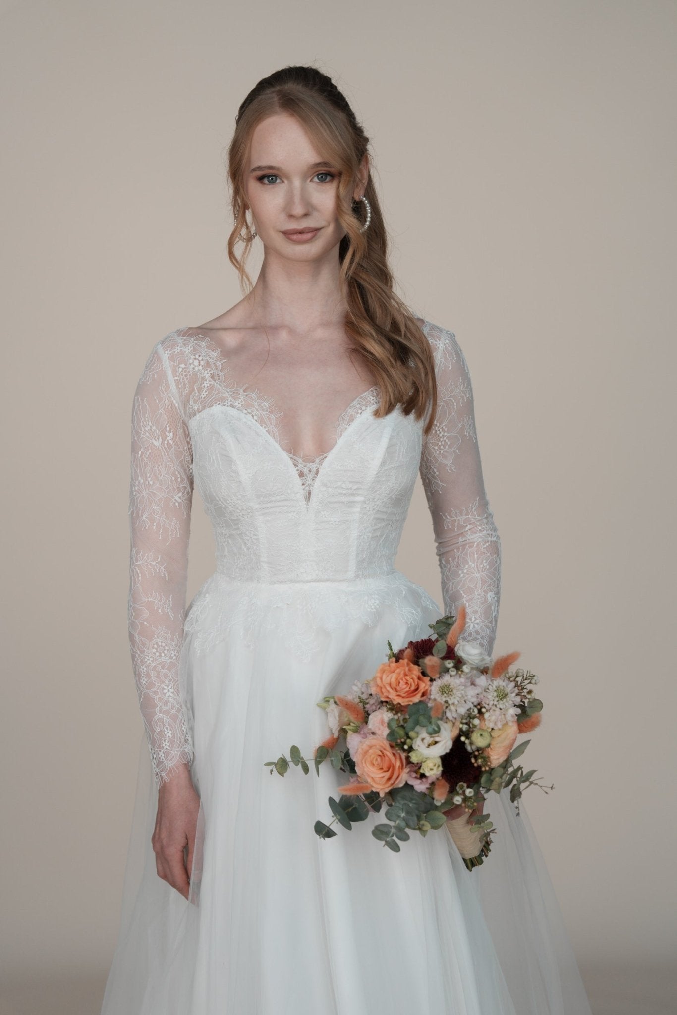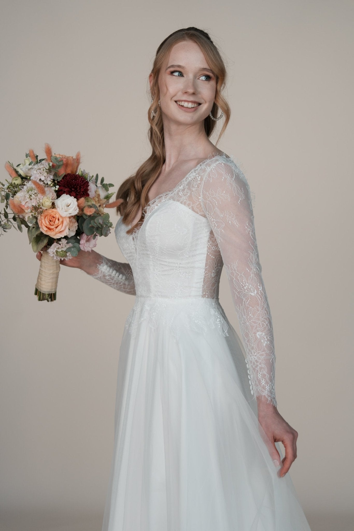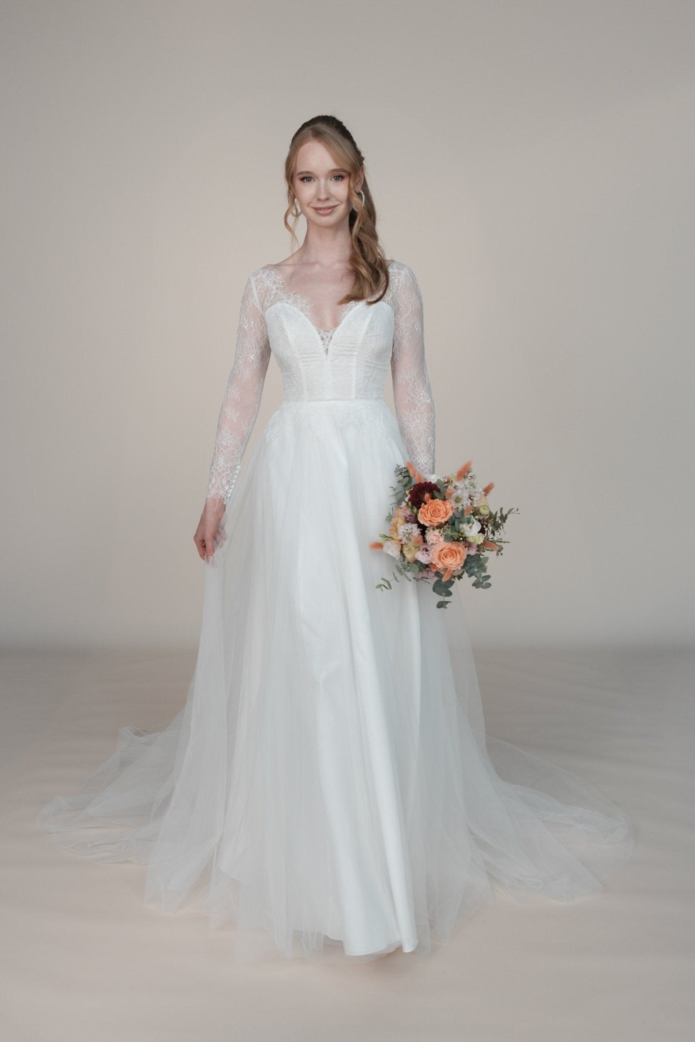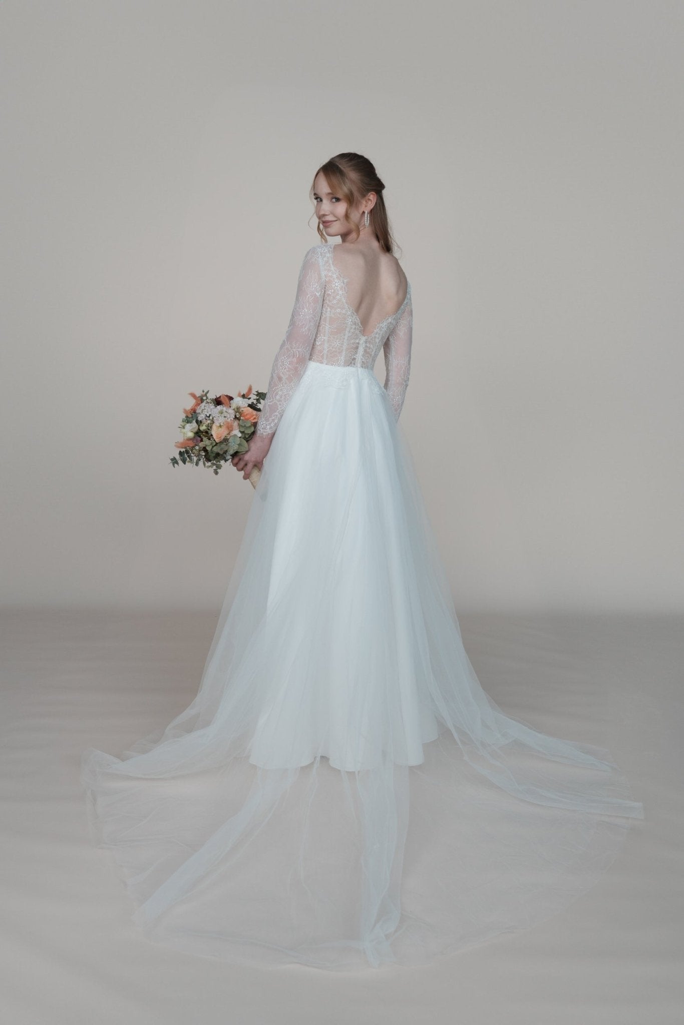 Tanze die Nacht durch in dem Bridonista Hochzeitskleid aus unserer ID-Kollektion. Dieses moderne A-Linienkleid hat einen atemberaubenden V-Rücken und einen V-Ausschnitt, der mit feiner Chantilly-Spitze verziert ist. Die transparenten Ärmel verleihen dem Kleid einen Hauch von Glamour und Romantik, während der Tüllrock für einen verspielten Twist sorgt. Perfekt für die schrullige und lustige Braut. Mit dem Bridonista Hochzeitskleid aus unserer ID-Kollektion kannst du die ganze Nacht durchtanzen! Dieses moderne A-Linienkleid ist der wahr gewordene Traum jeder schrulligen und lustigen Braut. Der atemberaubende V-Rücken und der V-Ausschnitt, der mit feiner Chantilly-Spitze verziert ist, werden dich wie eine echte Bridonista fühlen lassen. Und mit den transparenten Ärmeln, die für einen Hauch von Glamour und Romantik sorgen, und dem verspielten Tüllrock ist dieses Kleid die perfekte Mischung aus Stil und Spaß. Gib dich nicht mit einem traditionellen Hochzeitskleid zufrieden - sei eine Bridonista!
