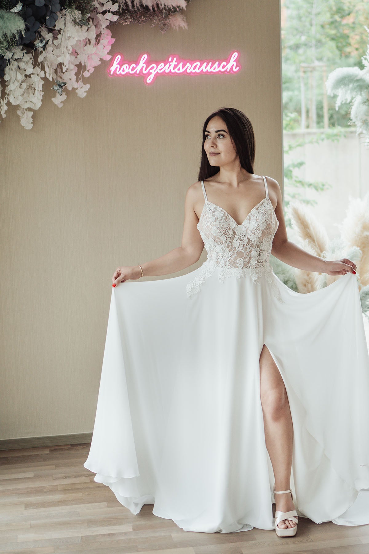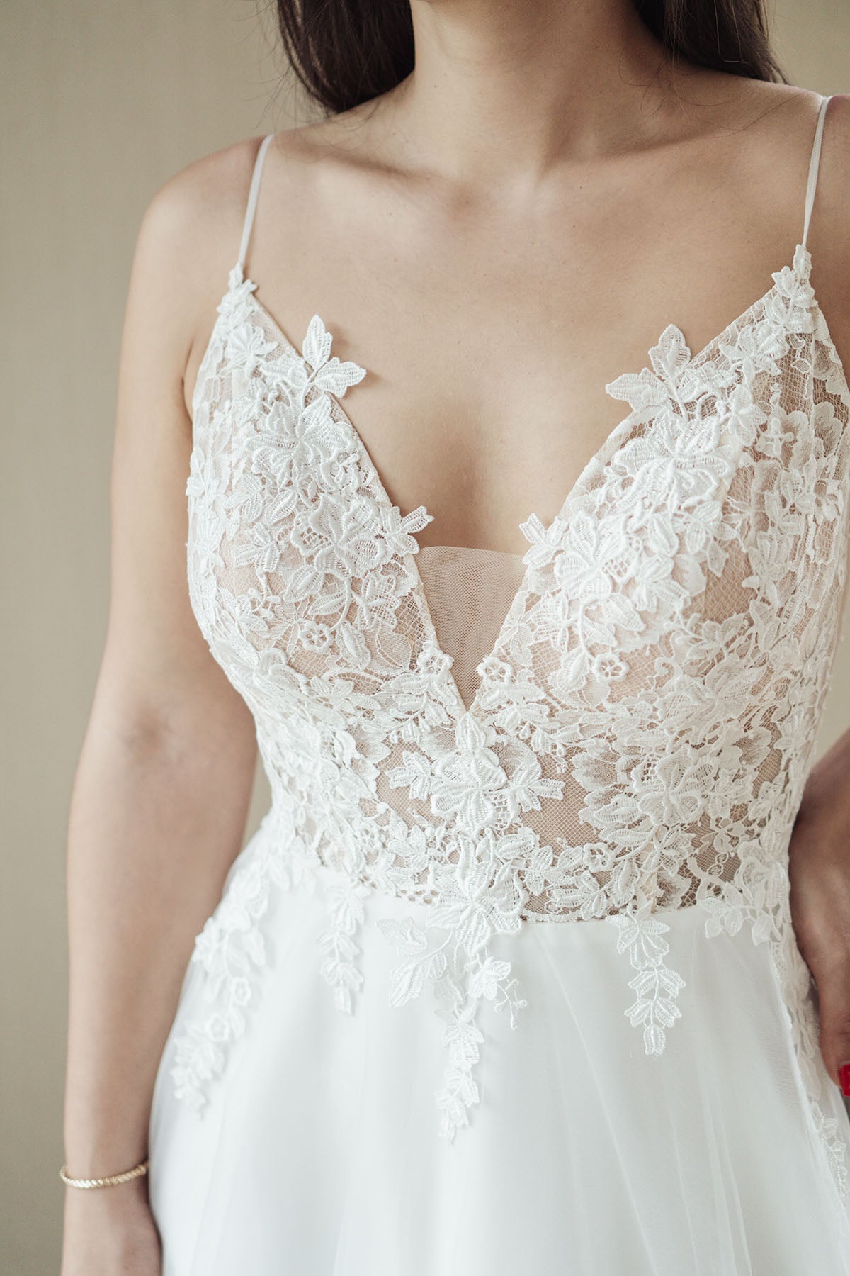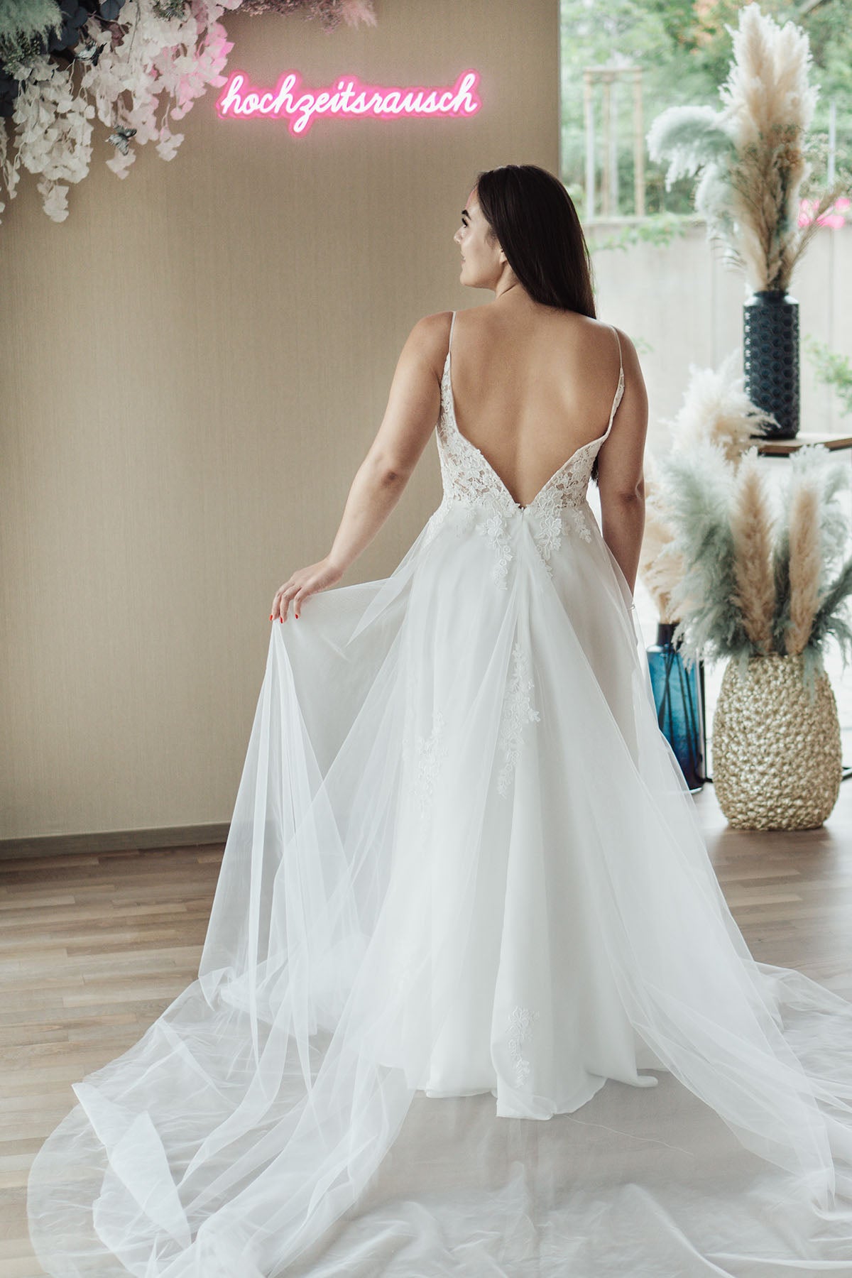Corsage: Spitze in Ivory/ Tüll in Ivory - Rock: Chiffon + Futter in Ivory. Dieses Brautkleid ist komplett in Ivory geschneidert.