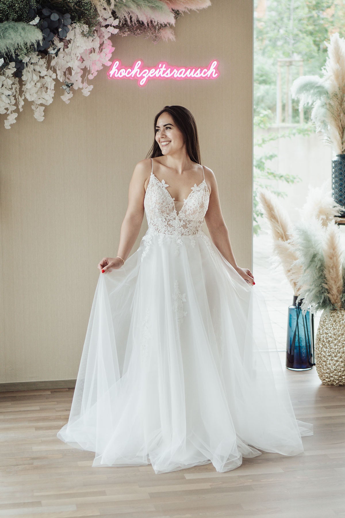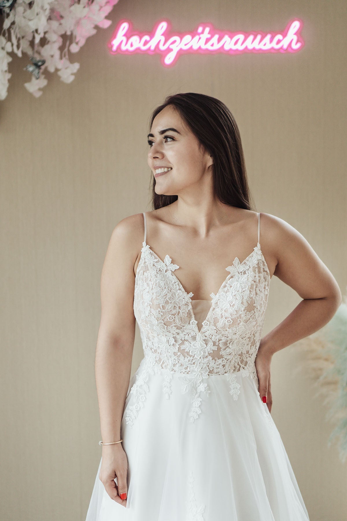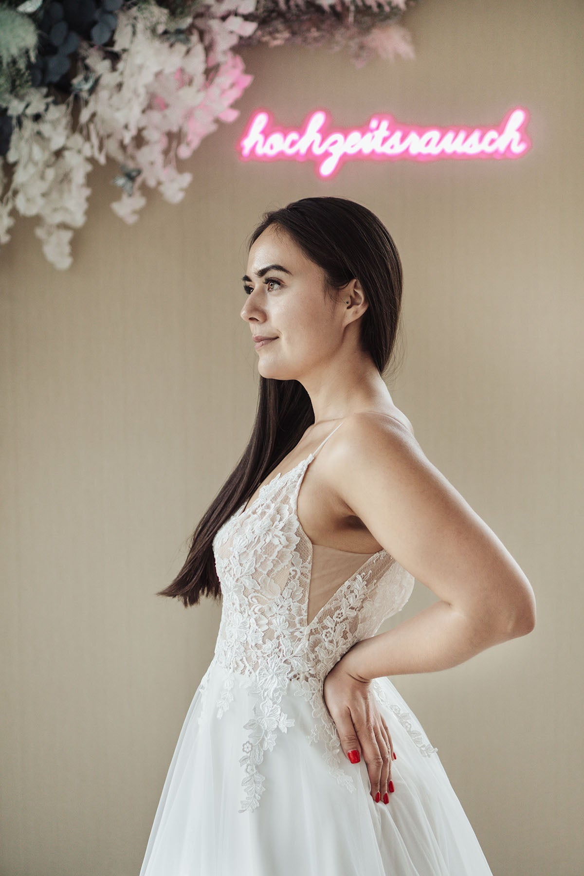 Corsage: Spitze in Ivory/ Tüll in Ivory - Rock: Chiffon + Futter in Ivory. Dieses Brautkleid ist komplett in Ivory geschneidert.