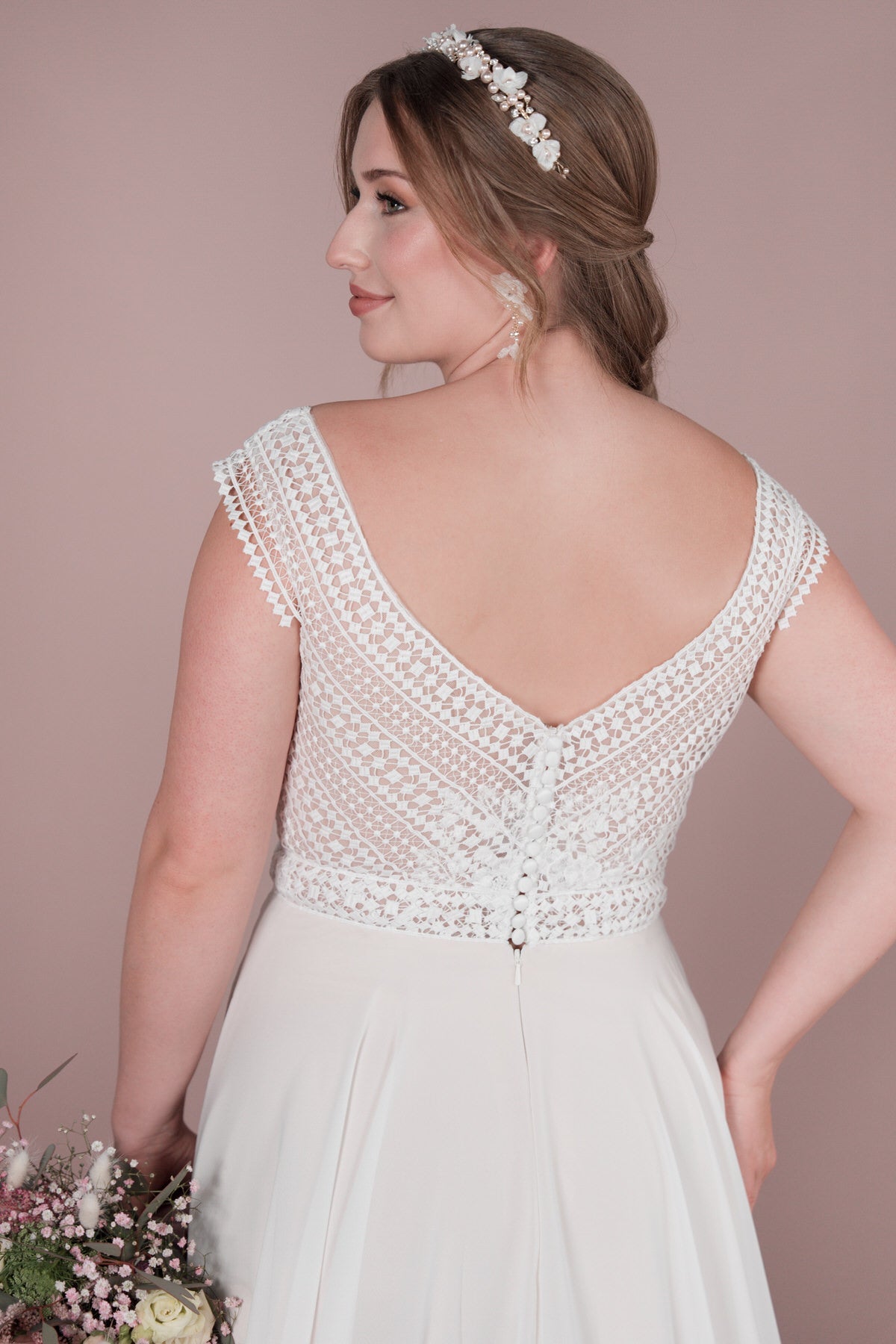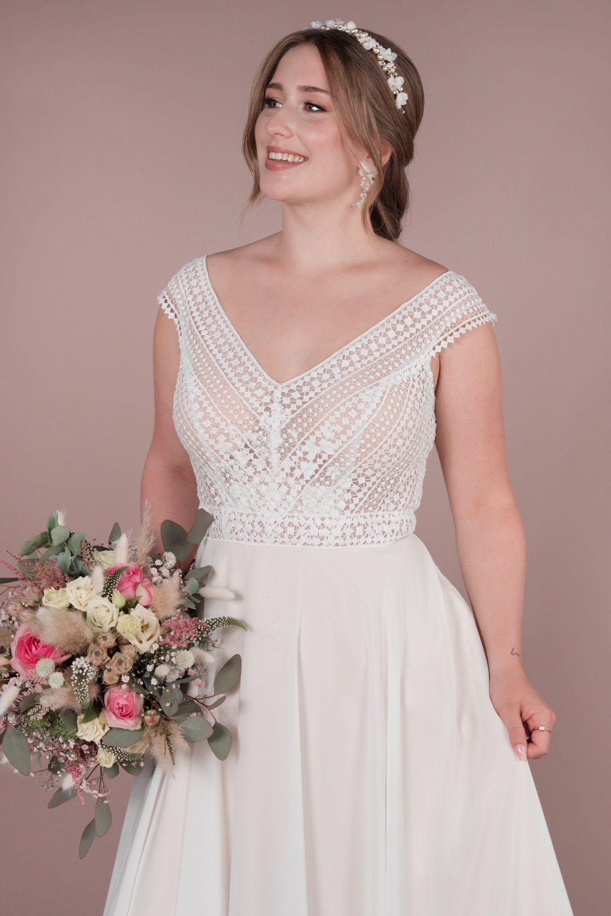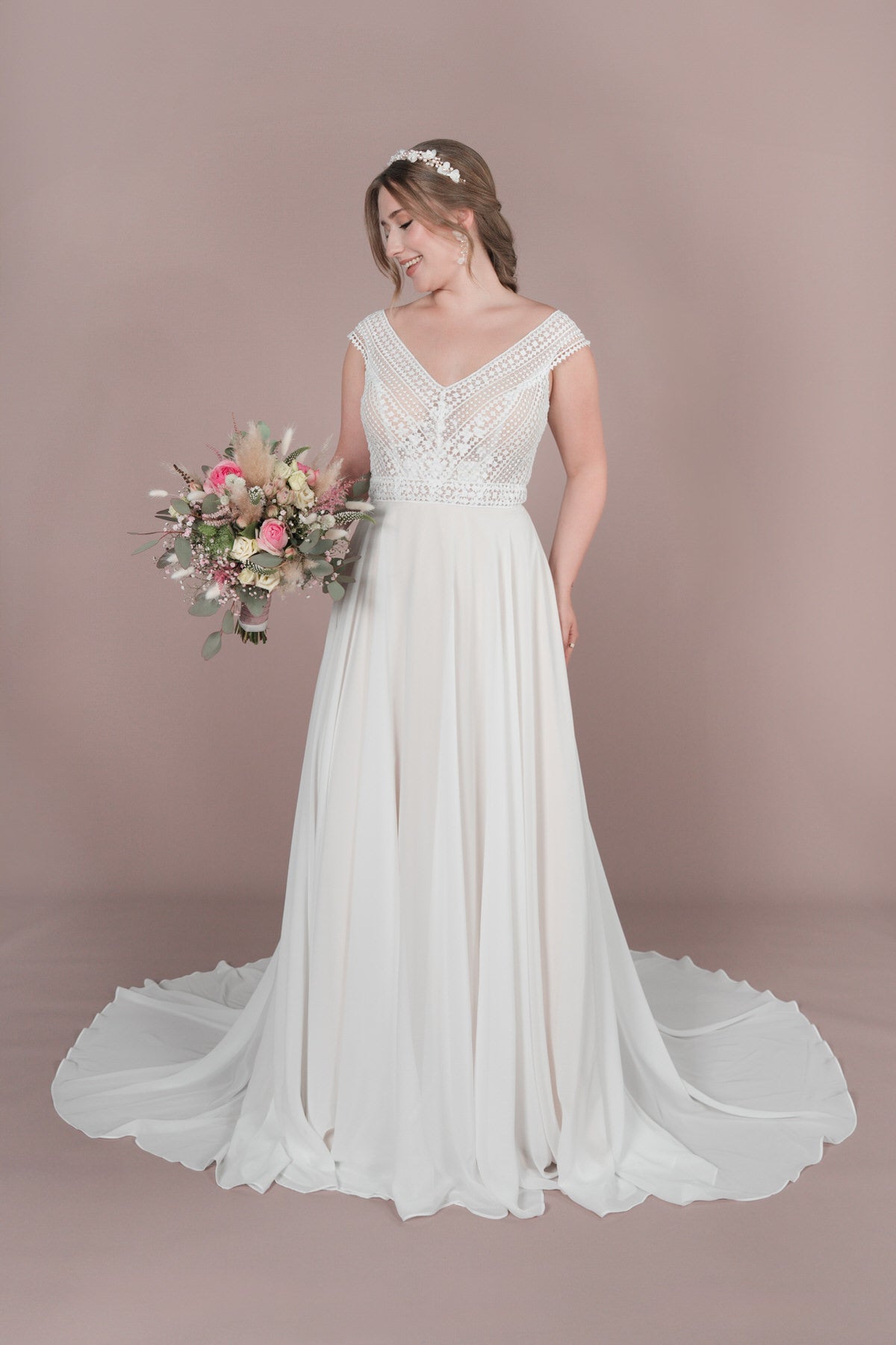 Das R2L25-C-A09 Brautkleid ist perfekt für eine Bridonista. Mit Spitzen-Trägern, einem V-Ausschnitt und einem romantischen A-Linien-Schnitt verströmt es Boho/Vintage-Flair. Der Soft-Tüll oder Chiffon-Rock sorgt für eine luftig-leichte Optik und ist ideal für eine Strandhochzeit. Der Rückenausschnitt in V-Form und das Taillenband setzen deine Silhouette gekonnt in Szene. Die Träger des Brautkleides, die an Spitze erinnern, verleihen ihm ein einzigartiges Flair. Dank des luftig-leichten Stoffes aus Soft-Tüll oder Chiffon wird es zu einem Traum für jede Bridonista. Ganz egal, ob du dich für eine Strandhochzeit entscheidest oder eine andere Location bevorzugst, das Brautkleid bietet dir viel Bewegungsfreiheit und setzt deine Silhouette mit seinem Taillenband und seinem Rückenausschnitt in V-Form gekonnt in Szene.