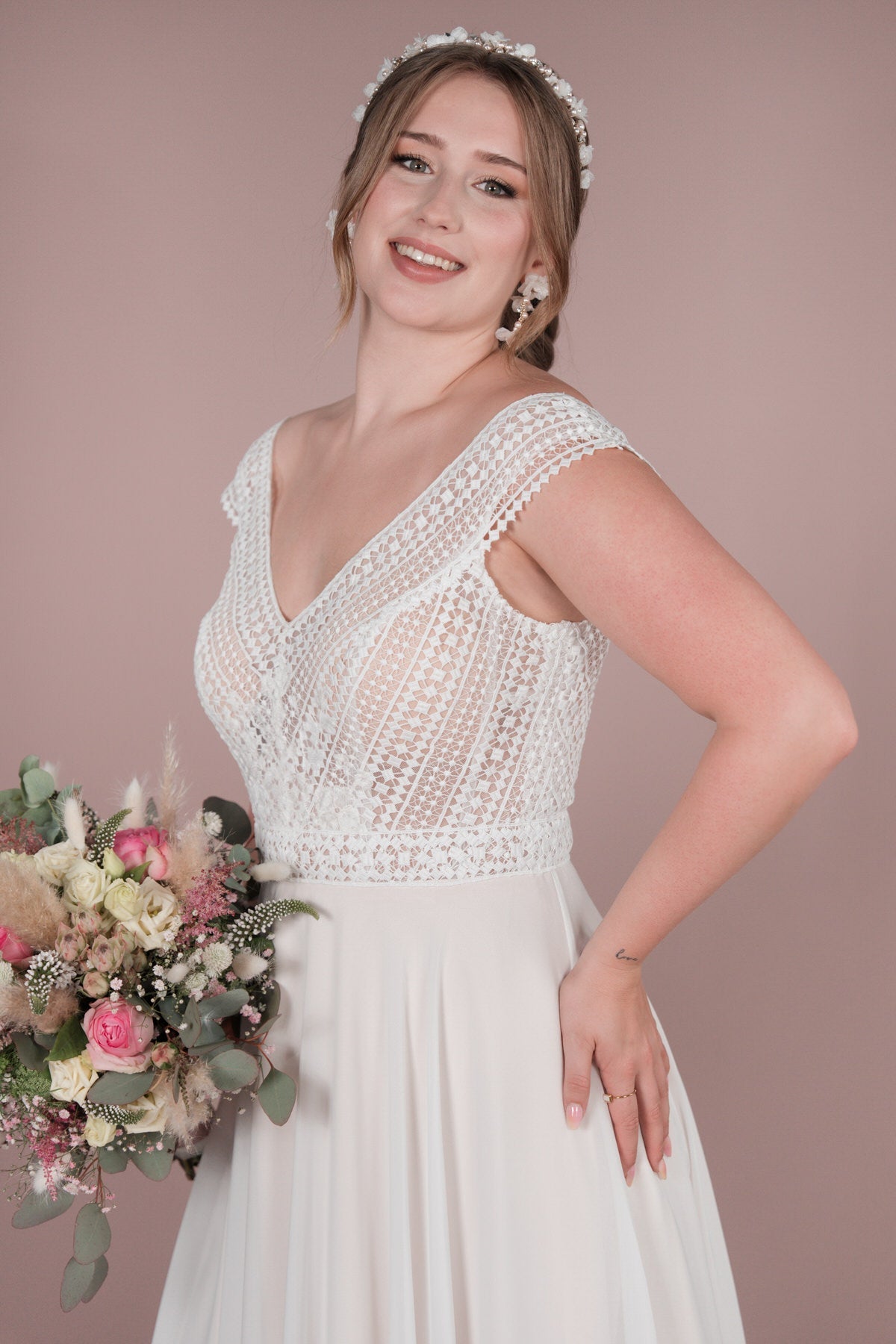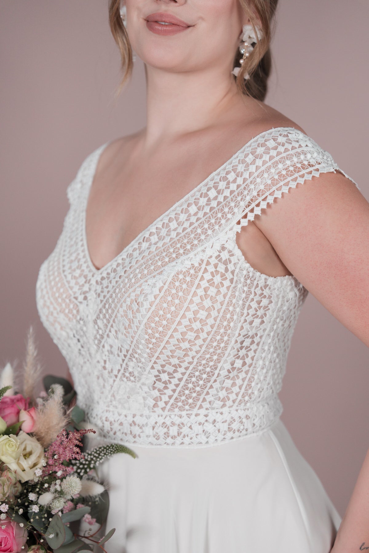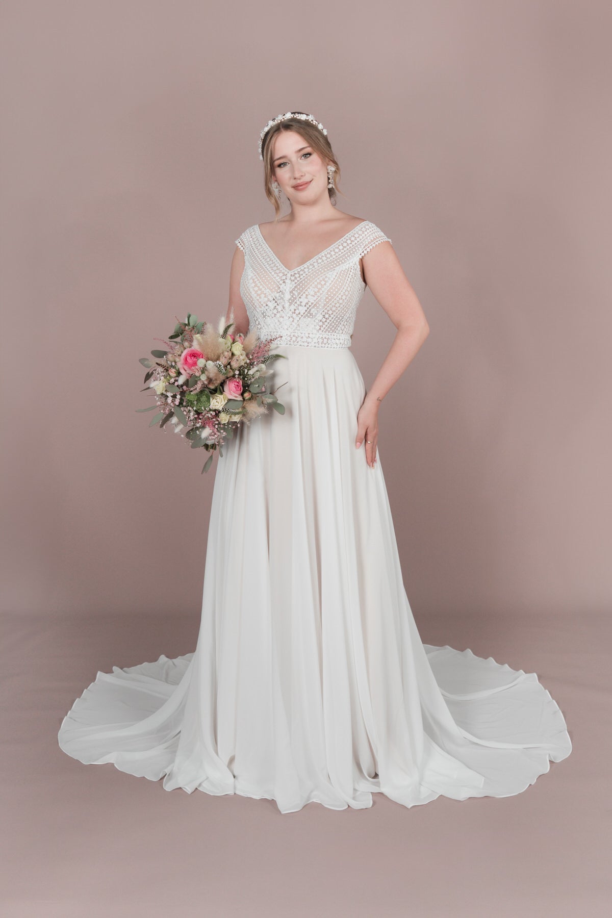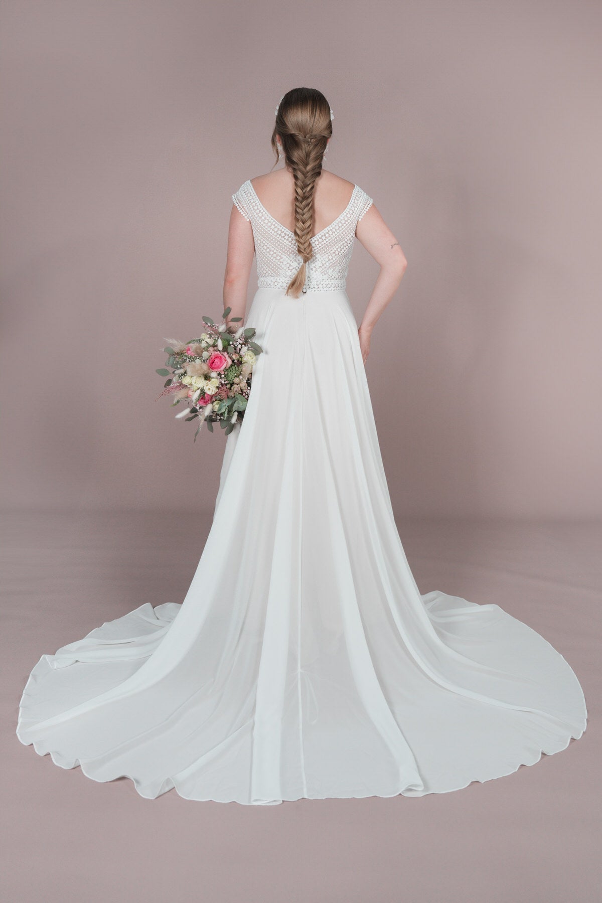 Das R2L25-C-A09 Brautkleid ist perfekt für eine Bridonista. Mit Spitzen-Trägern, einem V-Ausschnitt und einem romantischen A-Linien-Schnitt verströmt es Boho/Vintage-Flair. Der Soft-Tüll oder Chiffon-Rock sorgt für eine luftig-leichte Optik und ist ideal für eine Strandhochzeit. Der Rückenausschnitt in V-Form und das Taillenband setzen deine Silhouette gekonnt in Szene. Die Träger des Brautkleides, die an Spitze erinnern, verleihen ihm ein einzigartiges Flair. Dank des luftig-leichten Stoffes aus Soft-Tüll oder Chiffon wird es zu einem Traum für jede Bridonista. Ganz egal, ob du dich für eine Strandhochzeit entscheidest oder eine andere Location bevorzugst, das Brautkleid bietet dir viel Bewegungsfreiheit und setzt deine Silhouette mit seinem Taillenband und seinem Rückenausschnitt in V-Form gekonnt in Szene.