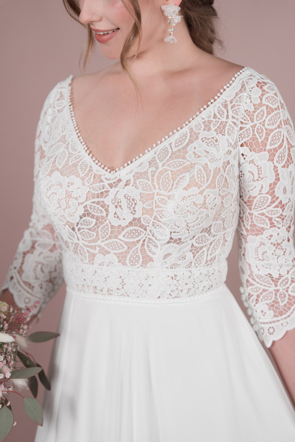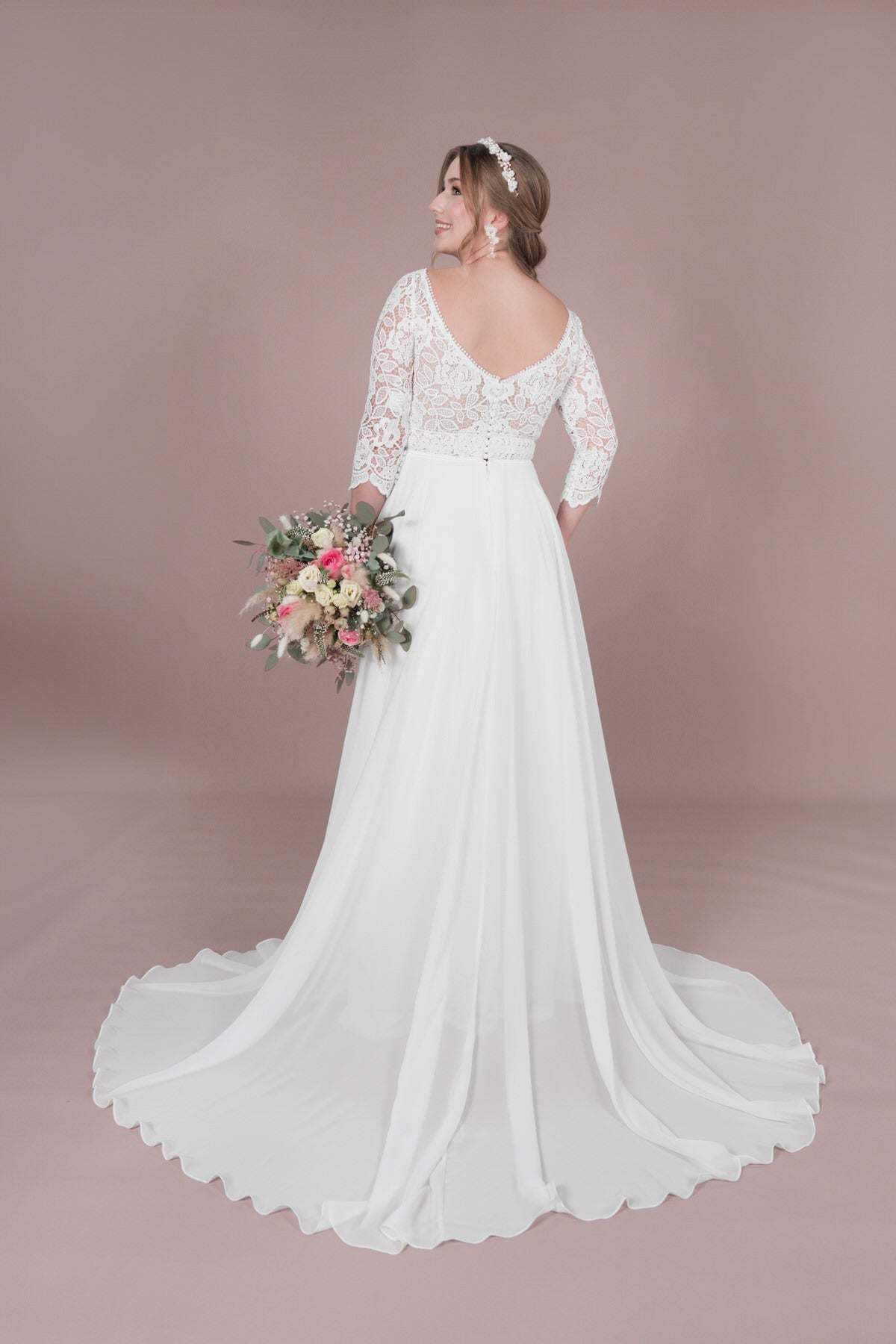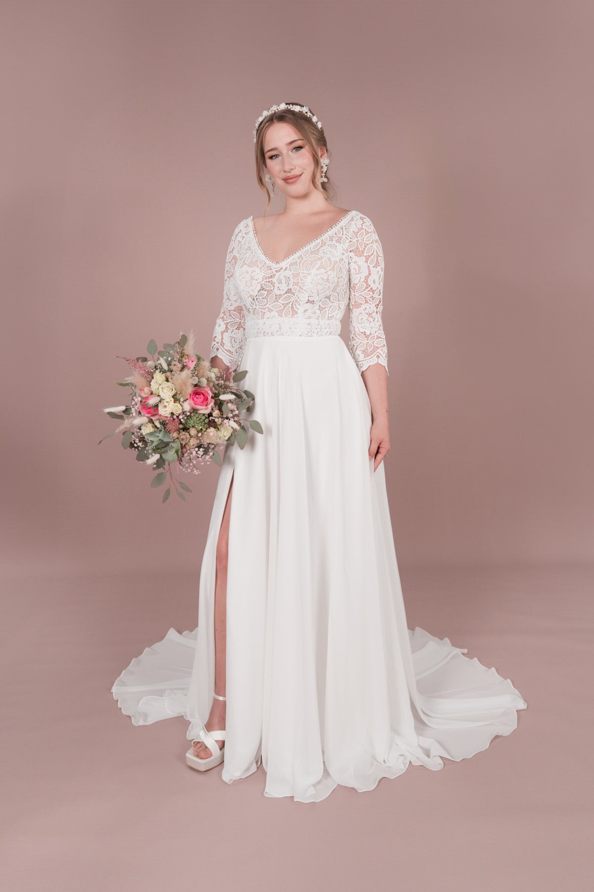 R2L25-C-A10 - das Bridonista Brautkleid aus der R2L Capsule Kollektion. Wähle zwischen Chiffon oder Soft-Tüll Rock, verziert mit Spitzen-Trägern. Der Rücken in V-Form und der Schlitz verleihen einen Hauch von Romantik. Das perfekte Kleid für einen Boho/Vintage-Look mit A-Linie, ¾ Armen und Knopfleiste. Ganz individuell mit langen oder kurzen Ärmeln und Taillenband. (#quirky #chic) Unsere Bridonista Kleider von R2L Capsule sind die perfekte Wahl für jede Bride-to-be, die einen Hauch von Romantik in ihrem Boho/Vintage-Look sucht! Mit dem Chiffon oder Soft-Tüll Rock und den verzierten Spitzen-Trägern bist du der Hingucker auf jeder Hochzeit. Mit ¾ Armen und einer schicken Knopfleiste ist dieses Kleid super praktisch und sieht dabei noch mega chic aus. Die individuellen Optionen für lange oder kurze Ärmeln und das Taillenband machen dein Kleid zu einem echten Unikat! (#quirky #chic)