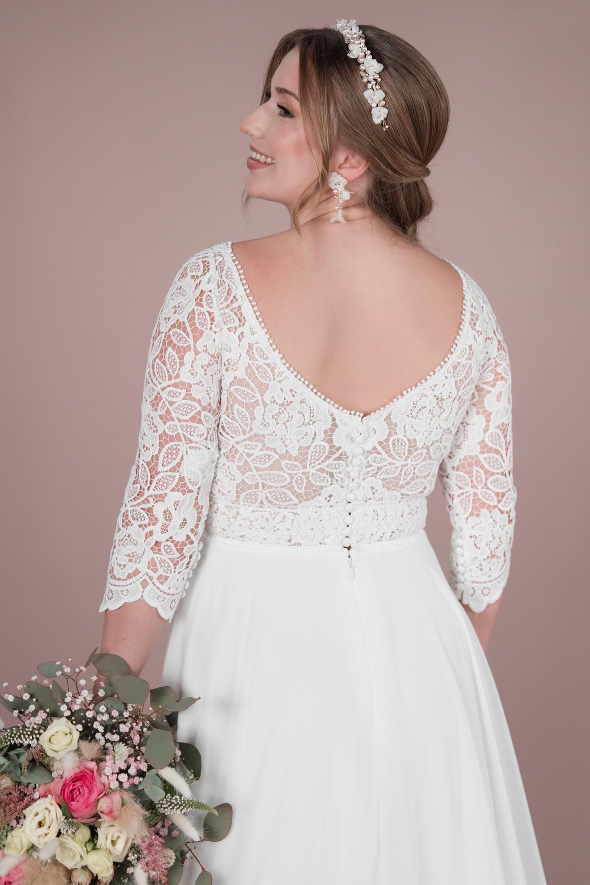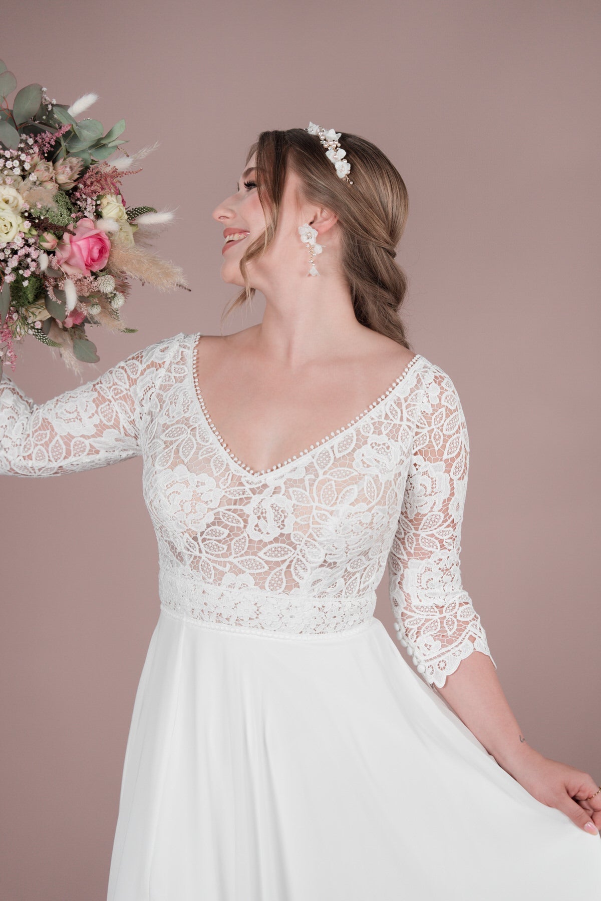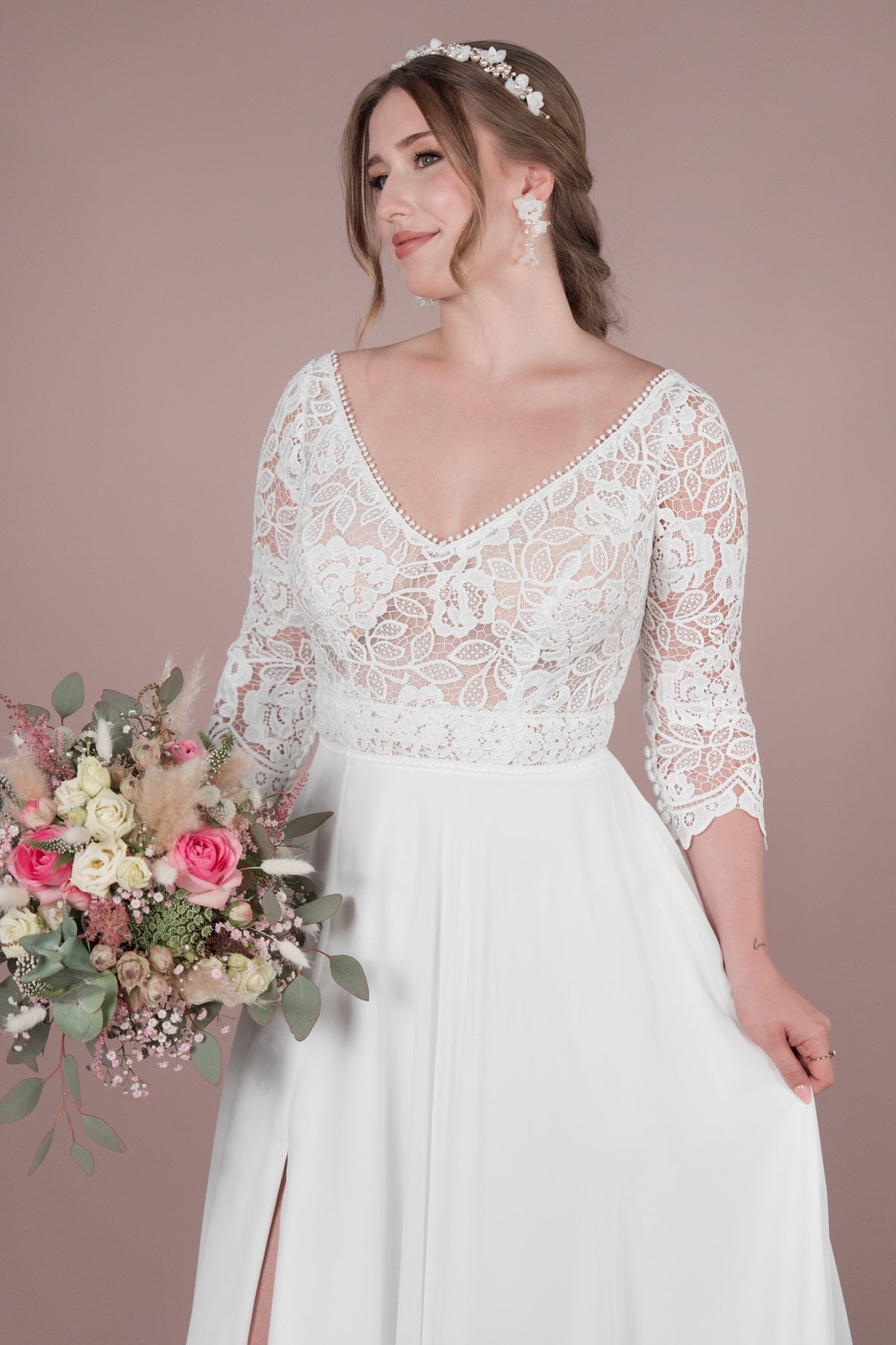 R2L25-C-A10 - das Bridonista Brautkleid aus der R2L Capsule Kollektion. Wähle zwischen Chiffon oder Soft-Tüll Rock, verziert mit Spitzen-Trägern. Der Rücken in V-Form und der Schlitz verleihen einen Hauch von Romantik. Das perfekte Kleid für einen Boho/Vintage-Look mit A-Linie, ¾ Armen und Knopfleiste. Ganz individuell mit langen oder kurzen Ärmeln und Taillenband. (#quirky #chic) Unsere Bridonista Kleider von R2L Capsule sind die perfekte Wahl für jede Bride-to-be, die einen Hauch von Romantik in ihrem Boho/Vintage-Look sucht! Mit dem Chiffon oder Soft-Tüll Rock und den verzierten Spitzen-Trägern bist du der Hingucker auf jeder Hochzeit. Mit ¾ Armen und einer schicken Knopfleiste ist dieses Kleid super praktisch und sieht dabei noch mega chic aus. Die individuellen Optionen für lange oder kurze Ärmeln und das Taillenband machen dein Kleid zu einem echten Unikat! (#quirky #chic)