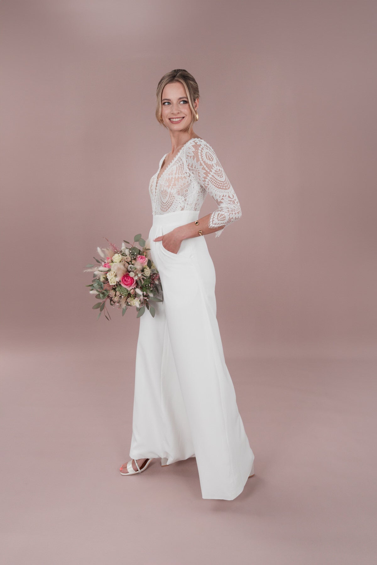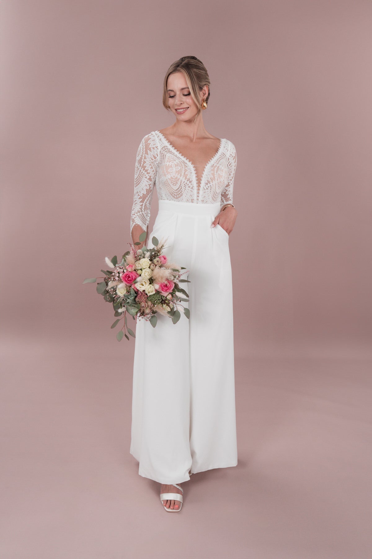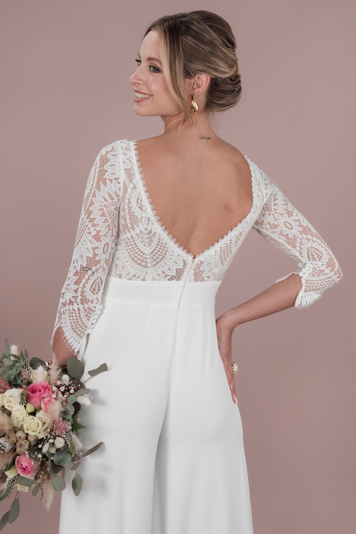 Das R2L25-C-J03 ist der perfekte Bridonista Jumpsuit für deine moderne Hochzeit im Boho- oder Vintage-Stil. Mit zarten Spitzen- und Chantilly-Details, einem tiefen V-Rücken und geometrischen Ärmeln bietet er einen eleganten Look. Dank des R2L Capsule-Designs ist er auch ideal fürs Standesamt geeignet. Mit praktischen Taschen und einem V-Ausschnitt ist er nicht nur schön, sondern auch funktional.