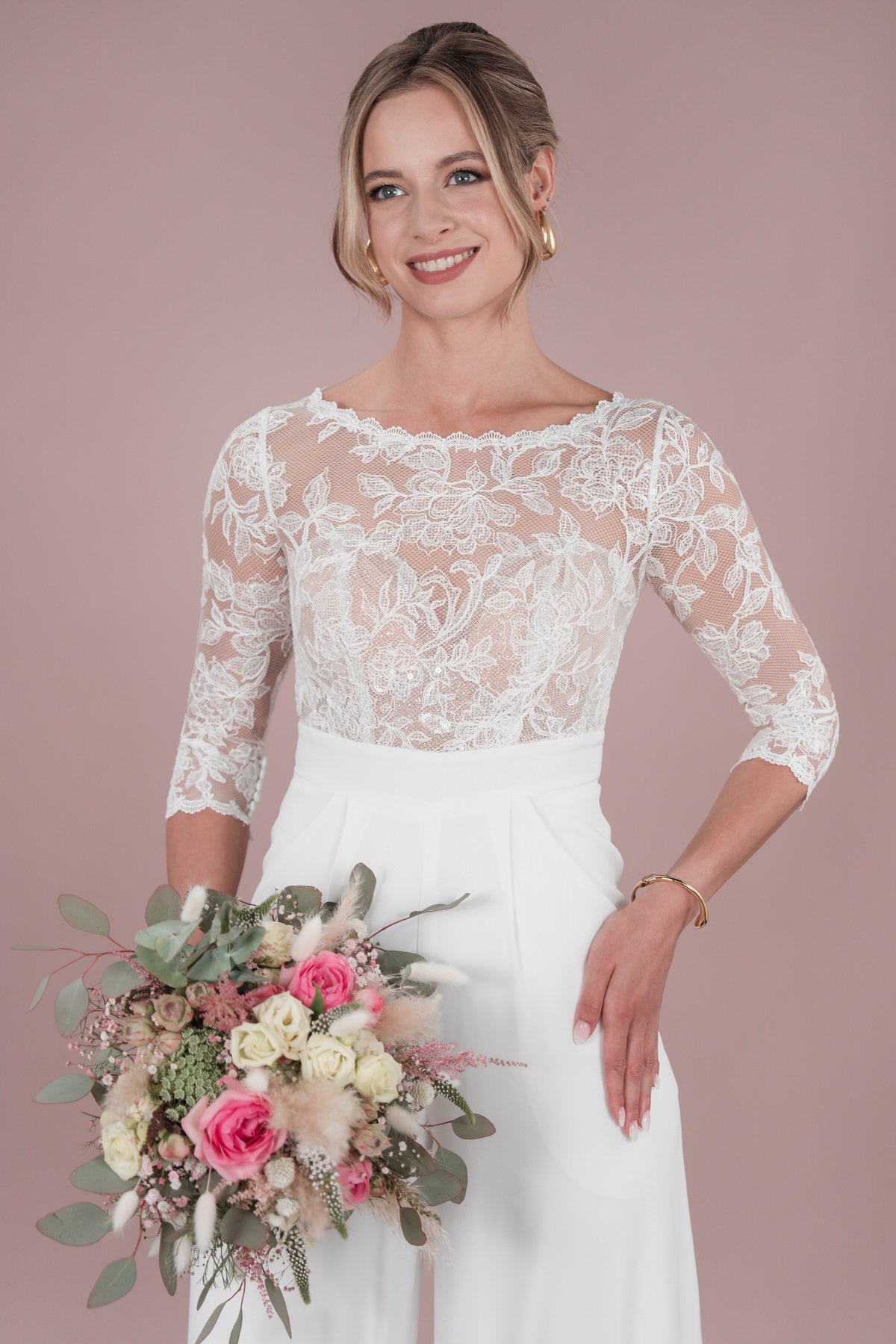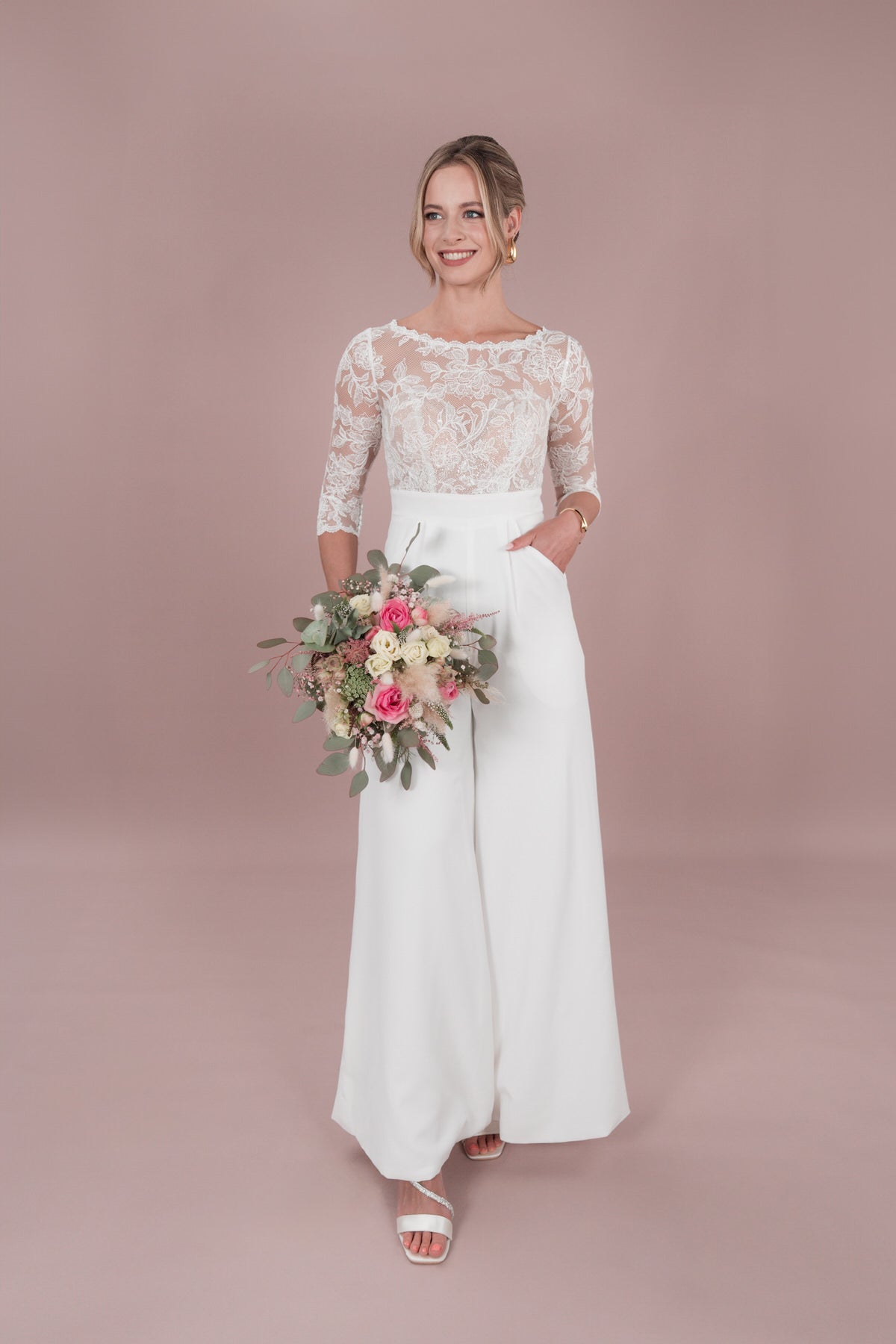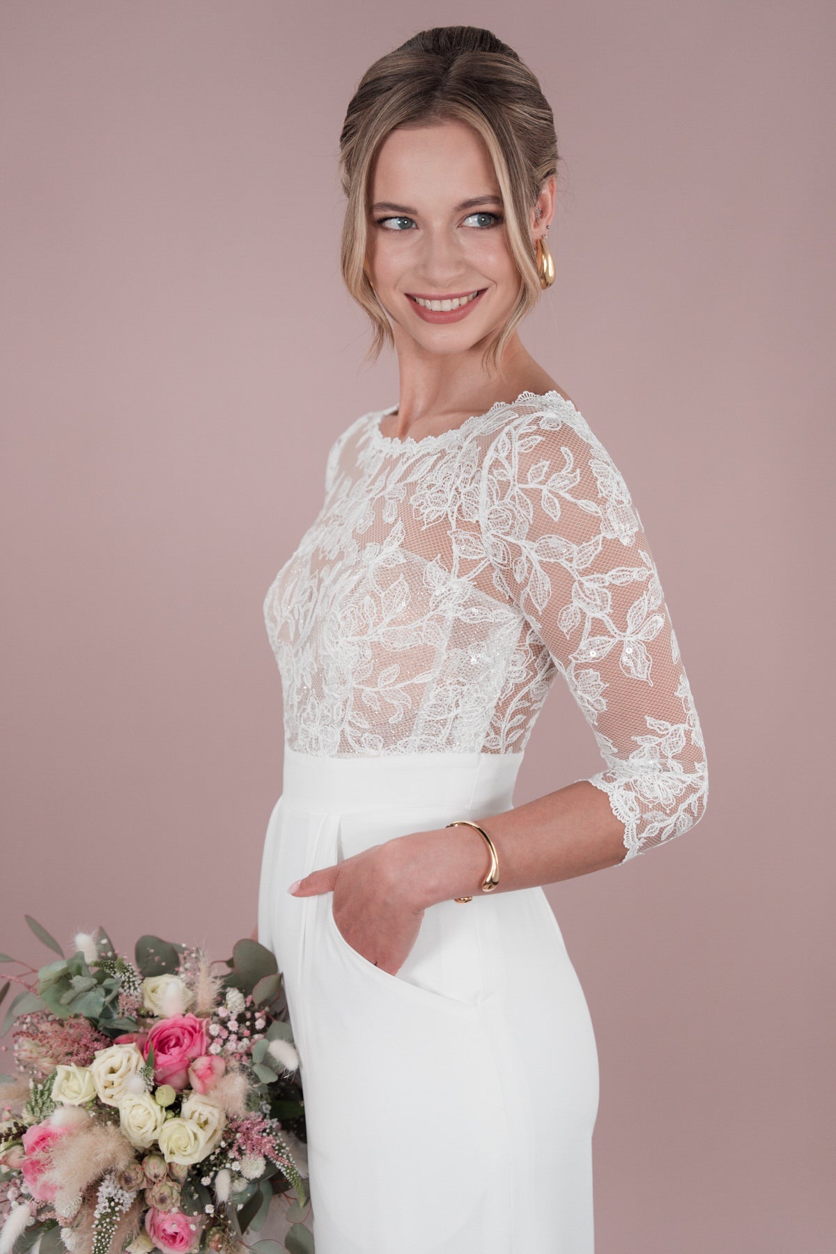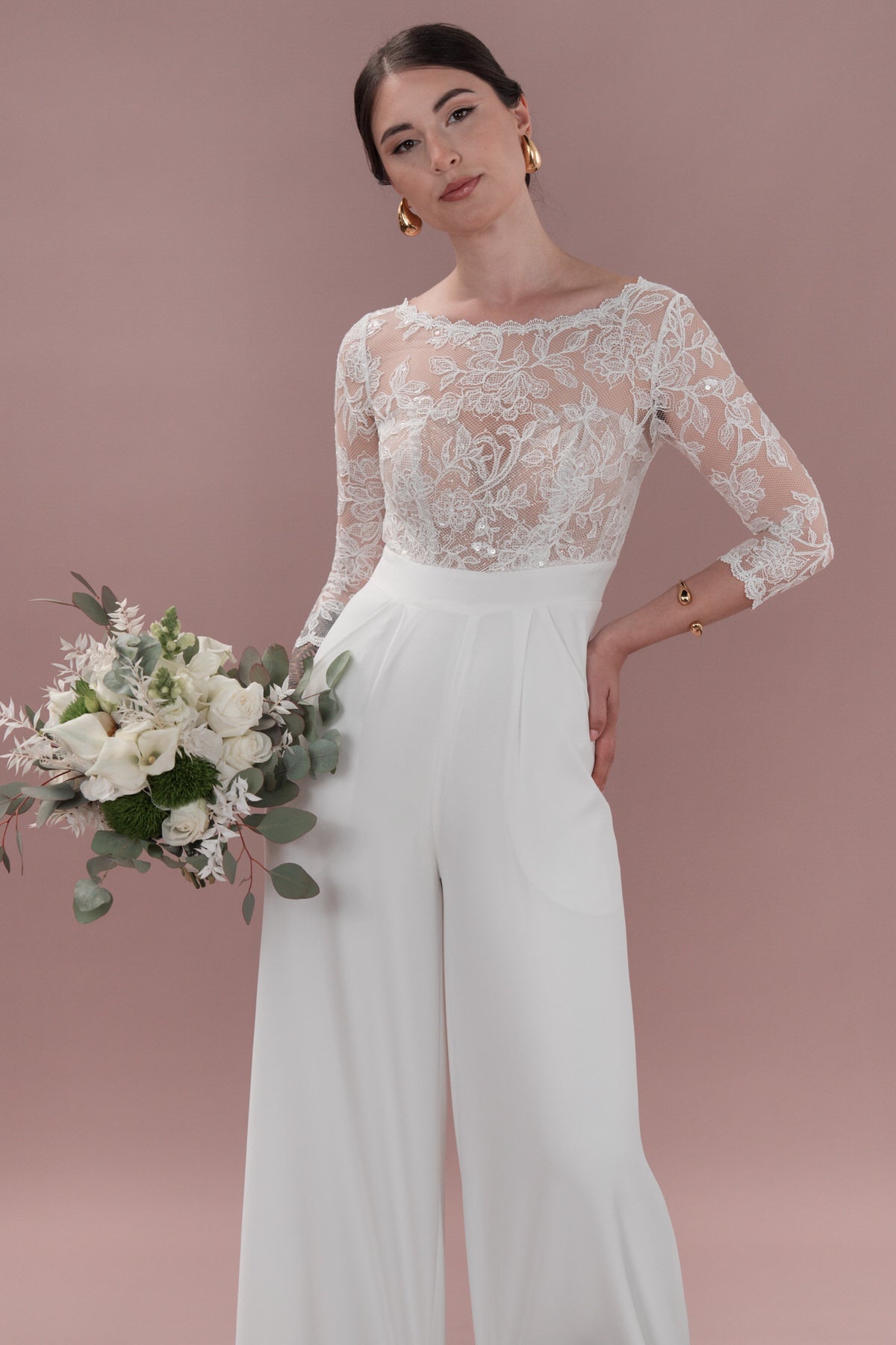 Der Bridonista Jumpsuit aus der R2L Capsule Kollektion überzeugt mit ihrem geometrischen Design und floraler Spitze, die einen Hauch Boho und Vintage Flair verleihen. Mit langem Ärmel, Taschen und aus hochwertigem Crepe gefertigt, ist der Jumpsuit perfekt für einen stilvollen Standesamt-Look.