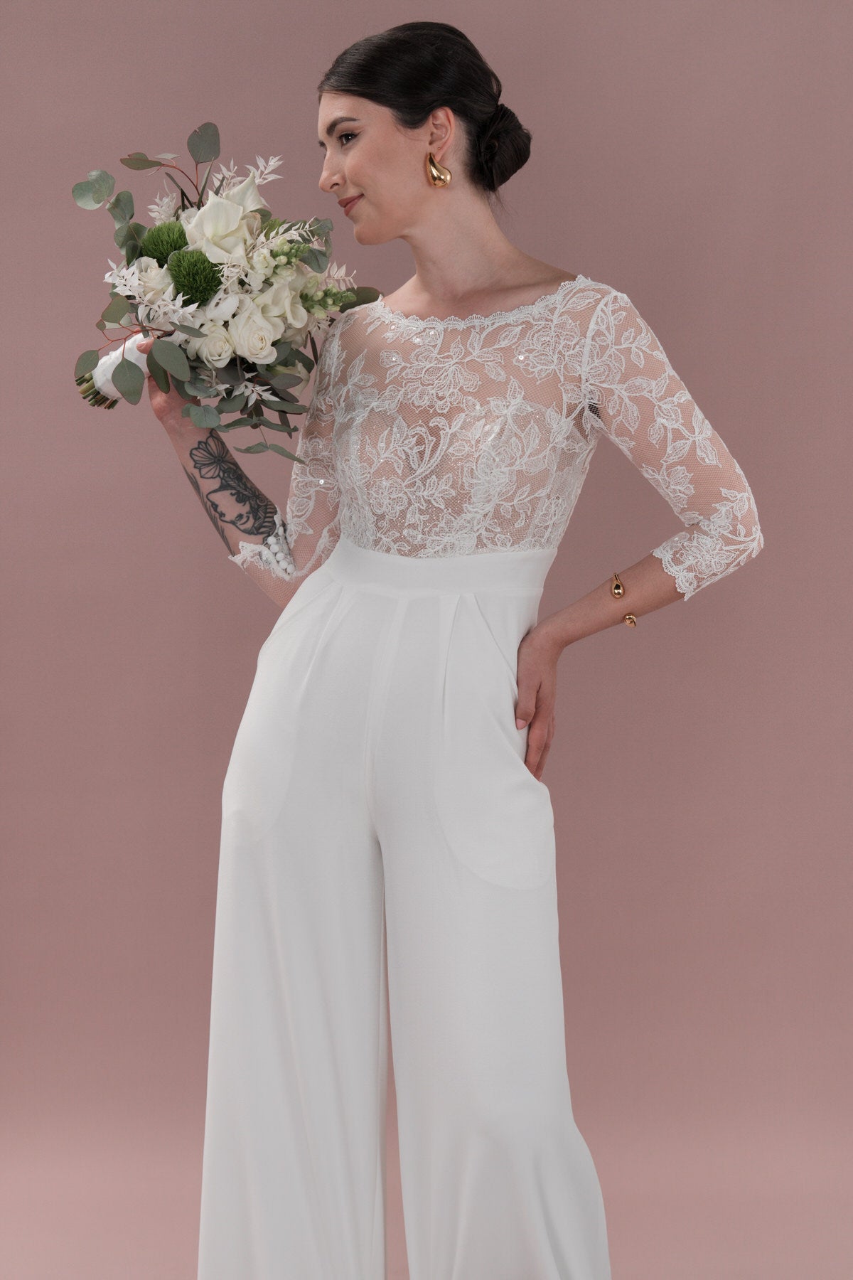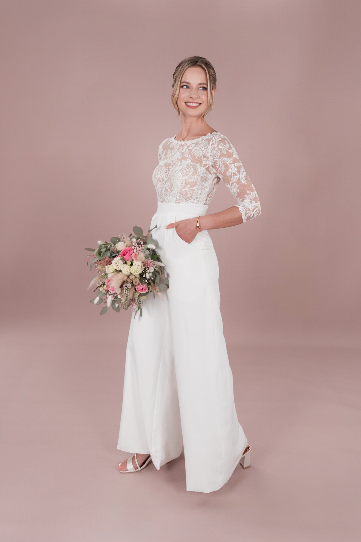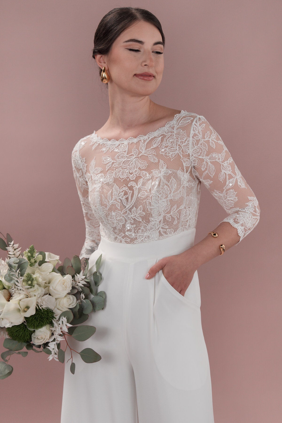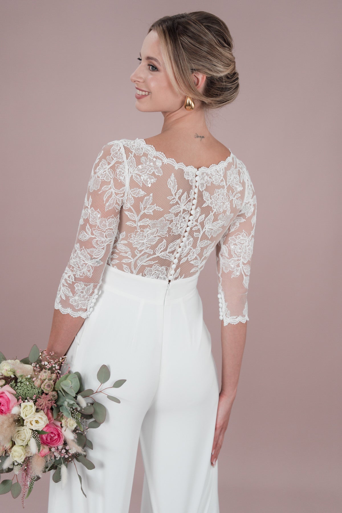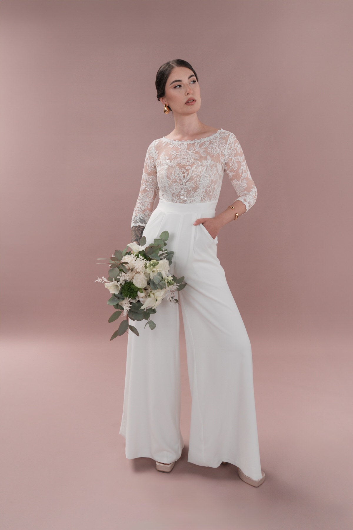 Der Bridonista Jumpsuit aus der R2L Capsule Kollektion überzeugt mit ihrem geometrischen Design und floraler Spitze, die einen Hauch Boho und Vintage Flair verleihen. Mit langem Ärmel, Taschen und aus hochwertigem Crepe gefertigt, ist der Jumpsuit perfekt für einen stilvollen Standesamt-Look.