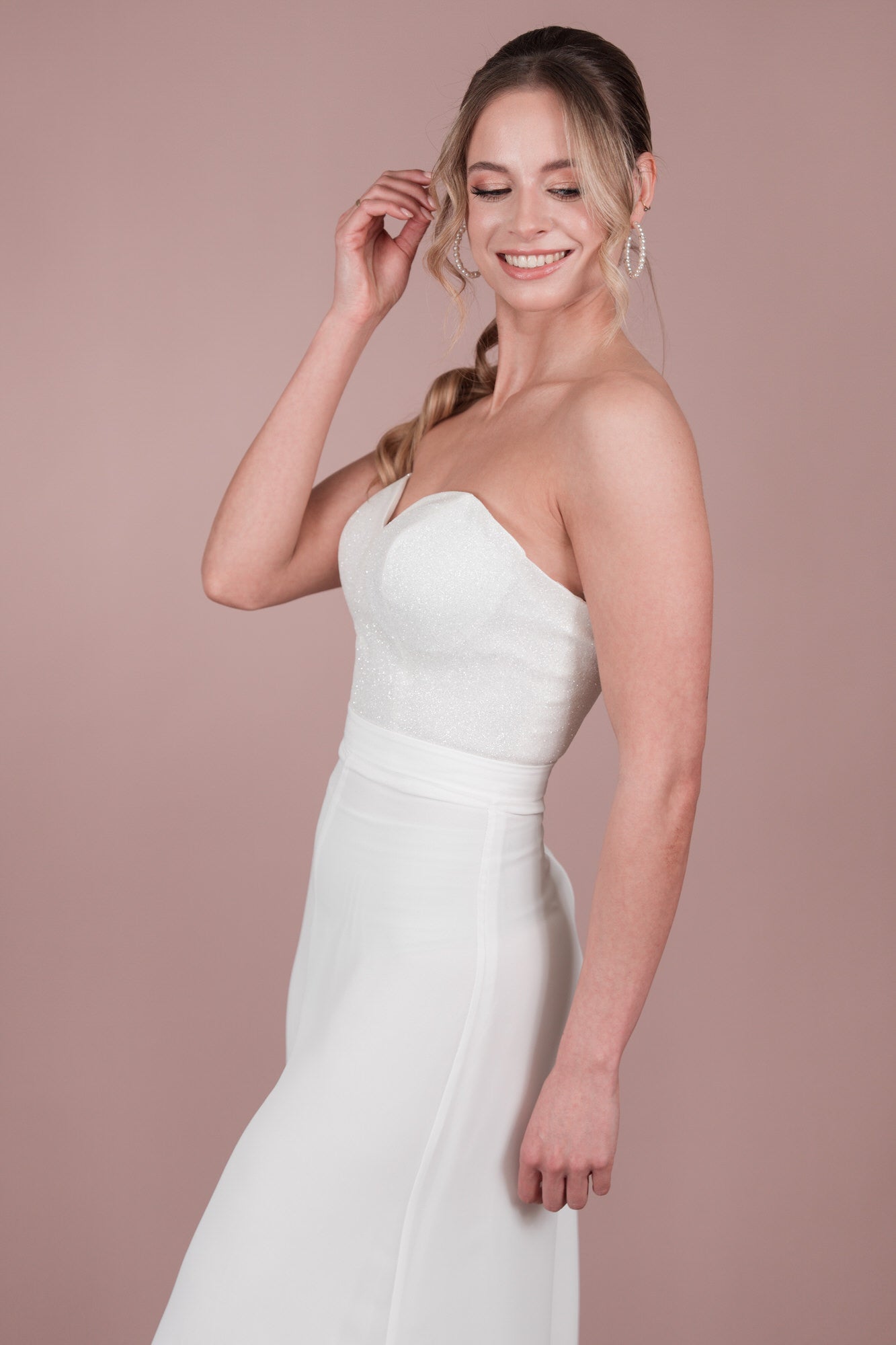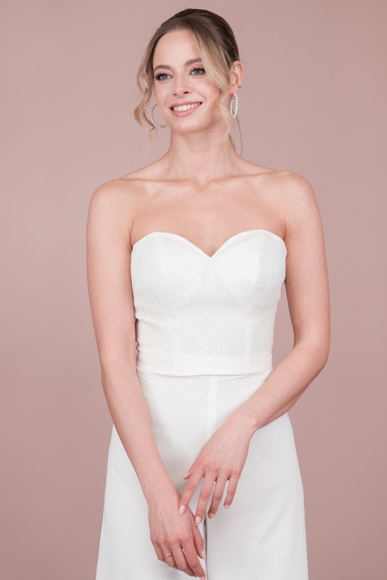 Mach dich bereit, an deinem großen Tag mit unserem R2L25-C01 (Glitter) Top zu glänzen! Dieses Bridonista-Hochzeitsoberteil hat einen schlichten, geraden Ausschnitt und eine Herzchen-Ausschnitt-Silhouette für einen schmeichelhaften Look. Der schulterfreie Schnitt sorgt für einen Hauch von Romantik, während das Material aus Krepp und die Glitzerakzente für den perfekten Glanz sorgen. Vergiss nicht, deinen Brautlook mit einer Corsage zu vervollständigen! Dieses Oberteil eignet sich perfekt für eine standesamtliche Hochzeit oder einen anderen besonderen Anlass und sorgt dafür, dass du dich selbstbewusst und wunderschön fühlst. Mit dem R2L25-C01 (Glitter) Top von Brindonista bist du der strahlende Star auf jeder Veranstaltung. Das schulterfreie Design verleiht dir einen koketten Touch, während das glitzernde Das Material aus Krepp dafür sorgt, dass du dich wie eine Million Dollar fühlst (auch wenn dein Budget eher bei fünf liegt). Und vergiss nicht die Corsage, die für einen Hauch von floralem Flair sorgt.