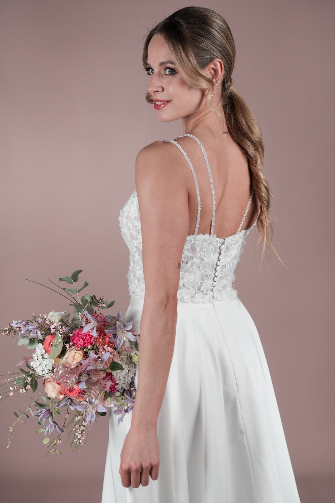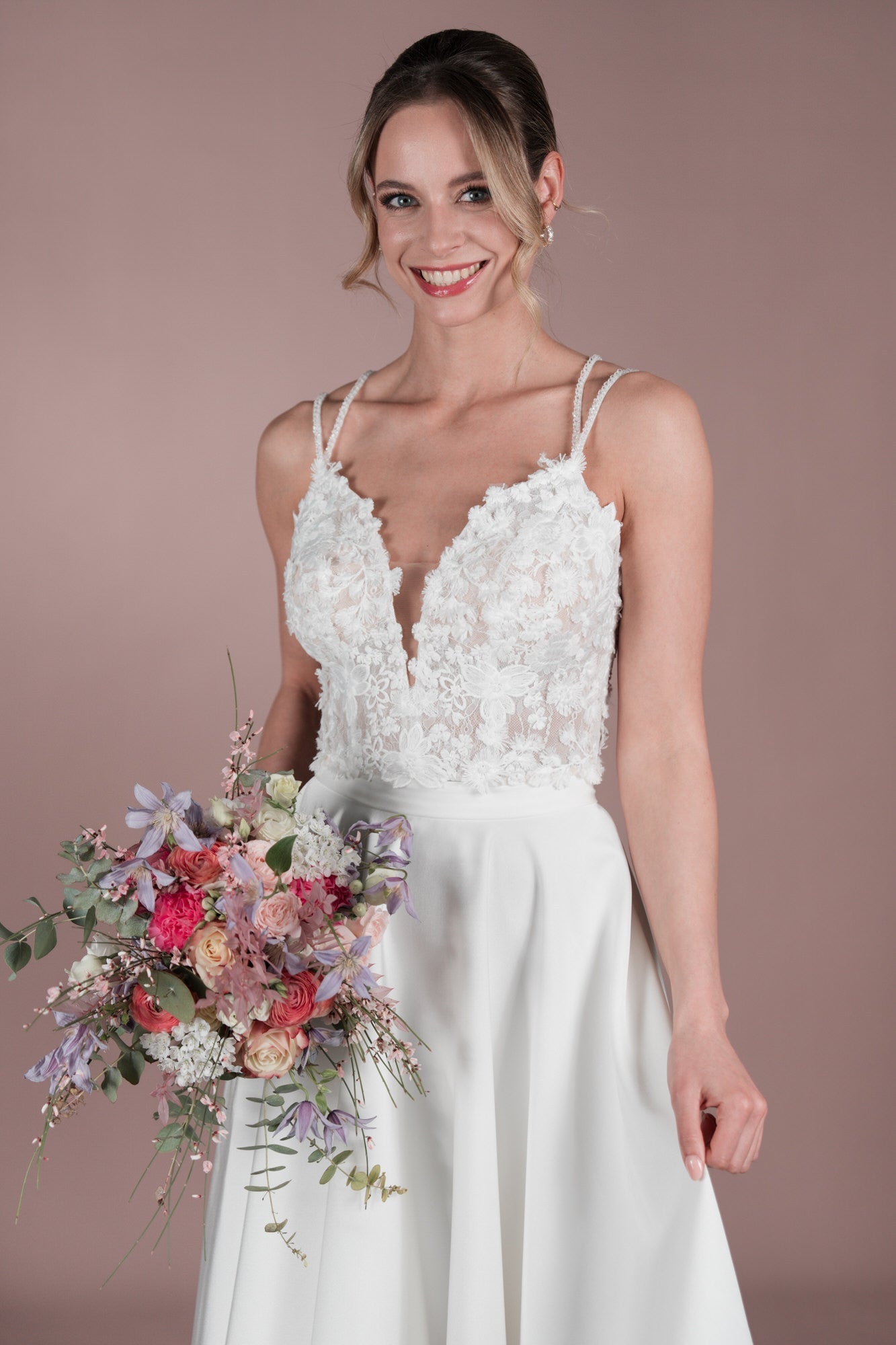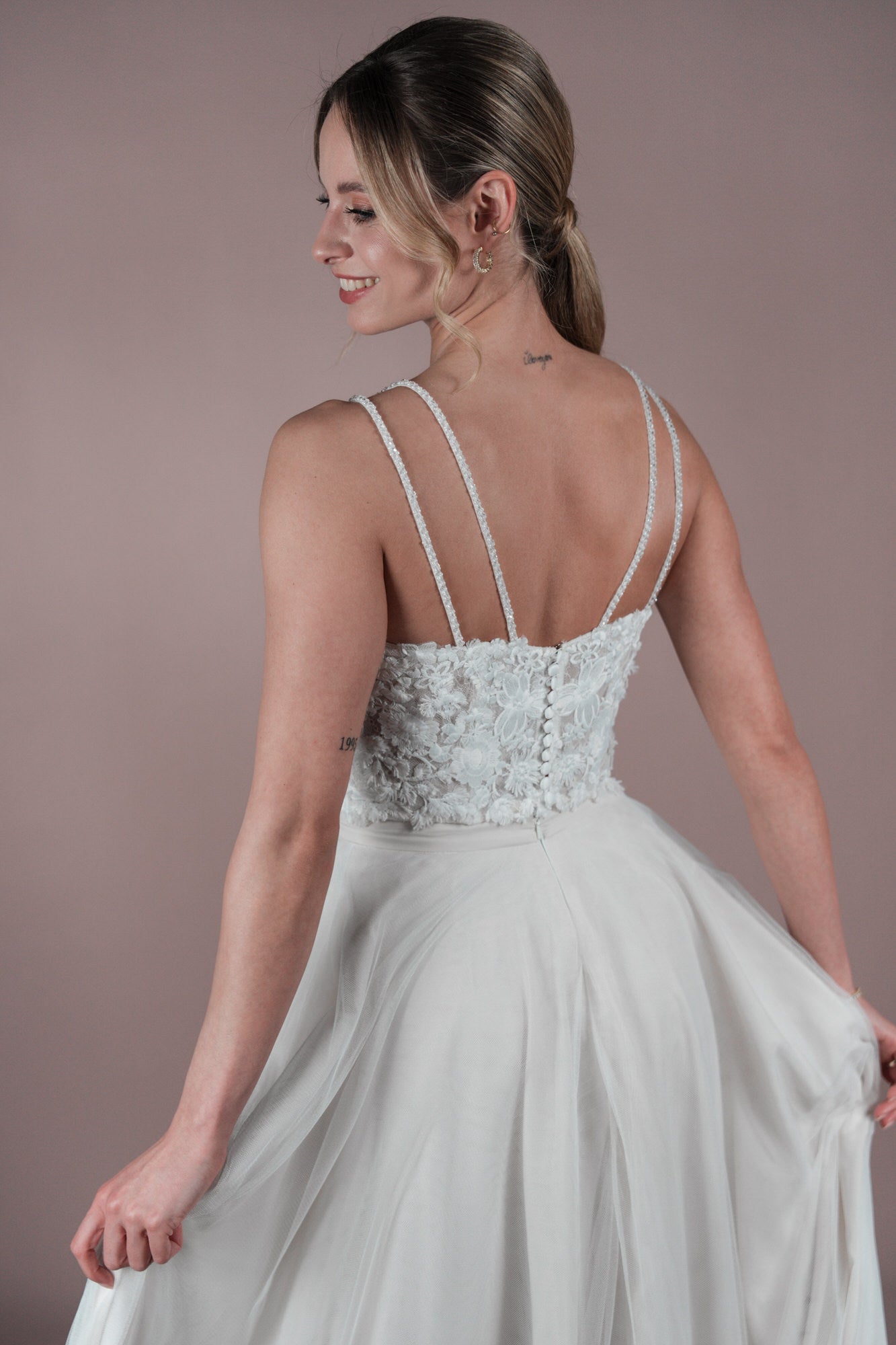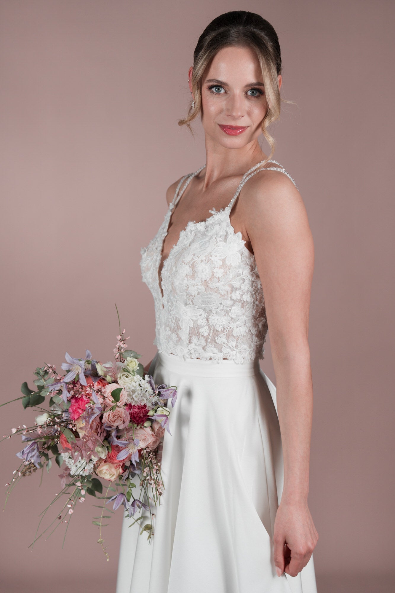 Mach dich bereit, mit dem R2L25-C04 Top die Show zu stehlen. Dieses Bridonista Separate Top ist mit seinem Herzchen-Ausschnitt, dem geraden Rücken und den feinen Spaghetti-Trägern perfekt für eine romantische standesamtliche Hochzeit. Die 3D-Blumenspitze und die Chantilly-Corsage verleihen deinem besonderen Tag einen Hauch von Laune. Nur bei Ready2Love. Mit diesem bezaubernden Oberteil wirst du auf deiner standesamtlichen Hochzeit der Mittelpunkt der Aufmerksamkeit sein. Der Herzchen-Ausschnitt, der gerade Rücken und die feinen Spaghetti-Träger verleihen deinem Look Romantik. Die florale 3D-Spitze und die Chantilly-Corsage verleihen deinem besonderen Tag einen Hauch von Charme. Sofortiger Wow-Faktor - nur bei Ready2Love.