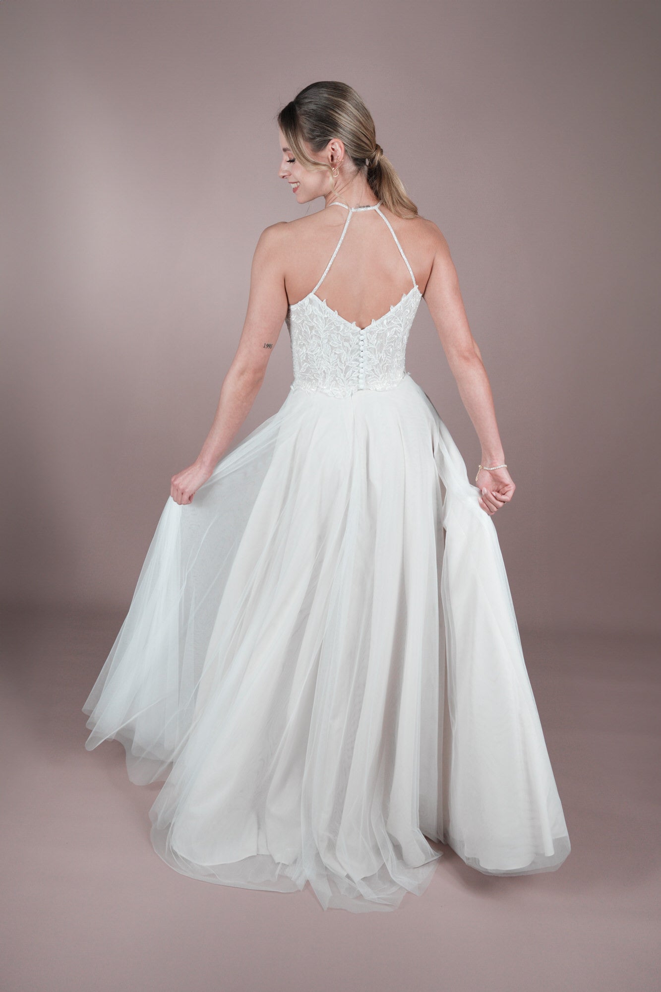 Sei eine Bridonista in unserem R2L25-C08 Top. Dieses romantische Oberteil aus Illusionstüll mit feiner Spitze, hohem Halsausschnitt und Corsage-Details ist perfekt für jede standesamtliche Hochzeit. Der V-Rücken und die Spaghetti-Träger verleihen dieser Kreation aus Blattspitze und Chantilly einen Hauch von Glamour und sorgen dafür, dass du ready2love bist! Dein ultimatives Statement-Piece für jede Hochzeit. Dieses elegante und verspielte Oberteil hat alles - feine Spitze, einen hohen Ausschnitt und Corsagen-Details - alles verpackt in einem romantischen Illusions-Tüll-Paket. Mit dem sinnlichen V-Ausschnitt und den zierlichen Spaghettiträgern bist du in dieser Kreation aus Blattspitze und Chantilly das Gesprächsthema schlechthin - bereit zum Lieben und geliebt werden!