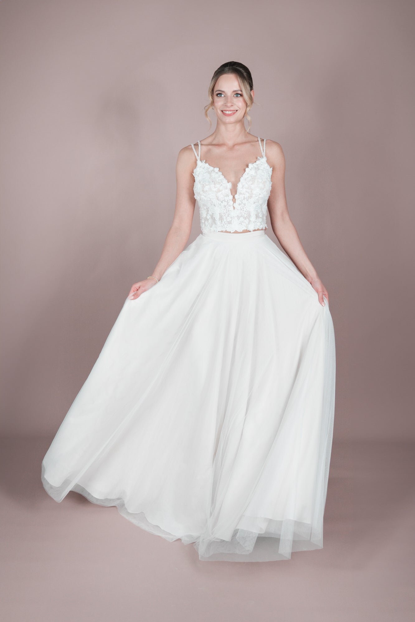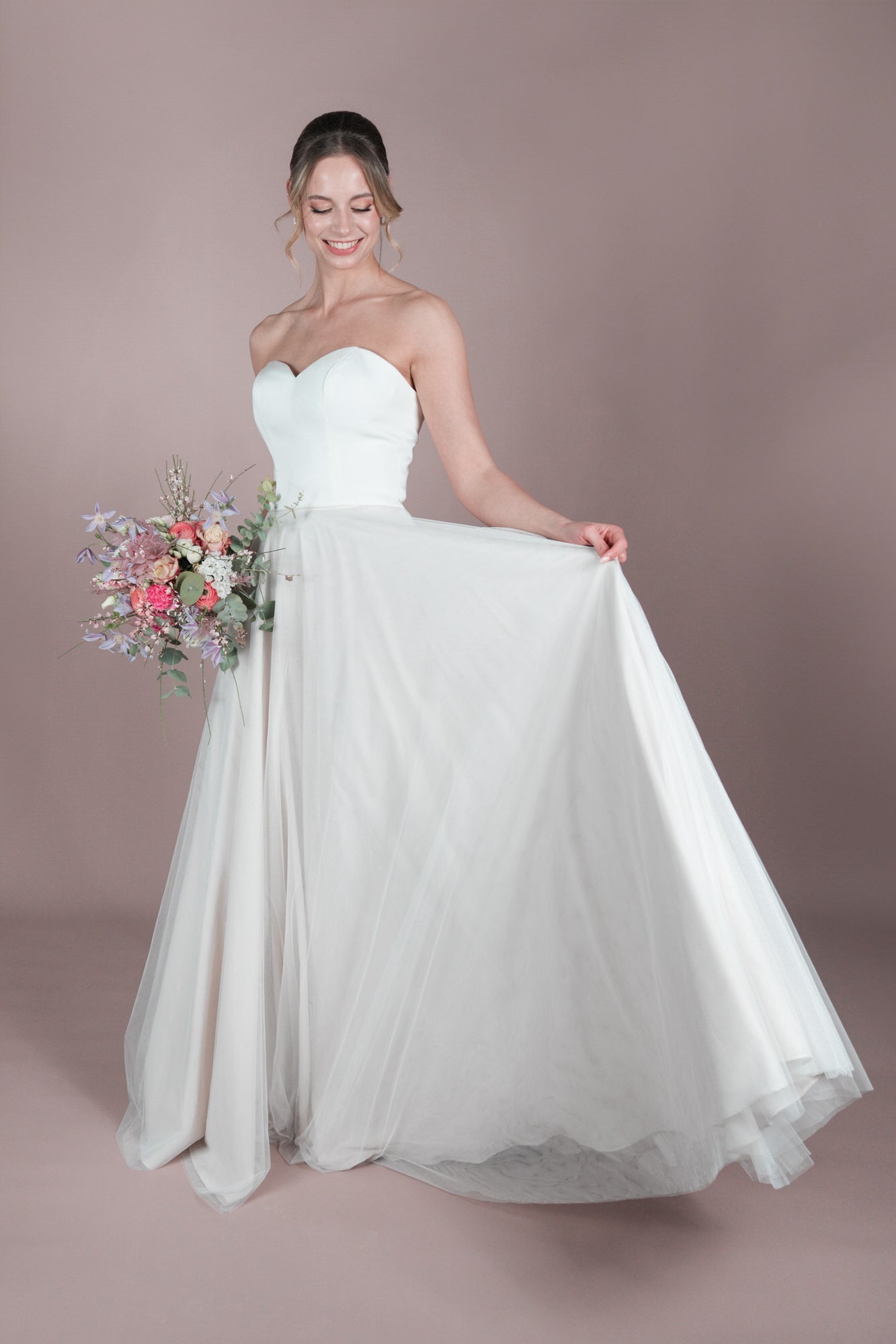Mach dich bereit, mit unserem R2L25-S02 Rock die Braut zu erobern. Dieser Hochzeitsrock von Bridonista hat ein weiches Material aus Tüll und ist schlicht und ohne Glitzer. Kombiniere ihn mit unseren Einzelteilen, um einen individuellen Look zu kreieren. Perfekt für bodenlange, elegante A-Linien. Ready2Love nicht enthalten. Mit diesem Rock übernimmst du die Verantwortung für dein Brautkleid. Das schlichte, glitzerfreie Material aus weichem Tüll sorgt für einen anpassungsfähigen Look, der sich perfekt mit unseren Einzelteilen kombinieren lässt. Verleihe deinem Hochzeitstag eine bodenlange A-Linie mit Eleganz.