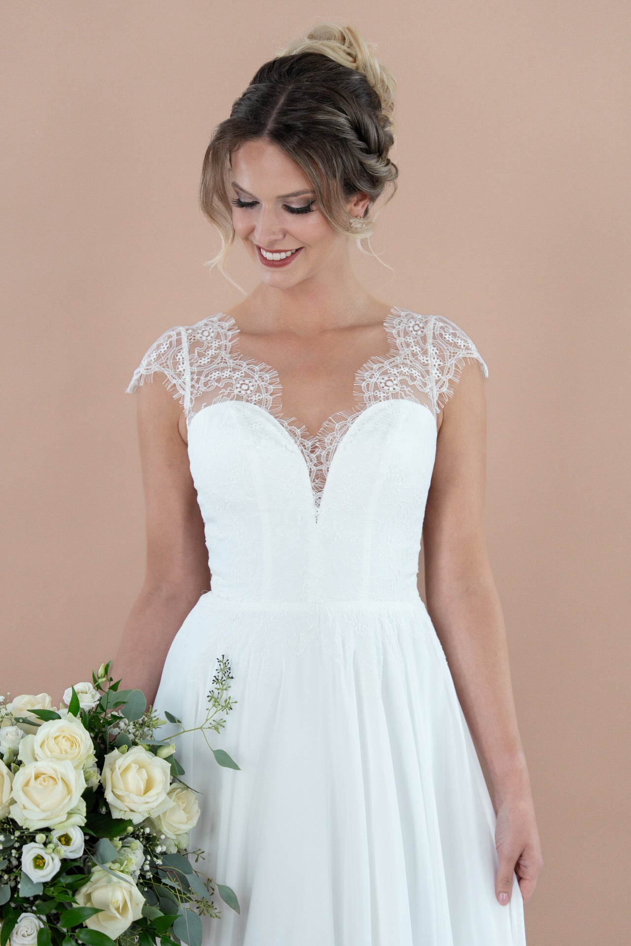 Der herzförmige Ausschnitt ist ein echter Hingucker, der deine feminine Ausstrahlung unterstreicht und deinem Gesicht einen zarten Rahmen schenkt. Er öffnet den Blick für dein Strahlen und verleiht dem Kleid eine romantische Note, die Herzen höherschlagen lässt. Die Cap Sleeves, kunstvoll aus feiner Chantilly-Spitze gefertigt, zaubern einen Tattoo-Effekt auf deine Schultern. Sie wirken wie ein Hauch von Poesie, der deine Haut mit filigranen Mustern schmückt und dem Kleid eine verspielte, doch elegante Leichtigkeit verleiht.