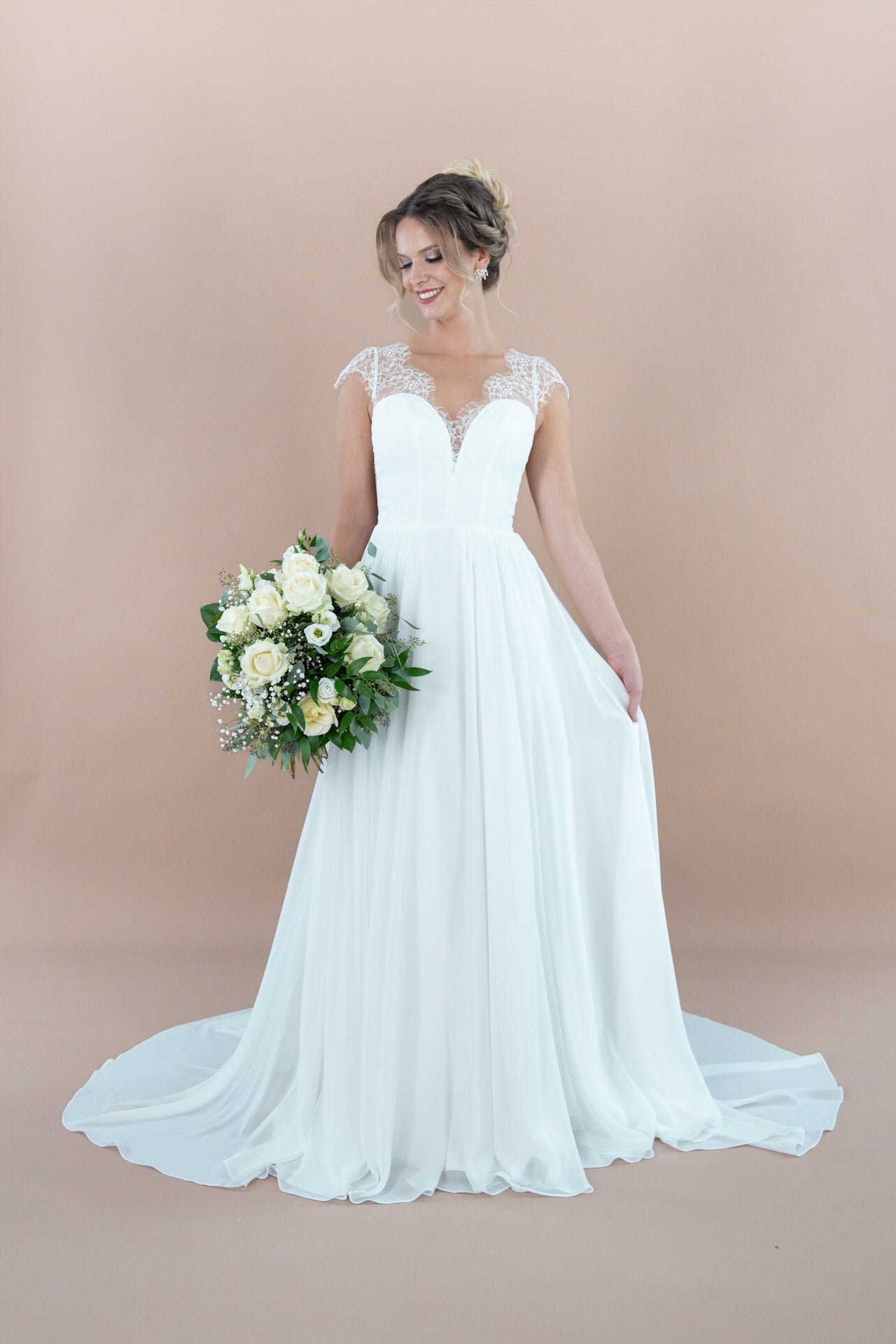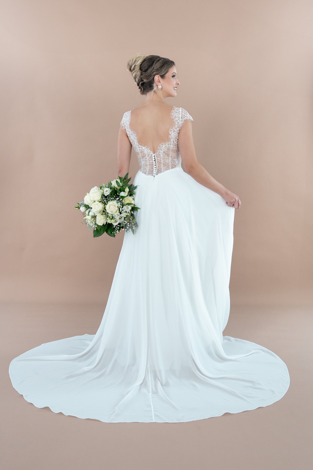 Der Rücken des Kleides ist ein wahres Kunstwerk: Der offene Rücken, durchwirkt mit einem Tattoo-Effekt aus hauchzarter Spitze, vereint Verführung mit Raffinesse. Er zeigt gerade genug, um Blicke zu fesseln, bleibt aber stets geschmackvoll und romantisch. Der Chiffon-Rock fließt sanft bis zu einer mittellangen Schleppe, die deinem Auftritt eine majestätische Note verleiht, ohne dich einzuschränken. Sie wiegt sich bei jedem deiner Schritte wie ein sanfter Traum, der hinter dir herweht und die Blicke deiner Gäste auf sich zieht.
