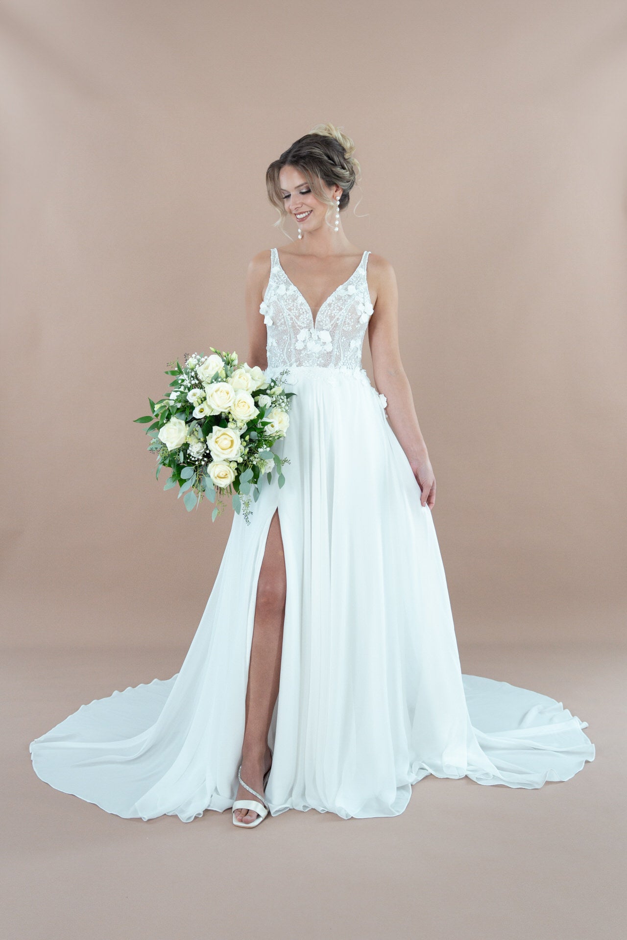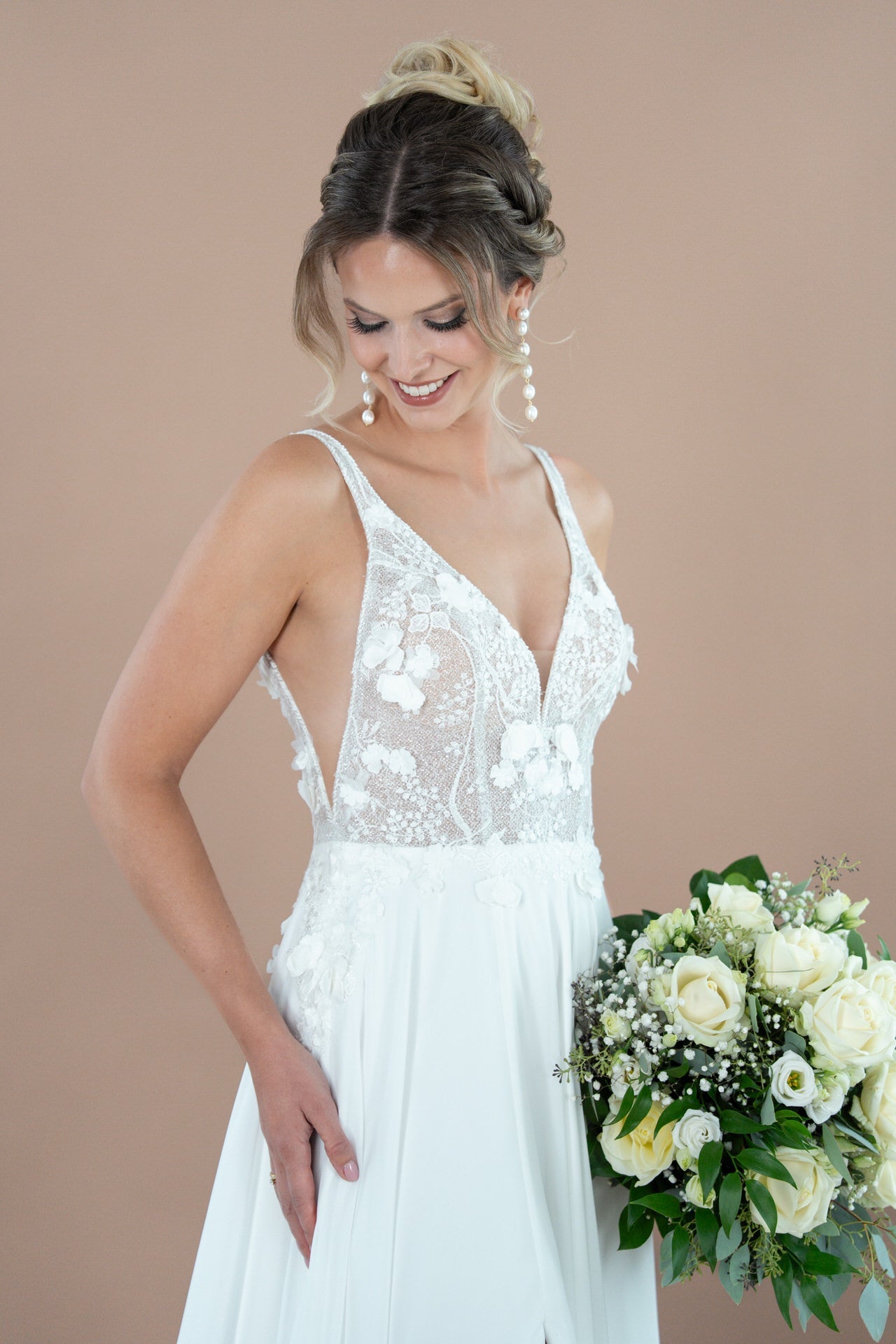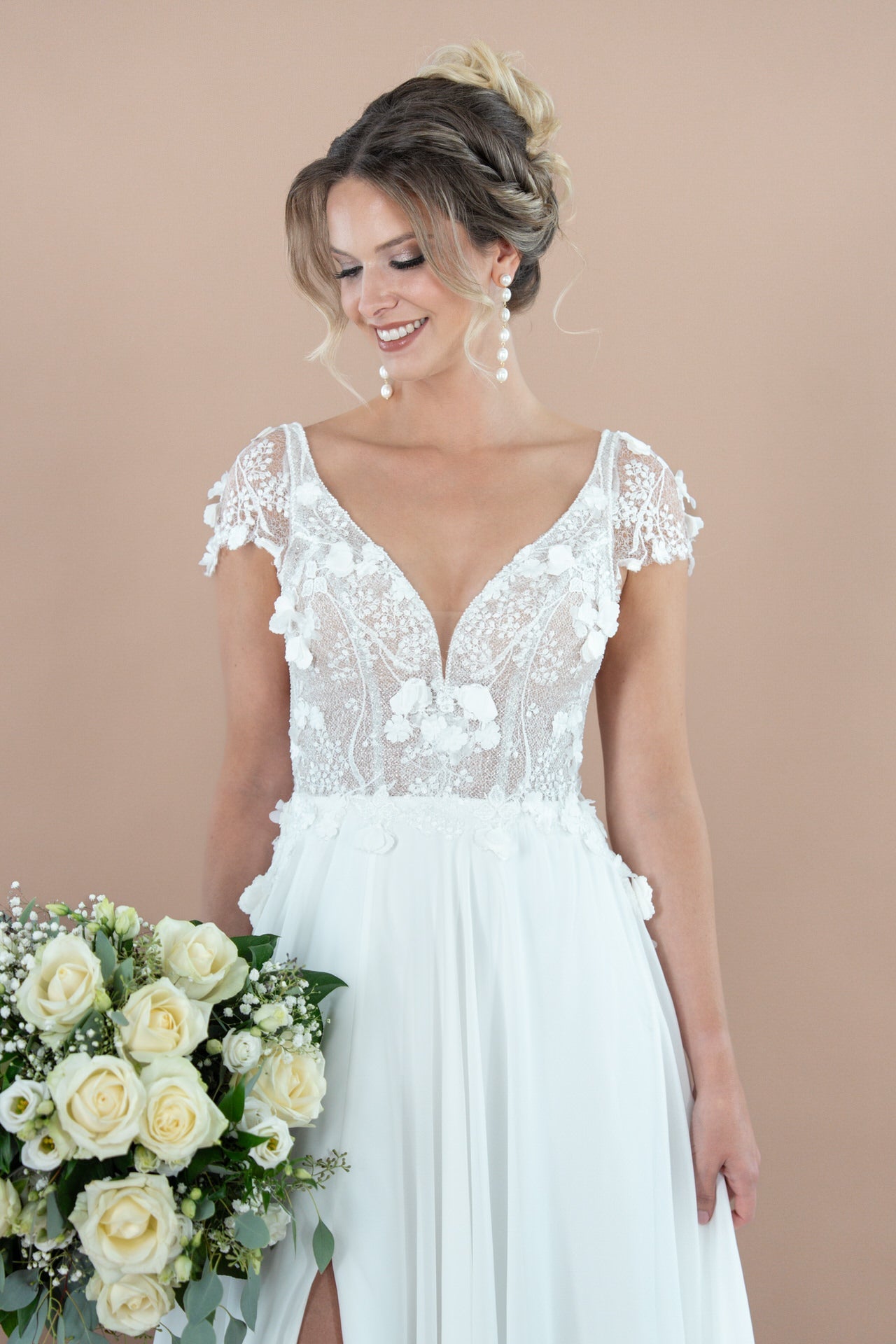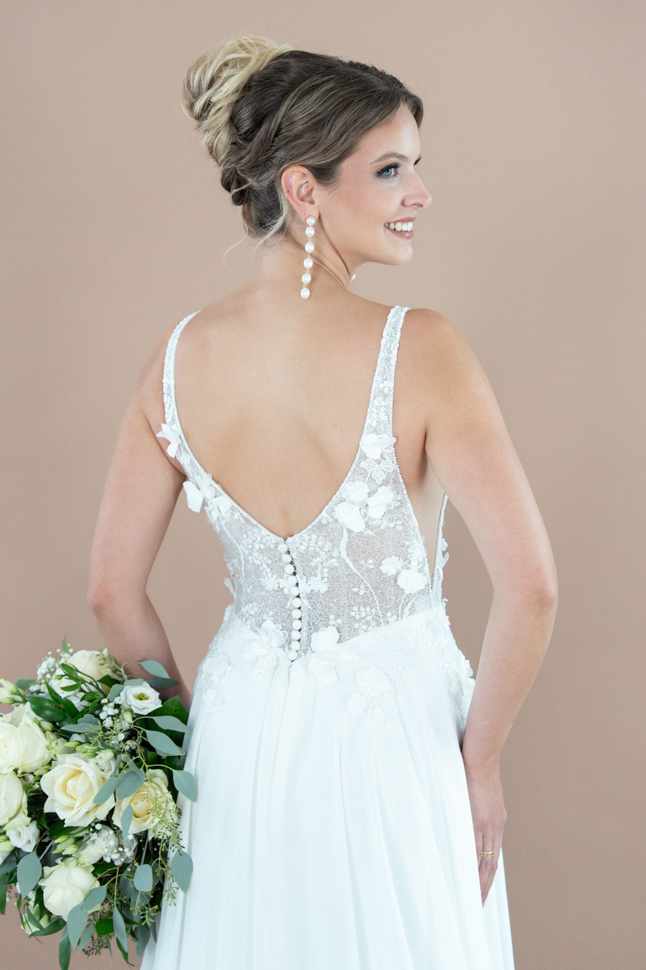 Dein Kleid ist aus zartem Chiffon gefertigt, der wie ein sanfter Schleier über deine Haut fließt und eine ätherische Leichtigkeit verströmt. Feine Spitze mit floralen Mustern umhüllt das Kleid mit einer natürlichen, romantischen Aura, die an blühende Sommergärten erinnert. Kunstvolle Bestickungen, mit größter Sorgfalt von Hand gestaltet, verzieren den Oberkörper und den Rock, während glitzernde Akzente das Licht einfangen und dem Kleid einen funkelnden Glanz verleihen. Die 3D-Elemente schaffen einen plastischen, modernen Effekt, der das Kleid lebendig und einzigartig macht.