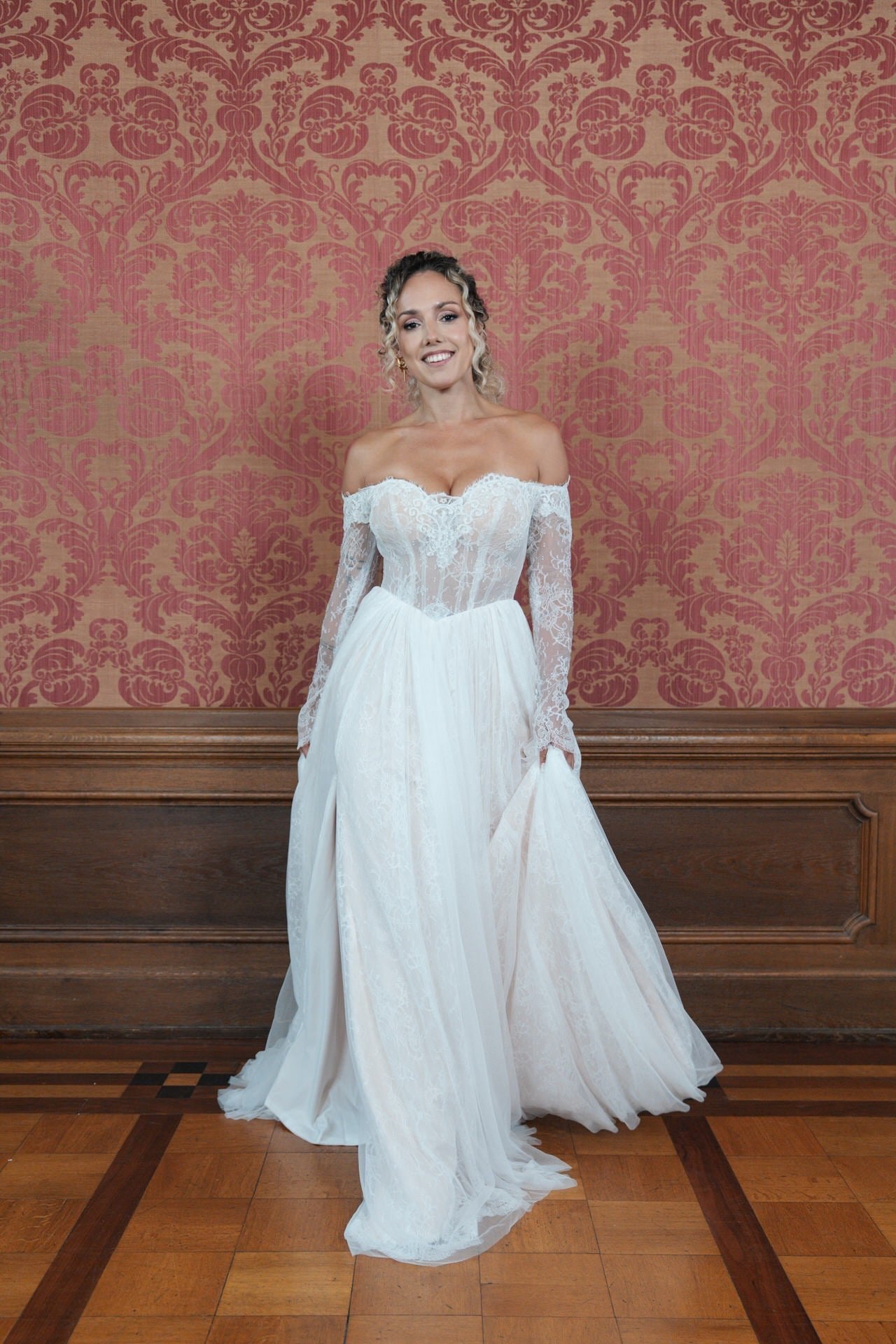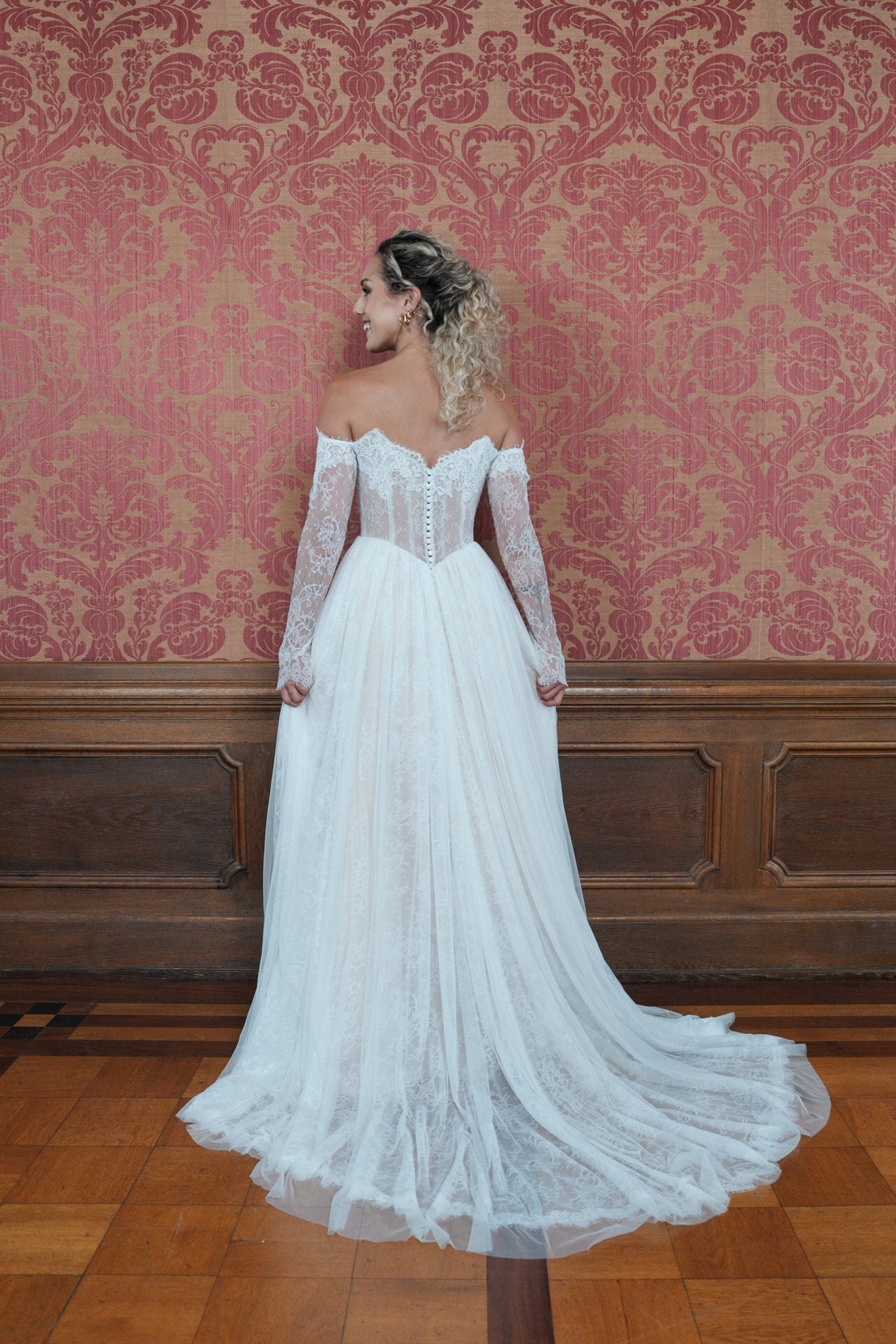 Das Bridonista R2L26-C-A18 (Chanti) verzaubert mit seinem A-Linien-Schnitt, der deine Silhouette sanft umarmt und in einen fließenden Rock mit mittellanger Schleppe übergeht – ideal für einen mühelosen, aber märchenhaften Auftritt. Der romantische Herzausschnitt betont dein Dekolleté mit einer zarten, femininen Note, während das Off-the-Shoulder-Design deine Schultern elegant freilegt. Die langen Ärmel aus feiner Spitze verleihen dem Kleid eine bohemianische Anmut, die den Vintage-Charme unterstreicht. Der V-Ausschnitt am Rücken fügt eine verführerische Note hinzu, die die romantische Ästhetik perfekt ergänzt, und die Knopfleiste sorgt für einen klassischen, raffinierten Abschluss.