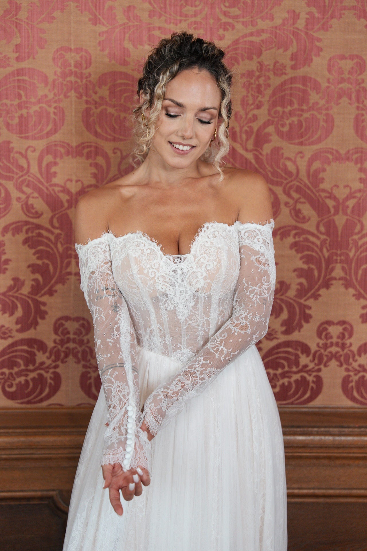 - Off-the-Shoulder-Design mit langen Ärmeln: Die freiliegenden Schultern und die langen Spitzenärmel verleihen deinem Kleid eine elegante, vintage-inspirierte Ausstrahlung.