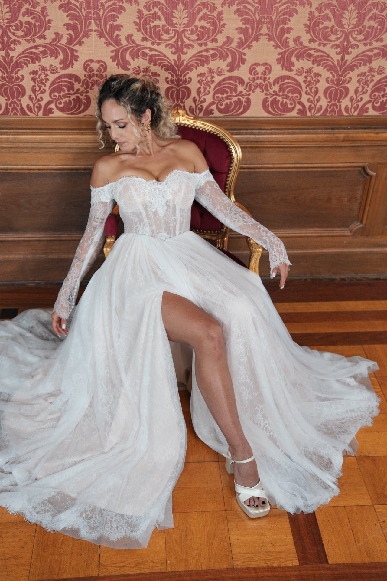 Stell dir vor, du gleitest in einem Kleid, das wie ein sanfter Hauch aus einer vergangenen Zeit durch einen verwunschenen Garten schwebt – das Bridonista R2L26-C-A18 (Chanti) macht diesen Traum lebendig! Dieses bezaubernde Hochzeitskleid vereint romantischen Boho-Vintage-Charme mit einem Hauch von Verführung und zarter Eleganz. Mit seinem fließenden A-Linien-Schnitt, filigraner Chantilly-Spitze und einem sinnlichen Lingerie-Look wirst du in diesem Kleid deinen Hochzeitstag in einem unvergesslichen Glanz erleben.