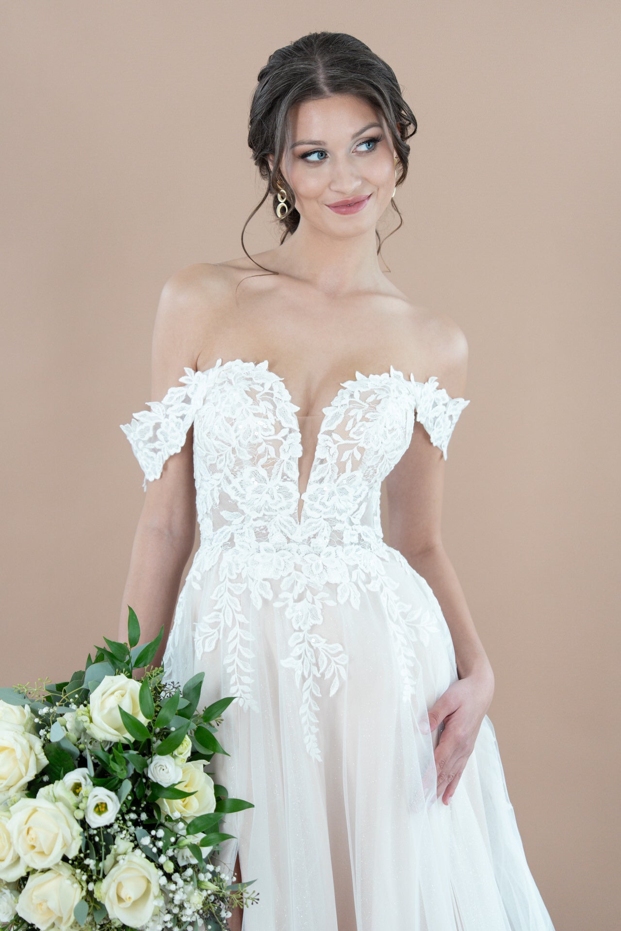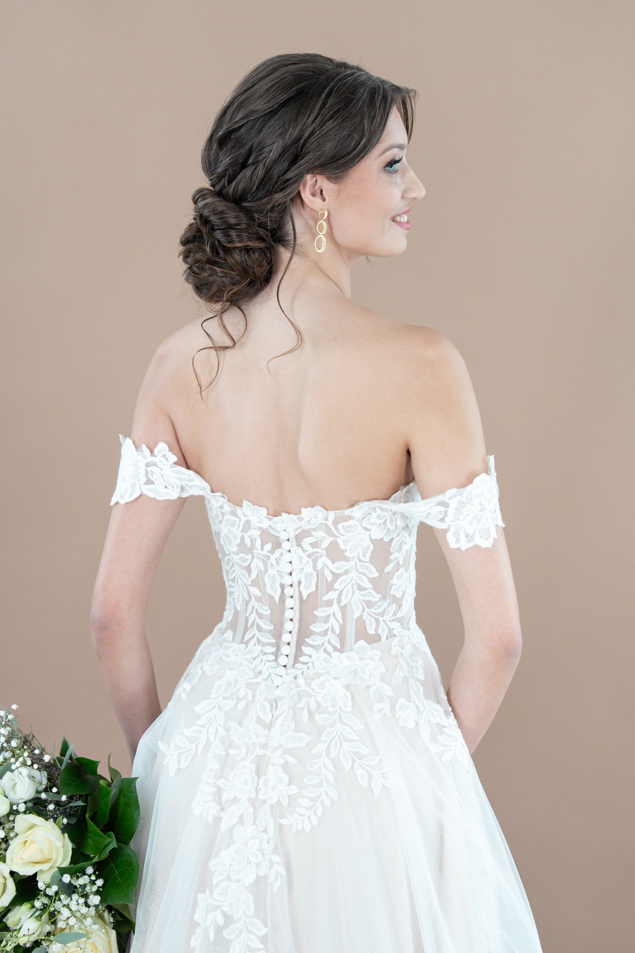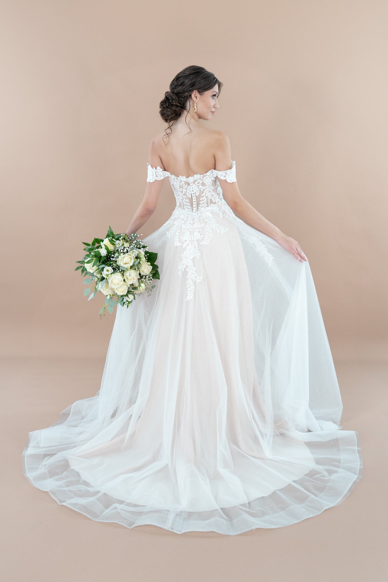 Das Bridonista R2L26-C-A21 fasziniert mit seinem A-Linien-Schnitt, der deine Silhouette sanft umspielt und in einen fließenden Rock mit mittellanger Schleppe übergeht – perfekt für einen mühelosen, doch zauberhaften Auftritt. Der Carmen-Ausschnitt, kombiniert mit einem zarten Herzausschnitt und einem eleganten V-Ausschnitt, umrahmt dein Dekolleté mit einer harmonischen Mischung aus Romantik und Verführung. Der gerade Rücken sorgt für eine klare, zeitlose Silhouette, die die meisterhafte Verarbeitung des Kleides unterstreicht. Ein subtiler Schlitz am Rock fügt eine moderne, verspielte Note hinzu, indem er deine Beine zart hervorblitzt, ohne die Eleganz zu beeinträchtigen.