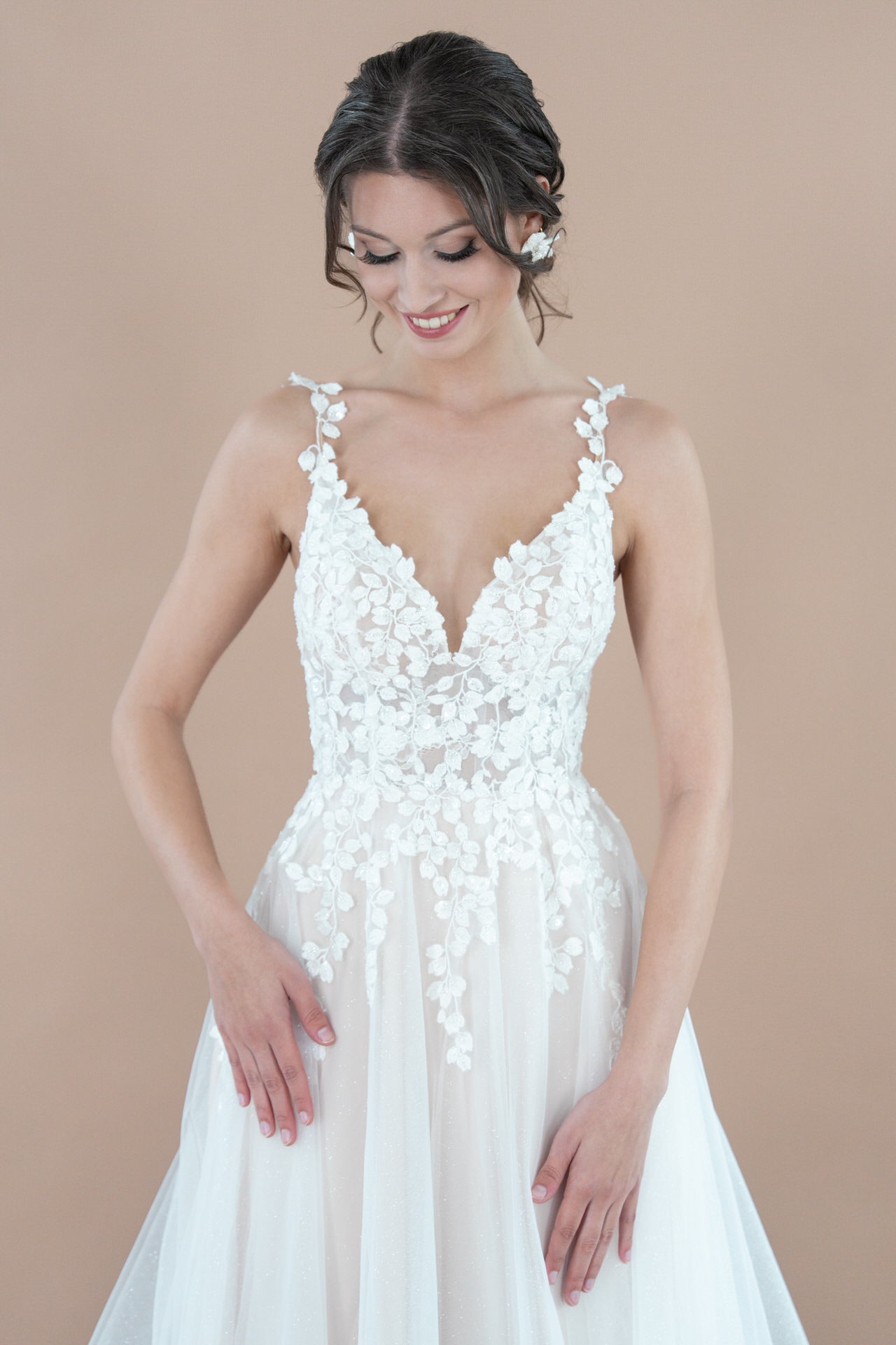 Träumst du von einem Hochzeitskleid, das romantische Eleganz mit floralem Charme und einem Hauch von Natürlichkeit vereint? Das Bridonista R2L26-C-A24 ist wie für dich gemacht! Dieses bezaubernde Kleid kombiniert einen eleganten A-Linien-Schnitt mit zarten Spitzen, luftigem Tüll und einem verführerischen Lingerie-Look. Mit seiner mittellangen Schleppe, filigranen Spaghetti-Trägern und ausdrucksstarken 3D-Elementen wirst du in diesem Kleid deinen großen Tag unvergesslich machen.