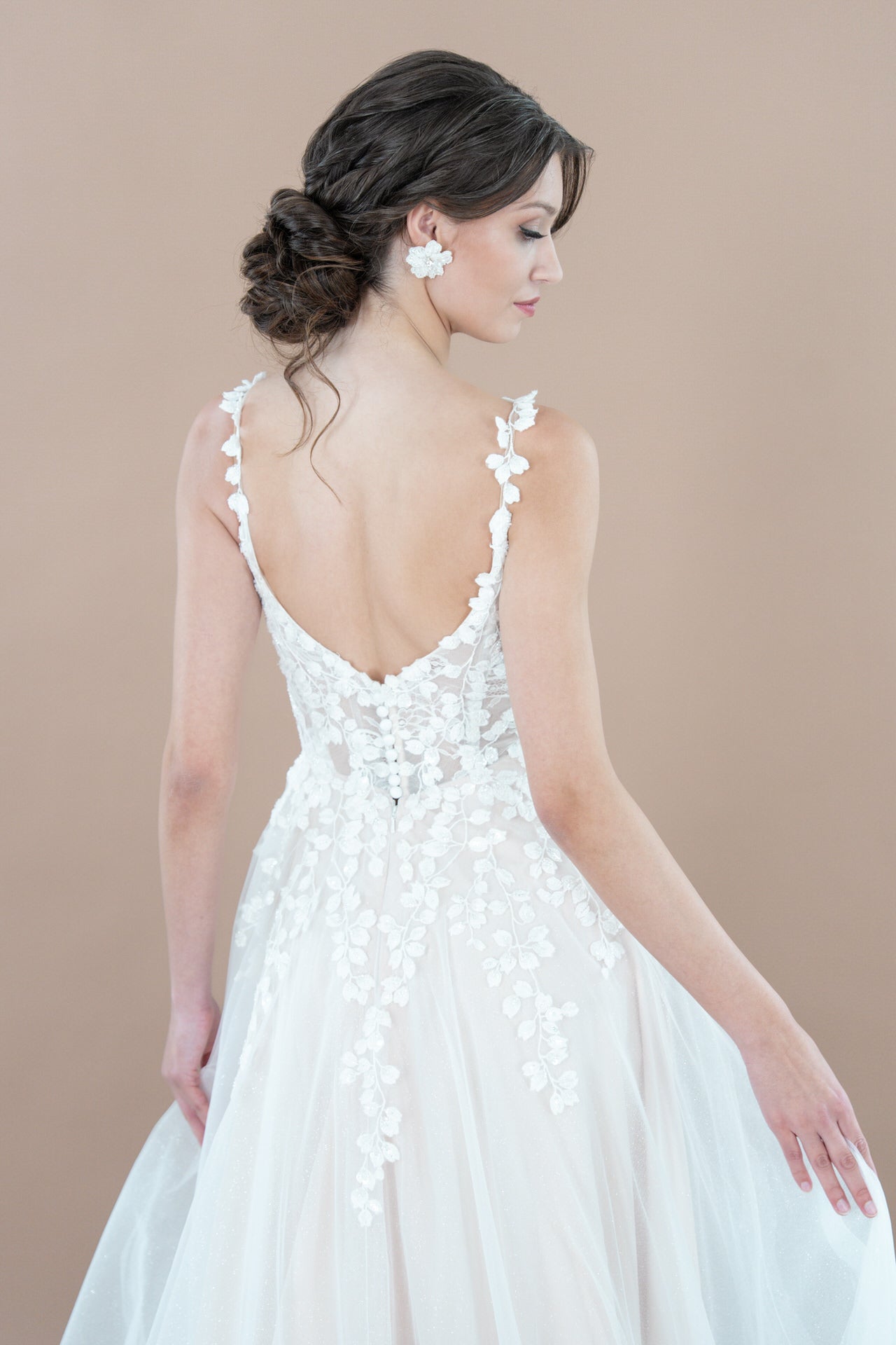 Gefertigt aus zartem Tüll, fühlt sich dein Kleid leicht und luftig an, während es eine romantische Präsenz schafft. Feine Spitze mit floralen Blätterspitzenmustern verleiht dem Kleid eine natürliche, romantische Ausstrahlung, die an einen blühenden Garten erinnert – ideal für eine Hochzeit im Grünen. Kunstvolle Bestickungen, mit Liebe zum Detail handgefertigt, verzieren den Oberkörper und den Rock, während die 3D-Elemente eine plastische, moderne Note hinzufügen, die deinem Kleid Tiefe und Charakter verleiht.