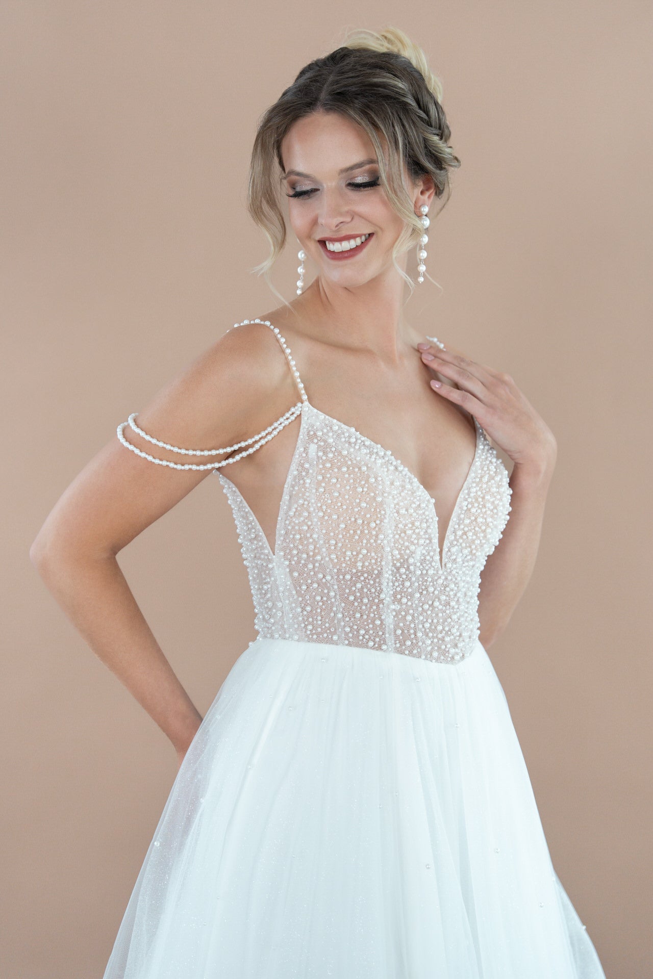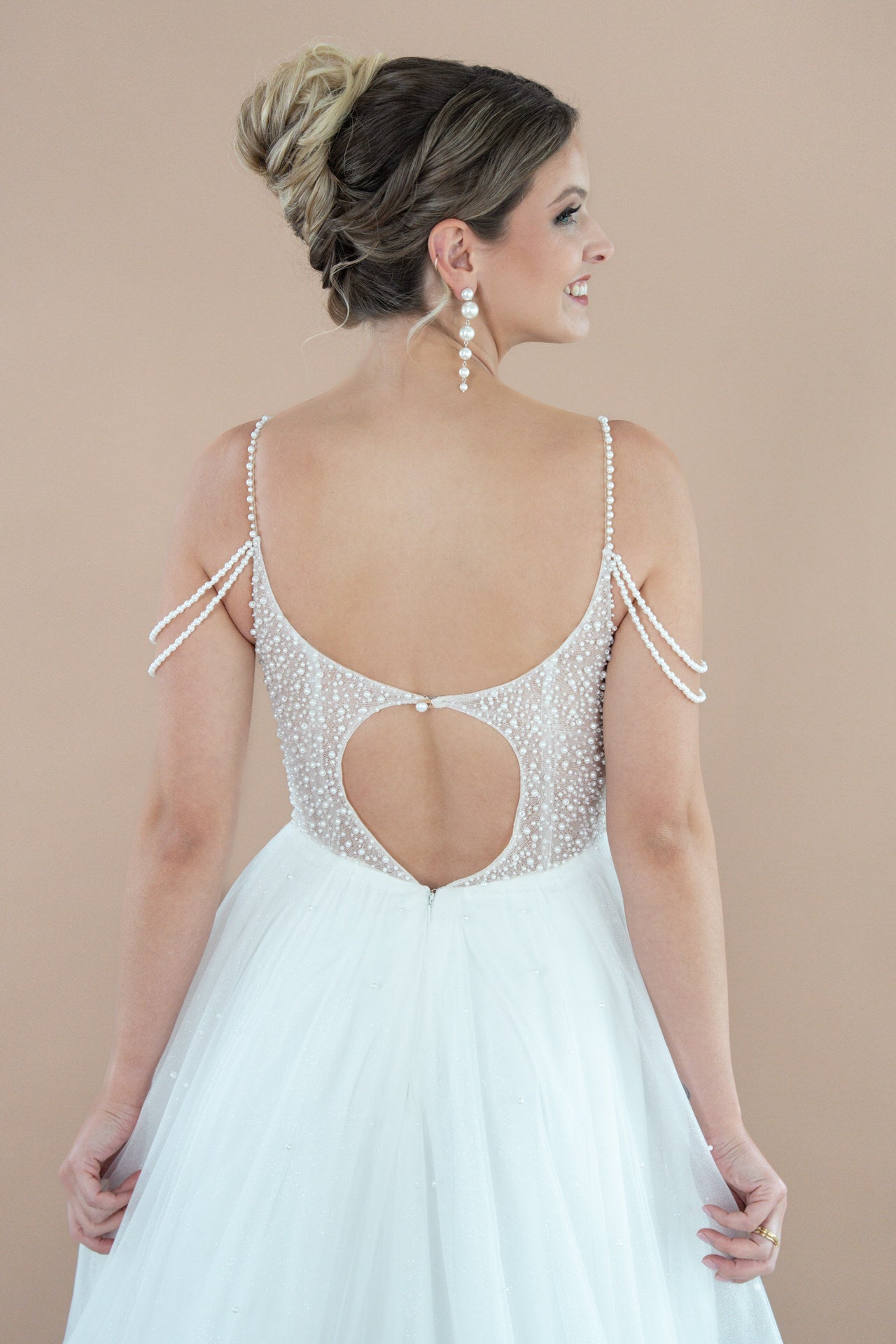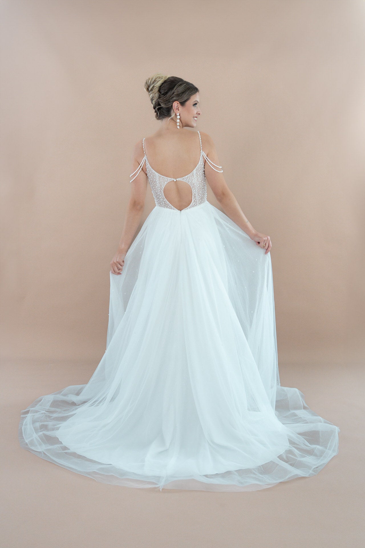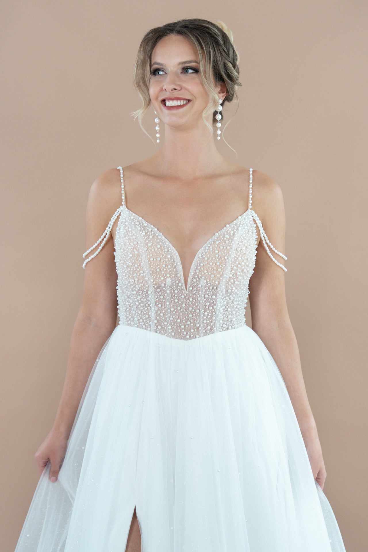 Dein Kleid ist aus luftigem Tüll gefertigt, der wie ein sanfter Schleier über deine Haut gleitet und eine romantische Leichtigkeit ausstrahlt. Zarte Perlenverzierungen, kunstvoll eingearbeitet, fangen das Licht ein und verleihen dem Kleid einen glamourösen Glanz, der bei jeder Bewegung schimmert. Feine Bestickungen, mit größter Sorgfalt gestaltet, verzieren den Oberkörper und den Rock, und fügen eine luxuriöse Tiefe hinzu, die das Kleid in ein echtes Kunstwerk verwandelt.